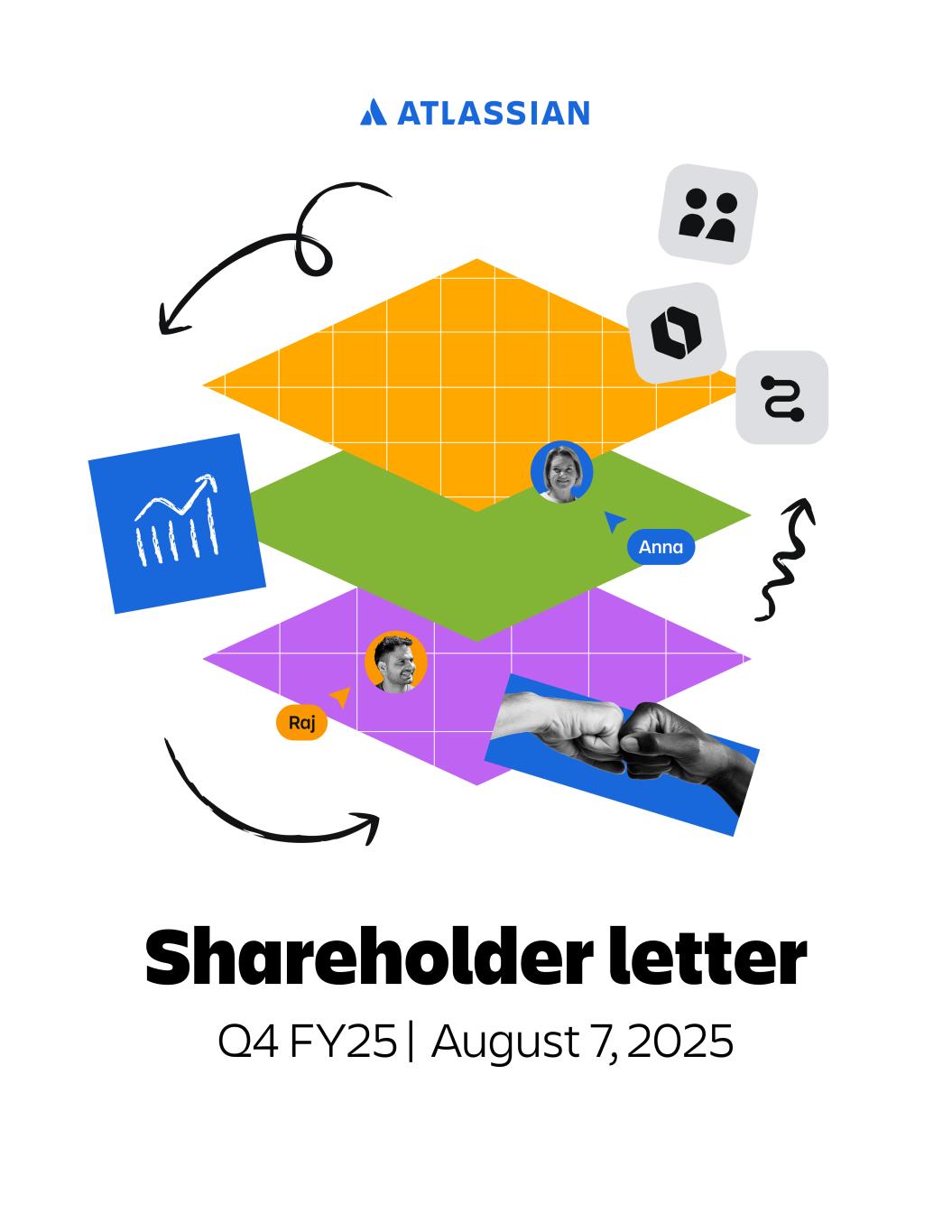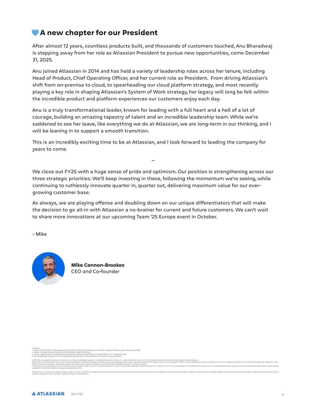Q4 FY25 A new chapter for our President After almost 12 years, countless products built, and thousands of customers touched, Anu Bharadwaj is stepping away from her role as Atlassian President to pursue new opportunities, come December 31, 2025. Anu joined Atlassian in 2014 and has held a variety of leadership roles across her tenure, including Head of Product, Chief Operating Officer, and her current role as President. From driving Atlassian’s shift from on-premise to cloud, to spearheading our cloud platform strategy, and most recently playing a key role in shaping Atlassian’s System of Work strategy, her legacy will long be felt within the incredible product and platform experiences our customers enjoy each day. Anu is a truly transformational leader, known for leading with a full heart and a hell of a lot of courage, building an amazing tapestry of talent and an incredible leadership team. While we’re saddened to see her leave, like everything we do at Atlassian, we are long-term in our thinking, and I will be leaning in to support a smooth transition. This is an incredibly exciting time to be at Atlassian, and I look forward to leading the company for years to come. — We close out FY25 with a huge sense of pride and optimism. Our position is strengthening across our three strategic priorities. We’ll keep investing in these, following the momentum we’re seeing, while continuing to ruthlessly innovate quarter in, quarter out, delivering maximum value for our ever- growing customer base. As always, we are playing offense and doubling down on our unique differentiators that will make the decision to go all-in with Atlassian a no-brainer for current and future customers. We can’t wait to share more innovations at our upcoming Team ’25 Europe event in October. - Mike 8 Mike Cannon-Brookes CEO and Co-founder Footnotes: 1- Gartner, Market Guide for Citizen Application Development Platforms, Sohail Majumdar, Kelli Smith, Oleksandr Matvitskyy, Jason Wong, 22 April 2025 2- Gartner, Innovation Guide for Generative AI Technologies, 7 May, 2025 Gartner 3- Gartner, Magic Quadrant for Marketing Work Management Platforms, Michael McCune, Lacretia Marsh, et al., 17 December 2024 4- IDC MarketScape: Worldwide IT Service Management Software 2024 Vendor Assessment (US51813224, December 2024) GARTNER is a registered trademark and service mark of Gartner and Magic Quadrant is a registered trademark of Gartner, Inc. and/or its affiliates in the U.S. and internationally and are used herein with permission. All rights reserved. Gartner does not endorse any vendor, product or service depicted in its research publications, and does not advise technology users to select only those vendors with the highest ratings or other designation. Gartner research publications consist of the opinions of G›artner’s research organization and should not be construed as statements of fact. Gartner disclaims all warranties, expressed or implied, with respect to this research, including any warranties of merchantability or fitness for a particular purpose. The Gartner content described herein (the “Gartner Content”) represents research opinion or viewpoints published, as part of a syndicated subscription service, by Gartner, Inc. ("Gartner"), and is not a representation of fact. Gartner Content speaks as of its original publication date (and not as of the date of this Shareholder Letter), and the opinions expressed in the Gartner Content are subject to change without notice. Forrester does not endorse any company, product, brand, or service included in its research publications and does not advise any person to select the products or services of any company or brand based on the ratings included in such publications. Information is based on the best available resources. Opinions reflect judgment at the time and are subject to change. For more information, read about Forrester’s objectivity here.