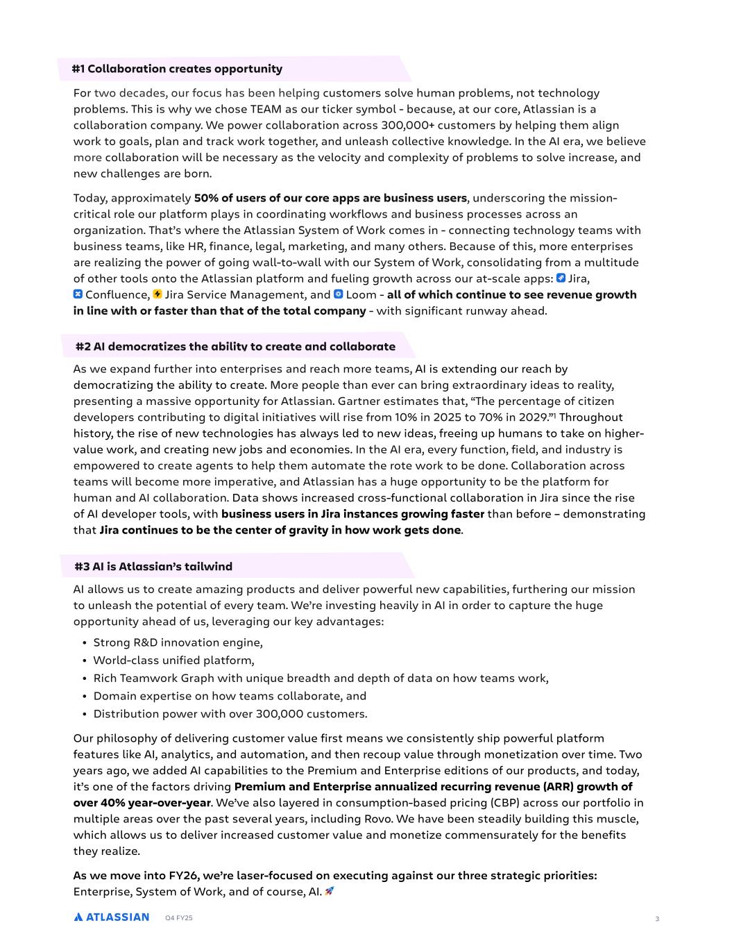 Q4 FY25 3 As we expand further into enterprises and reach more teams, AI is extending our reach by democratizing the ability to create. More people than ever can bring extraordinary ideas to reality, presenting a massive opportunity for Atlassian. Gartner estimates that, “The percentage of citizen developers contributing to digital initiatives will rise from 10% in 2025 to 70% in 2029.”1 Throughout history, the rise of new technologies has always led to new ideas, freeing up humans to take on higher- value work, and creating new jobs and economies. In the AI era, every function, field, and industry is empowered to create agents to help them automate the rote work to be done. Collaboration across teams will become more imperative, and Atlassian has a huge opportunity to be the platform for human and AI collaboration. Data shows increased cross-functional collaboration in Jira since the rise of AI developer tools, with business users in Jira instances growing faster than before – demonstrating that Jira continues to be the center of gravity in how work gets done. #2 AI democratizes the ability to create and collaborate AI allows us to create amazing products and deliver powerful new capabilities, furthering our mission to unleash the potential of every team. We’re investing heavily in AI in order to capture the huge opportunity ahead of us, leveraging our key advantages: • Strong R&D innovation engine, • World-class unified platform, • Rich Teamwork Graph with unique breadth and depth of data on how teams work, • Domain expertise on how teams collaborate, and • Distribution power with over 300,000 customers. Our philosophy of delivering customer value first means we consistently ship powerful platform features like AI, analytics, and automation, and then recoup value through monetization over time. Two years ago, we added AI capabilities to the Premium and Enterprise editions of our products, and today, it’s one of the factors driving Premium and Enterprise annualized recurring revenue (ARR) growth of over 40% year-over-year. We’ve also layered in consumption-based pricing (CBP) across our portfolio in multiple areas over the past several years, including Rovo. We have been steadily building this muscle, which allows us to deliver increased customer value and monetize commensurately for the benefits they realize. As we move into FY26, we’re laser-focused on executing against our three strategic priorities: Enterprise, System of Work, and of course, AI. #3 AI is Atlassian’s tailwind For two decades, our focus has been helping customers solve human problems, not technology problems. This is why we chose TEAM as our ticker symbol - because, at our core, Atlassian is a collaboration company. We power collaboration across 300,000+ customers by helping them align work to goals, plan and track work together, and unleash collective knowledge. In the AI era, we believe more collaboration will be necessary as the velocity and complexity of problems to solve increase, and new challenges are born. Today, approximately 50% of users of our core apps are business users, underscoring the mission- critical role our platform plays in coordinating workflows and business processes across an organization. That’s where the Atlassian System of Work comes in - connecting technology teams with business teams, like HR, finance, legal, marketing, and many others. Because of this, more enterprises are realizing the power of going wall-to-wall with our System of Work, consolidating from a multitude of other tools onto the Atlassian platform and fueling growth across our at-scale apps: Jira, Confluence, Jira Service Management, and Loom - all of which continue to see revenue growth in line with or faster than that of the total company - with significant runway ahead. #1 Collaboration creates opportunity