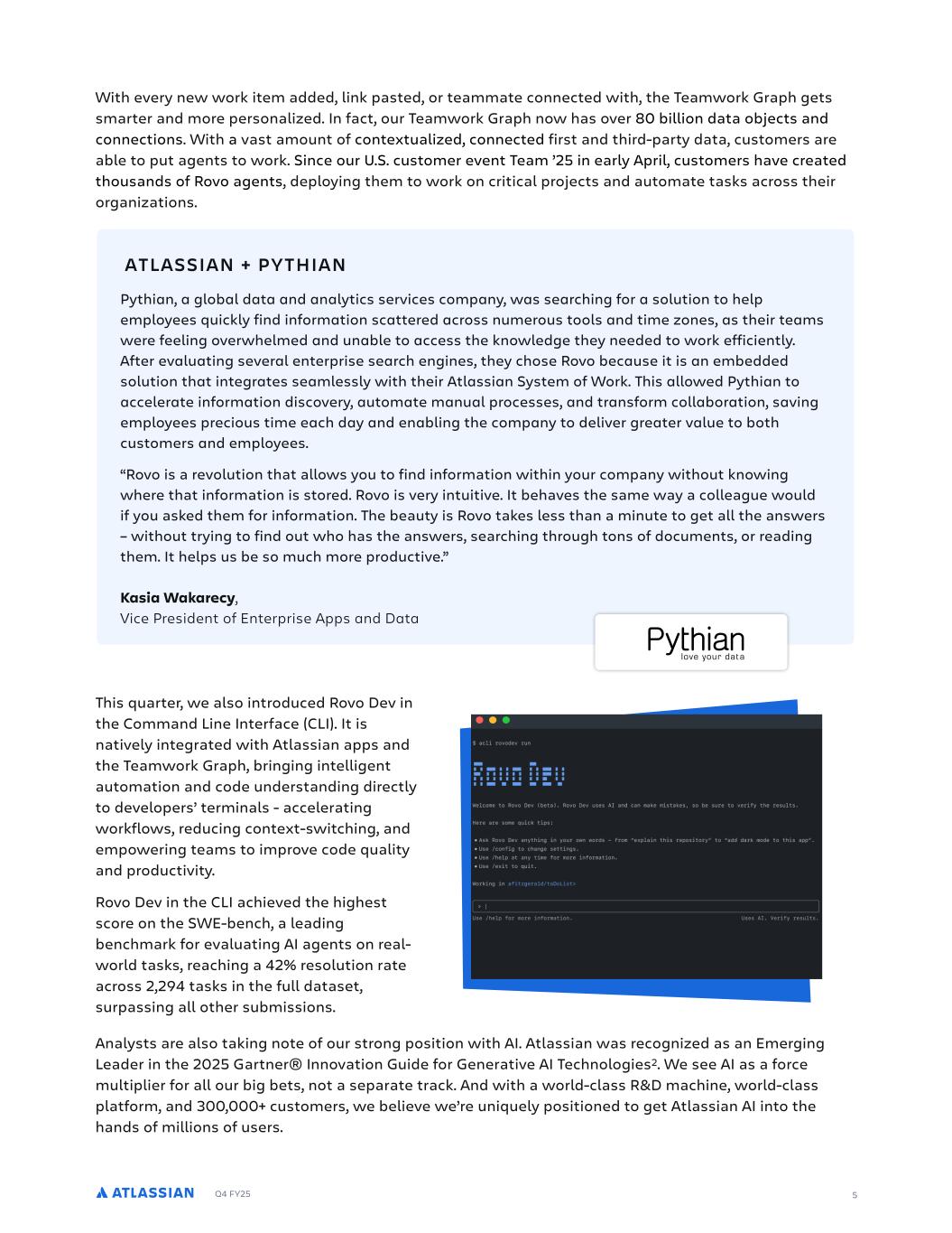 Q4 FY25 5 Analysts are also taking note of our strong position with AI. Atlassian was recognized as an Emerging Leader in the 2025 Gartner® Innovation Guide for Generative AI Technologies2. We see AI as a force multiplier for all our big bets, not a separate track. And with a world-class R&D machine, world-class platform, and 300,000+ customers, we believe we’re uniquely positioned to get Atlassian AI into the hands of millions of users. This quarter, we also introduced Rovo Dev in the Command Line Interface (CLI). It is natively integrated with Atlassian apps and the Teamwork Graph, bringing intelligent automation and code understanding directly to developers’ terminals - accelerating workflows, reducing context-switching, and empowering teams to improve code quality and productivity. Rovo Dev in the CLI achieved the highest score on the SWE-bench, a leading benchmark for evaluating AI agents on real- world tasks, reaching a 42% resolution rate across 2,294 tasks in the full dataset, surpassing all other submissions. Pythian, a global data and analytics services company, was searching for a solution to help employees quickly find information scattered across numerous tools and time zones, as their teams were feeling overwhelmed and unable to access the knowledge they needed to work efficiently. After evaluating several enterprise search engines, they chose Rovo because it is an embedded solution that integrates seamlessly with their Atlassian System of Work. This allowed Pythian to accelerate information discovery, automate manual processes, and transform collaboration, saving employees precious time each day and enabling the company to deliver greater value to both customers and employees. “Rovo is a revolution that allows you to find information within your company without knowing where that information is stored. Rovo is very intuitive. It behaves the same way a colleague would if you asked them for information. The beauty is Rovo takes less than a minute to get all the answers – without trying to find out who has the answers, searching through tons of documents, or reading them. It helps us be so much more productive.” Kasia Wakarecy, Vice President of Enterprise Apps and Data ATLASSIAN + PYTHIAN With every new work item added, link pasted, or teammate connected with, the Teamwork Graph gets smarter and more personalized. In fact, our Teamwork Graph now has over 80 billion data objects and connections. With a vast amount of contextualized, connected first and third-party data, customers are able to put agents to work. Since our U.S. customer event Team ’25 in early April, customers have created thousands of Rovo agents, deploying them to work on critical projects and automate tasks across their organizations.