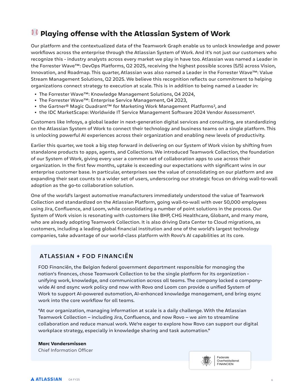 Q4 FY25 6 Customers like Infosys, a global leader in next-generation digital services and consulting, are standardizing on the Atlassian System of Work to connect their technology and business teams on a single platform. This is unlocking powerful AI experiences across their organization and enabling new levels of productivity. Earlier this quarter, we took a big step forward in delivering on our System of Work vision by shifting from standalone products to apps, agents, and Collections. We introduced Teamwork Collection, the foundation of our System of Work, giving every user a common set of collaboration apps to use across their organization. In the first few months, uptake is exceeding our expectations with significant wins in our enterprise customer base. In particular, enterprises see the value of consolidating on our platform and are expanding their seat counts to a wider set of users, underscoring our strategic focus on driving wall-to-wall adoption as the go-to collaboration solution. One of the world’s largest automotive manufacturers immediately understood the value of Teamwork Collection and standardized on the Atlassian Platform, going wall-to-wall with over 50,000 employees using Jira, Confluence, and Loom, while consolidating a number of point solutions in the process. Our System of Work vision is resonating with customers like BHP, CHG Healthcare, Globant, and many more, who are already adopting Teamwork Collection. It is also driving Data Center to Cloud migrations, as customers, including a leading global financial institution and one of the world’s largest technology companies, take advantage of our world-class platform with Rovo’s AI capabilities at its core. FOD Financiën, the Belgian federal government department responsible for managing the nation's finances, chose Teamwork Collection to be the single platform for its organization - unifying work, knowledge, and communication across all teams. The company lacked a company- wide AI and async work policy and now with Rovo and Loom can provide a unified System of Work to support AI-powered automation, AI-enhanced knowledge management, and bring async work into the core workflow for all teams. “At our organization, managing information at scale is a daily challenge. With the Atlassian Teamwork Collection — including Jira, Confluence, and now Rovo — we aim to streamline collaboration and reduce manual work. We’re eager to explore how Rovo can support our digital workplace strategy, especially in knowledge sharing and task automation.” Marc Vandersmissen Chief Information Officer ATLASSIAN + FOD FINANCIËN Playing offense with the Atlassian System of Work Our platform and the contextualized data of the Teamwork Graph enable us to unlock knowledge and power workflows across the enterprise through the Atlassian System of Work. And it’s not just our customers who recognize this - industry analysts across every market we play in have too. Atlassian was named a Leader in the Forrester Wave™: DevOps Platforms, Q2 2025, receiving the highest possible scores (5/5) across Vision, Innovation, and Roadmap. This quarter, Atlassian was also named a Leader in the Forrester Wave™: Value Stream Management Solutions, Q2 2025. We believe this recognition reflects our commitment to helping organizations connect strategy to execution at scale. This is in addition to being named a Leader in: • The Forrester Wave™: Knowledge Management Solutions, Q4 2024, • The Forrester Wave™: Enterprise Service Management, Q4 2023, • the Gartner® Magic Quadrant™ for Marketing Work Management Platforms3, and • the IDC MarketScape: Worldwide IT Service Management Software 2024 Vendor Assessment4.