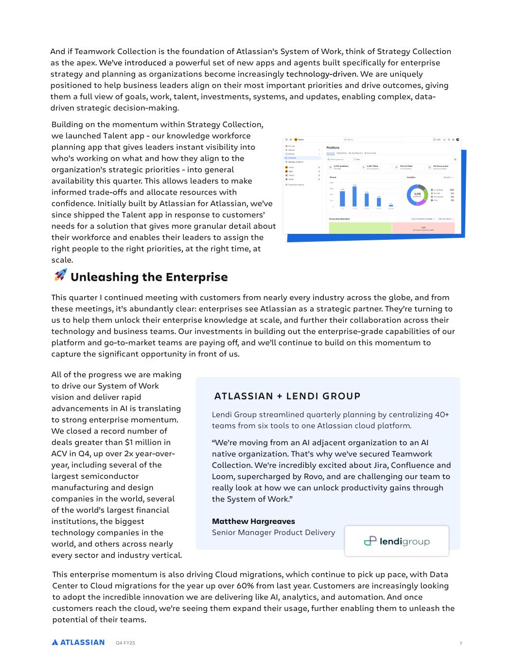 Q4 FY25 7 Unleashing the Enterprise This quarter I continued meeting with customers from nearly every industry across the globe, and from these meetings, it’s abundantly clear: enterprises see Atlassian as a strategic partner. They’re turning to us to help them unlock their enterprise knowledge at scale, and further their collaboration across their technology and business teams. Our investments in building out the enterprise-grade capabilities of our platform and go-to-market teams are paying off, and we’ll continue to build on this momentum to capture the significant opportunity in front of us. Lendi Group streamlined quarterly planning by centralizing 40+ teams from six tools to one Atlassian cloud platform. “We're moving from an AI adjacent organization to an AI native organization. That's why we've secured Teamwork Collection. We're incredibly excited about Jira, Confluence and Loom, supercharged by Rovo, and are challenging our team to really look at how we can unlock productivity gains through the System of Work.” Matthew Hargreaves Senior Manager Product Delivery ATLASSIAN + LENDI GROUP This enterprise momentum is also driving Cloud migrations, which continue to pick up pace, with Data Center to Cloud migrations for the year up over 60% from last year. Customers are increasingly looking to adopt the incredible innovation we are delivering like AI, analytics, and automation. And once customers reach the cloud, we’re seeing them expand their usage, further enabling them to unleash the potential of their teams. And if Teamwork Collection is the foundation of Atlassian’s System of Work, think of Strategy Collection as the apex. We’ve introduced a powerful set of new apps and agents built specifically for enterprise strategy and planning as organizations become increasingly technology-driven. We are uniquely positioned to help business leaders align on their most important priorities and drive outcomes, giving them a full view of goals, work, talent, investments, systems, and updates, enabling complex, data- driven strategic decision-making. All of the progress we are making to drive our System of Work vision and deliver rapid advancements in AI is translating to strong enterprise momentum. We closed a record number of deals greater than $1 million in ACV in Q4, up over 2x year-over- year, including several of the largest semiconductor manufacturing and design companies in the world, several of the world’s largest financial institutions, the biggest technology companies in the world, and others across nearly every sector and industry vertical. Building on the momentum within Strategy Collection, we launched Talent app - our knowledge workforce planning app that gives leaders instant visibility into who’s working on what and how they align to the organization’s strategic priorities - into general availability this quarter. This allows leaders to make informed trade-offs and allocate resources with confidence. Initially built by Atlassian for Atlassian, we’ve since shipped the Talent app in response to customers’ needs for a solution that gives more granular detail about their workforce and enables their leaders to assign the right people to the right priorities, at the right time, at scale.