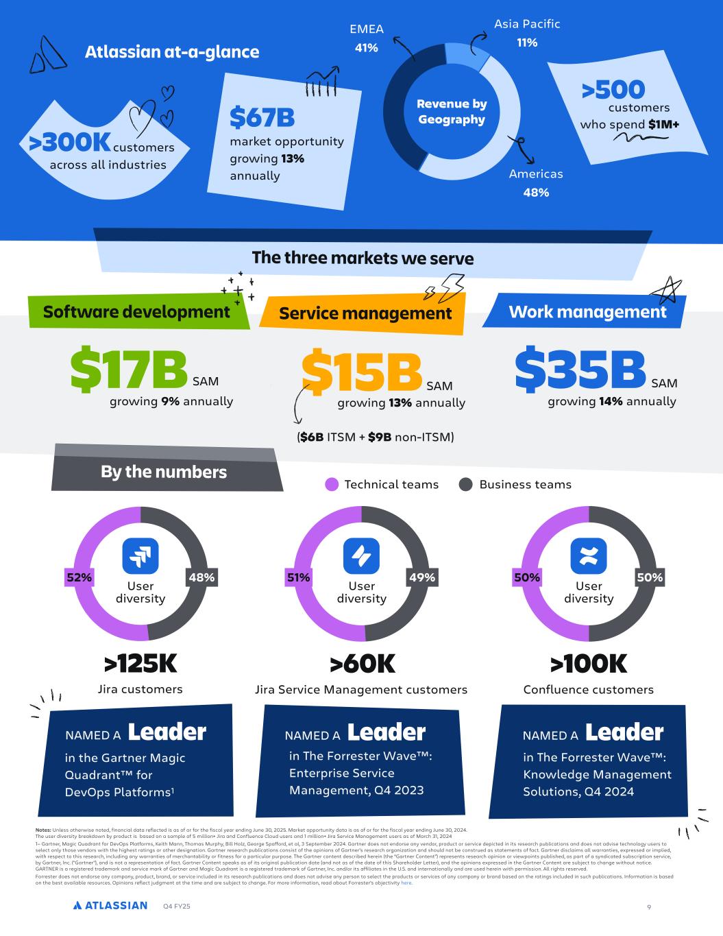 Q4 FY25 9 Confluence customers >100K Jira Service Management customers >60K in the Gartner Magic Quadrant™ for DevOps Platforms1 LeaderNAMED A in The Forrester Wave™: Enterprise Service Management, Q4 2023 LeaderNAMED A 52% 48% Jira customers >125K Technical teams Business teams 51% 49% 50% 50% Atlassian at-a-glance The three markets we serve $67B market opportunity growing 13% annually across all industries >300Kcustomers >500 customers who spend $1M+ Americas 48% EMEA 41% Asia Pacific 11% Revenue by Geography Notes: Unless otherwise noted, financial data reflected is as of or for the fiscal year ending June 30, 2025. Market opportunity data is as of or for the fiscal year ending June 30, 2024. The user diversity breakdown by product is based on a sample of 5 million+ Jira and Confluence Cloud users and 1 million+ Jira Service Management users as of March 31, 2024 1— Gartner, Magic Quadrant for DevOps Platforms, Keith Mann, Thomas Murphy, Bill Holz, George Spafford, et al, 3 September 2024. Gartner does not endorse any vendor, product or service depicted in its research publications and does not advise technology users to select only those vendors with the highest ratings or other designation. Gartner research publications consist of the opinions of Gartner’s research organization and should not be construed as statements of fact. Gartner disclaims all warranties, expressed or implied, with respect to this research, including any warranties of merchantability or fitness for a particular purpose. The Gartner content described herein (the “Gartner Content”) represents research opinion or viewpoints published, as part of a syndicated subscription service, by Gartner, Inc. ("Gartner"), and is not a representation of fact. Gartner Content speaks as of its original publication date (and not as of the date of this Shareholder Letter), and the opinions expressed in the Gartner Content are subject to change without notice. GARTNER is a registered trademark and service mark of Gartner and Magic Quadrant is a registered trademark of Gartner, Inc. and/or its affiliates in the U.S. and internationally and are used herein with permission. All rights reserved. Forrester does not endorse any company, product, brand, or service included in its research publications and does not advise any person to select the products or services of any company or brand based on the ratings included in such publications. Information is based on the best available resources. Opinions reflect judgment at the time and are subject to change. For more information, read about Forrester’s objectivity here . User diversity User diversity User diversity Software development growing 9% annually $17B SAM Work management growing 14% annually $35B SAM Service management growing 13% annually $15B SAM ($6B ITSM + $9B non-ITSM) By the numbers in The Forrester Wave™: Knowledge Management Solutions, Q4 2024 LeaderNAMED A