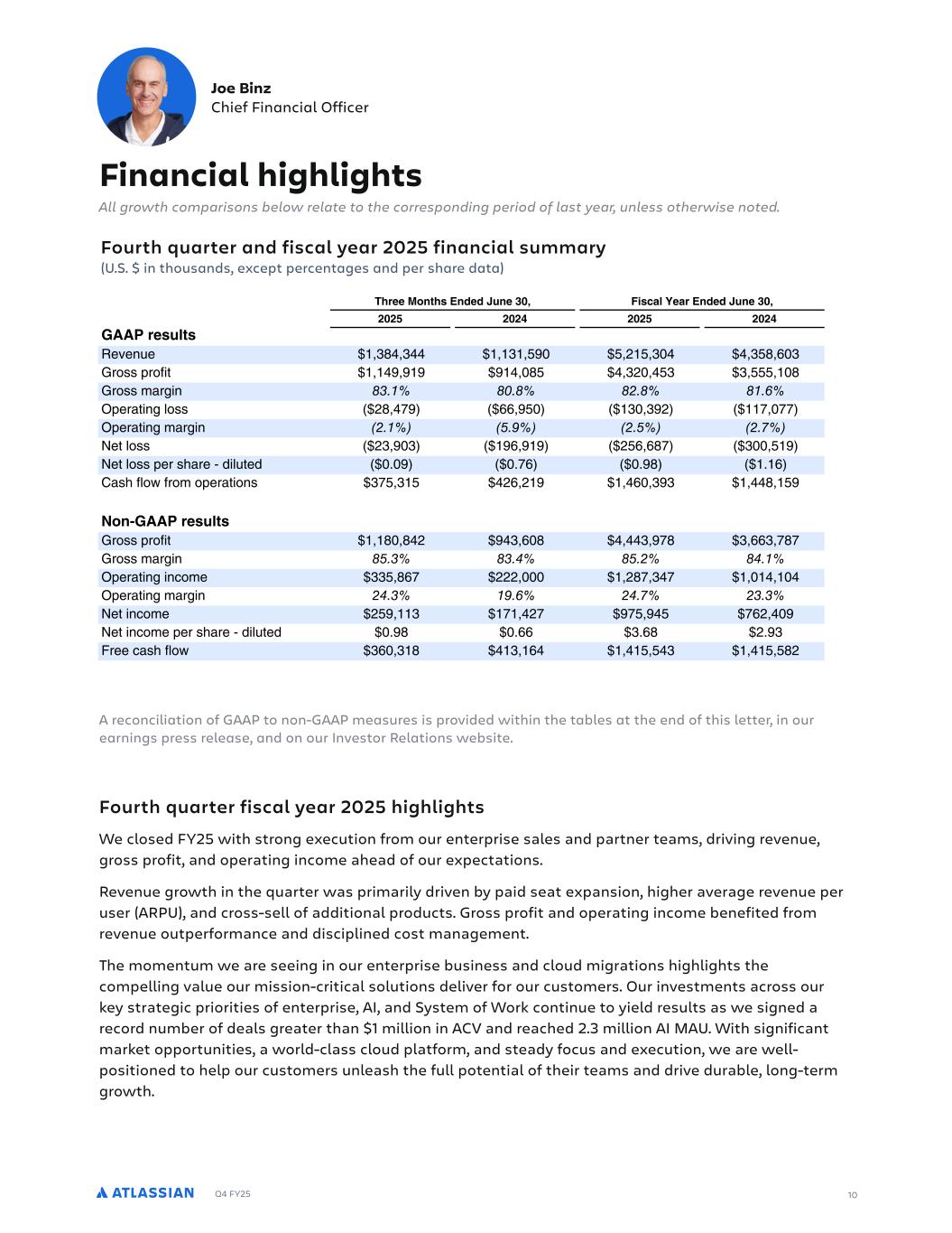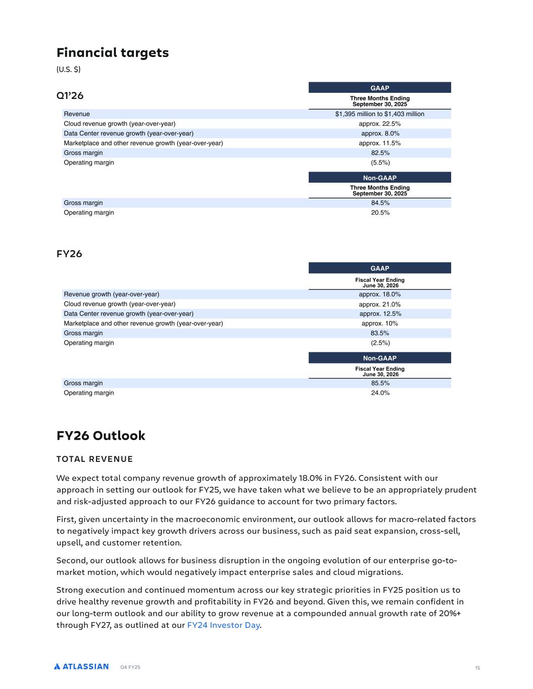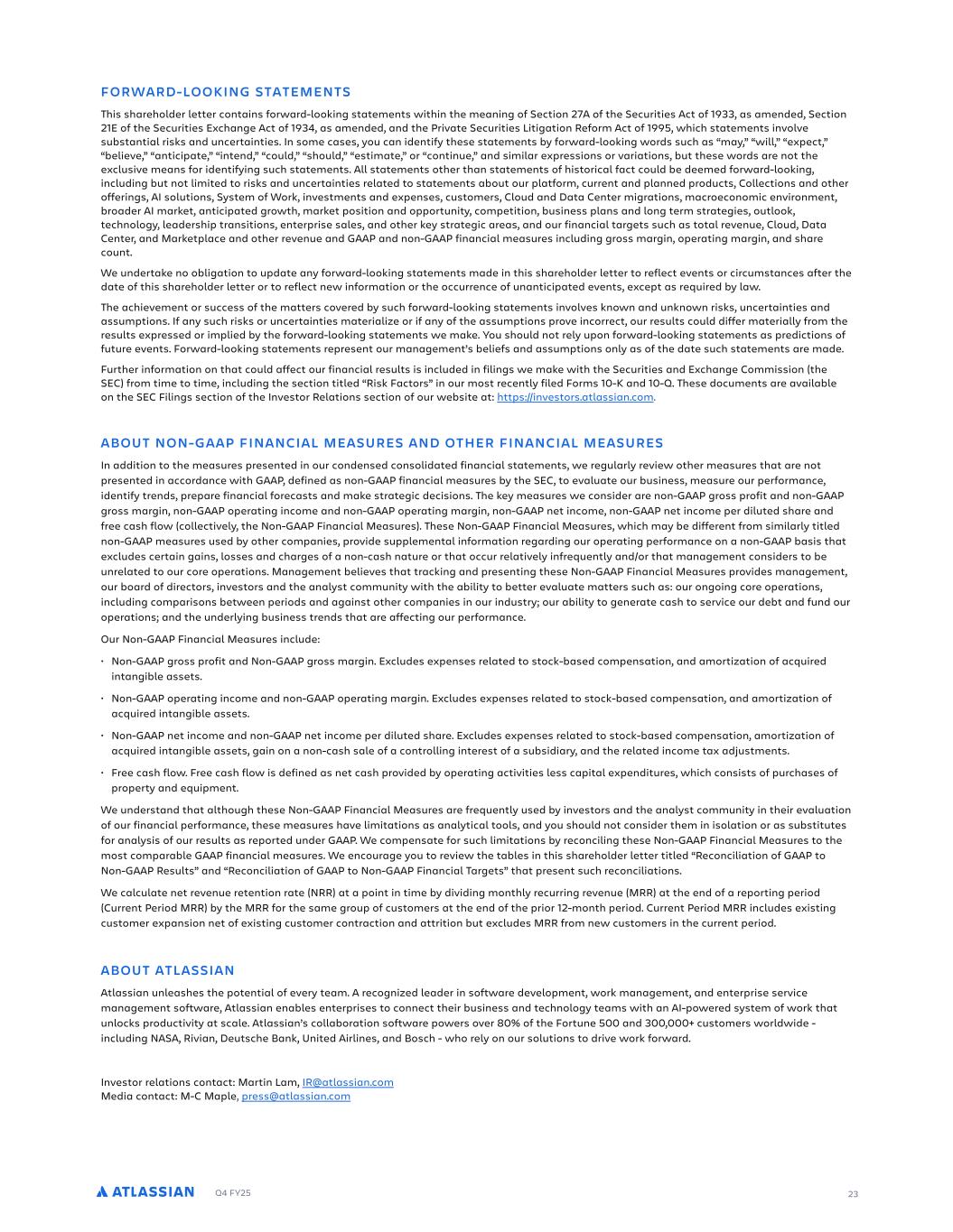 Q4 FY25 23 FORWARD-LOOKING STATEMENTS This shareholder letter contains forward-looking statements within the meaning of Section 27A of the Securities Act of 1933, as amended, Section 21E of the Securities Exchange Act of 1934, as amended, and the Private Securities Litigation Reform Act of 1995, which statements involve substantial risks and uncertainties. In some cases, you can identify these statements by forward-looking words such as “may,” “will,” “expect,” “believe,” “anticipate,” “intend,” “could,” “should,” “estimate,” or “continue,” and similar expressions or variations, but these words are not the exclusive means for identifying such statements. All statements other than statements of historical fact could be deemed forward-looking, including but not limited to risks and uncertainties related to statements about our platform, current and planned products, Collections and other offerings, AI solutions, System of Work, investments and expenses, customers, Cloud and Data Center migrations, macroeconomic environment, broader AI market, anticipated growth, market position and opportunity, competition, business plans and long term strategies, outlook, technology, leadership transitions, enterprise sales, and other key strategic areas, and our financial targets such as total revenue, Cloud, Data Center, and Marketplace and other revenue and GAAP and non-GAAP financial measures including gross margin, operating margin, and share count. We undertake no obligation to update any forward-looking statements made in this shareholder letter to reflect events or circumstances after the date of this shareholder letter or to reflect new information or the occurrence of unanticipated events, except as required by law. The achievement or success of the matters covered by such forward-looking statements involves known and unknown risks, uncertainties and assumptions. If any such risks or uncertainties materialize or if any of the assumptions prove incorrect, our results could differ materially from the results expressed or implied by the forward-looking statements we make. You should not rely upon forward-looking statements as predictions of future events. Forward-looking statements represent our management’s beliefs and assumptions only as of the date such statements are made. Further information on that could affect our financial results is included in filings we make with the Securities and Exchange Commission (the SEC) from time to time, including the section titled “Risk Factors” in our most recently filed Forms 10-K and 10-Q. These documents are available on the SEC Filings section of the Investor Relations section of our website at: https://investors.atlassian.com. ABOUT NON-GAAP FINANCIAL MEASURES AND OTHER FINANCIAL MEASURES In addition to the measures presented in our condensed consolidated financial statements, we regularly review other measures that are not presented in accordance with GAAP, defined as non-GAAP financial measures by the SEC, to evaluate our business, measure our performance, identify trends, prepare financial forecasts and make strategic decisions. The key measures we consider are non-GAAP gross profit and non-GAAP gross margin, non-GAAP operating income and non-GAAP operating margin, non-GAAP net income, non-GAAP net income per diluted share and free cash flow (collectively, the Non-GAAP Financial Measures). These Non-GAAP Financial Measures, which may be different from similarly titled non-GAAP measures used by other companies, provide supplemental information regarding our operating performance on a non-GAAP basis that excludes certain gains, losses and charges of a non-cash nature or that occur relatively infrequently and/or that management considers to be unrelated to our core operations. Management believes that tracking and presenting these Non-GAAP Financial Measures provides management, our board of directors, investors and the analyst community with the ability to better evaluate matters such as: our ongoing core operations, including comparisons between periods and against other companies in our industry; our ability to generate cash to service our debt and fund our operations; and the underlying business trends that are affecting our performance. Our Non-GAAP Financial Measures include: • Non-GAAP gross profit and Non-GAAP gross margin. Excludes expenses related to stock-based compensation, and amortization of acquired intangible assets. • Non-GAAP operating income and non-GAAP operating margin. Excludes expenses related to stock-based compensation, and amortization of acquired intangible assets. • Non-GAAP net income and non-GAAP net income per diluted share. Excludes expenses related to stock-based compensation, amortization of acquired intangible assets, gain on a non-cash sale of a controlling interest of a subsidiary, and the related income tax adjustments. • Free cash flow. Free cash flow is defined as net cash provided by operating activities less capital expenditures, which consists of purchases of property and equipment. We understand that although these Non-GAAP Financial Measures are frequently used by investors and the analyst community in their evaluation of our financial performance, these measures have limitations as analytical tools, and you should not consider them in isolation or as substitutes for analysis of our results as reported under GAAP. We compensate for such limitations by reconciling these Non-GAAP Financial Measures to the most comparable GAAP financial measures. We encourage you to review the tables in this shareholder letter titled “Reconciliation of GAAP to Non-GAAP Results” and “Reconciliation of GAAP to Non-GAAP Financial Targets” that present such reconciliations. We calculate net revenue retention rate (NRR) at a point in time by dividing monthly recurring revenue (MRR) at the end of a reporting period (Current Period MRR) by the MRR for the same group of custom