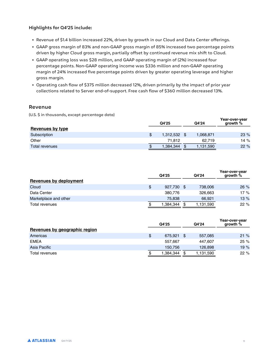 Q4 FY25 Highlights for Q4’25 include: • Revenue of $1.4 billion increased 22%, driven by growth in our Cloud and Data Center offerings. • GAAP gross margin of 83% and non-GAAP gross margin of 85% increased two percentage points driven by higher Cloud gross margin, partially offset by continued revenue mix shift to Cloud. • GAAP operating loss was $28 million, and GAAP operating margin of (2%) increased four percentage points. Non-GAAP operating income was $336 million and non-GAAP operating margin of 24% increased five percentage points driven by greater operating leverage and higher gross margin. • Operating cash flow of $375 million decreased 12%, driven primarily by the impact of prior year collections related to Server end-of-support. Free cash flow of $360 million decreased 13%. Revenue (U.S. $ in thousands, except percentage data) 7V Y P IY MY VN NQ IS ( - YM MU M YM S U T a M P % QdOQ Q OQ MSQ b A, - A, , HMIY%V MY% MIY OYV P BM MU M J WM GaN O U U %, +%.,+ %)/1%10 +, C TQ 0 %1 + /+%0 2 - M QbQ aQ %,1-%,-- % , %.2) ++ A, - A, , HMIY%V MY% MIY OYV P BM MU M J LMWSV TMU 8 aP 2+0%0,) 0,1%))/ +/ 9M M 8Q Q ,1)%00/ ,+/%//, 0 AM WQ MOQ M P TQ 0.%1,1 //%2+ , M QbQ aQ %,1-%,-- % , %.2) ++ A, - A, , HMIY%V MY% MIY OYV P BM MU M J OMVOYIWPQ YMOQVU 6YQ UOM /0.%2+ ..0%)1. + :A:6 ..0%//0 --0%/)0 +. 6 UM DMOURUO .)%0./ +/%121 2 M QbQ aQ %,1-%,-- % , %.2) ++ 11