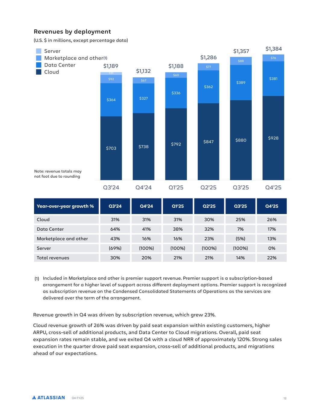 Q4 FY25 Q3’24 Q4’24 Q1’25 Q2’25 Q3’25 Q4’25 $30 $76 $88 $77 $60 $67$92 $381 $389 $362 $336 $327$364 $928$880$847$792$738$703 Cloud Data Center Marketplace and other Server $1,384$1,357 $1,286 $1,188 $1,132 $1,189 12 Revenues by deployment (U.S. $ in millions, except percentage data) Revenue growth in Q4 was driven by subscription revenue, which grew 23%. Cloud revenue growth of 26% was driven by paid seat expansion within existing customers, higher ARPU, cross-sell of additional products, and Data Center to Cloud migrations. Overall, paid seat expansion rates remain stable, and we exited Q4 with a cloud NRR of approximately 120%. Strong sales execution in the quarter drove paid seat expansion, cross-sell of additional products, and migrations ahead of our expectations. (1) Note: revenue totals may not foot due to rounding Year-over-year growth % Q3’24 Q4’24 Q1’25 Q2’25 Q3’25 Q4’25 Cloud 31% 31% 31% 30% 25% 26% Data Center 64% 41% 38% 32% 7% 17% Marketplace and other 43% 16% 16% 23% (5%) 13% Server (69%) (100%) (100%) (100%) (100%) 0% Total revenues 30% 20% 21% 21% 14% 22% Included in Marketplace and other is premier support revenue. Premier support is a subscription-based arrangement for a higher level of support across different deployment options. Premier support is recognized as subscription revenue on the Condensed Consolidated Statements of Operations as the services are delivered over the term of the arrangement. (1)