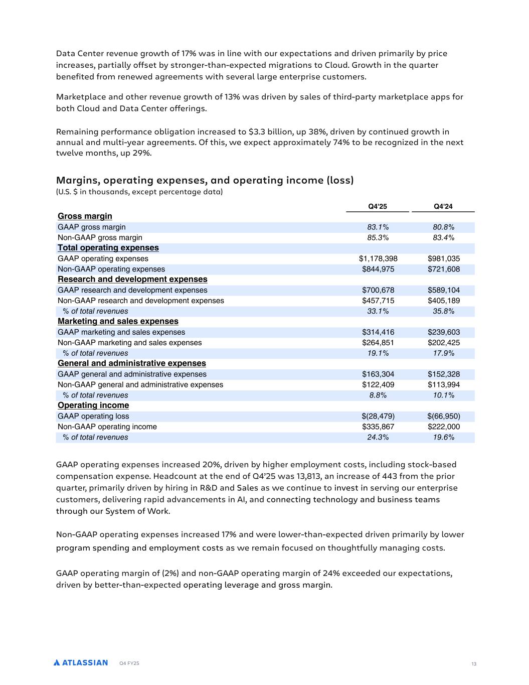 Q4 FY25 13 Data Center revenue growth of 17% was in line with our expectations and driven primarily by price increases, partially offset by stronger-than-expected migrations to Cloud. Growth in the quarter benefited from renewed agreements with several large enterprise customers. Marketplace and other revenue growth of 13% was driven by sales of third-party marketplace apps for both Cloud and Data Center offerings. Remaining performance obligation increased to $3.3 billion, up 38%, driven by continued growth in annual and multi-year agreements. Of this, we expect approximately 74% to be recognized in the next twelve months, up 29%. Margins, operating expenses, and operating income (loss) (U.S. $ in thousands, except percentage data) GAAP operating expenses increased 20%, driven by higher employment costs, including stock-based compensation expense. Headcount at the end of Q4’25 was 13,813, an increase of 443 from the prior quarter, primarily driven by hiring in R&D and Sales as we continue to invest in serving our enterprise customers, delivering rapid advancements in AI, and connecting technology and business teams through our System of Work. Non-GAAP operating expenses increased 17% and were lower-than-expected driven primarily by lower program spending and employment costs as we remain focused on thoughtfully managing costs. GAAP operating margin of (2%) and non-GAAP operating margin of 24% exceeded our expectations, driven by better-than-expected operating leverage and gross margin. E J G J E I ' C I EF J NF I I CC O G PFL O O CTACMP MCN OF NC P MCNAC P EC P 3 ' 3 , EII C 611 ENLOO NEG 9L $611 ENLOO NEG ( EJ EF J NF I I 611 LMCN PG E CTMC OCO -. ) . . ) 9L $611 LMCN PG E CTMC OCO . - -( , . 4 I EFC J NF I I 611 NCOC NAF CRC LM C P CTMC OCO - ,-. . 9L $611 NCOC NAF CRC LM C P CTMC OCO - - . 2 525 0 3.7.16.4 ( A J I I NF I I 611 N CPG E O CO CTMC OCO ) , () , ) 9L $611 N CPG E O CO CTMC OCO (, . ( ( ( 2 525 0 3.7.16.4 , C IJ J NF I I 611 EC CN G GOPN PGRC CTMC OCO ,) ) ( )(. 9L $611 EC CN G GOPN PGRC CTMC OCO (( ) 2 525 0 3.7.16.4 F J EC 611 LMCN PG E LOO (. - ,, 9L $611 LMCN PG E G AL C )) .,- ((( 2 525 0 3.7.16.4 % )