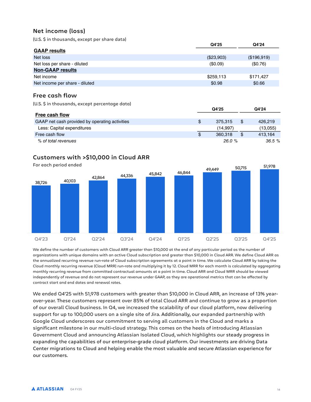 Q4 FY25 Net income (loss) (U.S. $ in thousands, except per share data) Free cash flow (U.S. $ in thousands, except percentage data) Customers with >$10,000 in Cloud ARR For each period ended We ended Q4’25 with 51,978 customers with greater than $10,000 in Cloud ARR, an increase of 13% year- over-year. These customers represent over 85% of total Cloud ARR and continue to grow as a proportion of our overall Cloud business. In Q4, we increased the scalability of our cloud platform, now delivering support for up to 100,000 users on a single site of Jira. Additionally, our expanded partnership with Google Cloud underscores our commitment to serving all customers in the Cloud and marks a significant milestone in our multi-cloud strategy. This comes on the heels of introducing Atlassian Government Cloud and announcing Atlassian Isolated Cloud, which highlights our steady progress in expanding the capabilities of our enterprise-grade cloud platform. Our investments are driving Data Center migrations to Cloud and helping enable the most valuable and secure Atlassian experience for our customers. 7V Y P IY MY VN NQ IS ( - >M :U VTM U T a M P % QdOQ Q TM Q PM M A, - A, , 22 YM S BQ +,%2), 2/%2 2 BQ Q TM Q PU a QP )')2 )'0/ >VU% 22 YM S BQ U O YQ +.2% , 0 %-+0 BQ U O YQ Q TM Q PU a QP )'21 )'// 7V Y P IY MY VN NQ IS ( - 7YMM 4I P 7SV U T a M P % QdOQ Q OQ MSQ A, - A, , 7YMM I P NSV 66D Q OM T bUPQP Ne Q M U S MO UbU UQ ,0.%, . -+/%+ 2 @Q 3 8M U M Qd Q PU a Q -%220 ,%).. ; QQ OM T R c ,/)%, 1 - ,% /- F F6 AG (,% ),% 7V Y P IY MY VN NQ IS ( - >M :U VTM U T a M P % QdOQ Q TM Q P M A, - A, , 22 YM S BQ +,%2), 2/%2 2 BQ Q TM Q PU a QP )')2 )'0/ >VU% 22 Y S BQ U O YQ +.2% , 0 %-+0 BQ U O YQ Q TM Q PU a QP )'21 )'// 7V Y P IY MY VN NQ IS ( - 7YMM 4I P 7SV U T a M P % QdOQ Q OQ SQ A, - A, , 7YMM I P NSV 66D Q OM T bUPQP Ne Q M U S MO UbU UQ ,0.%, . -+/%+ 2 @Q 3 8M U M Qd Q PU a Q -%220 ,%).. ; Q OM T R c ,/)%, 1 - ,% /- F F6 AG (,% ),% 14 We define the number of customers with Cloud ARR greater than $10,000 at the end of any particular period as the number of organizations with unique domains with an active Cloud subscription and greater than $10,000 in Cloud ARR. We define Cloud ARR as the annualized recurring revenue run-rate of Cloud subscription agreements at a point in time. We calculate Cloud ARR by taking the Cloud monthly recurring revenue (Cloud MRR) run-rate and multiplying it by 12. Cloud MRR for each month is calculated by aggregating monthly recurring revenue from committed contractual amounts at a point in time. Cloud ARR and Cloud MRR should be viewed independently of revenue and do not represent our revenue under GAAP, as they are operational metrics that can be affected by contract start and end dates and renewal rates.