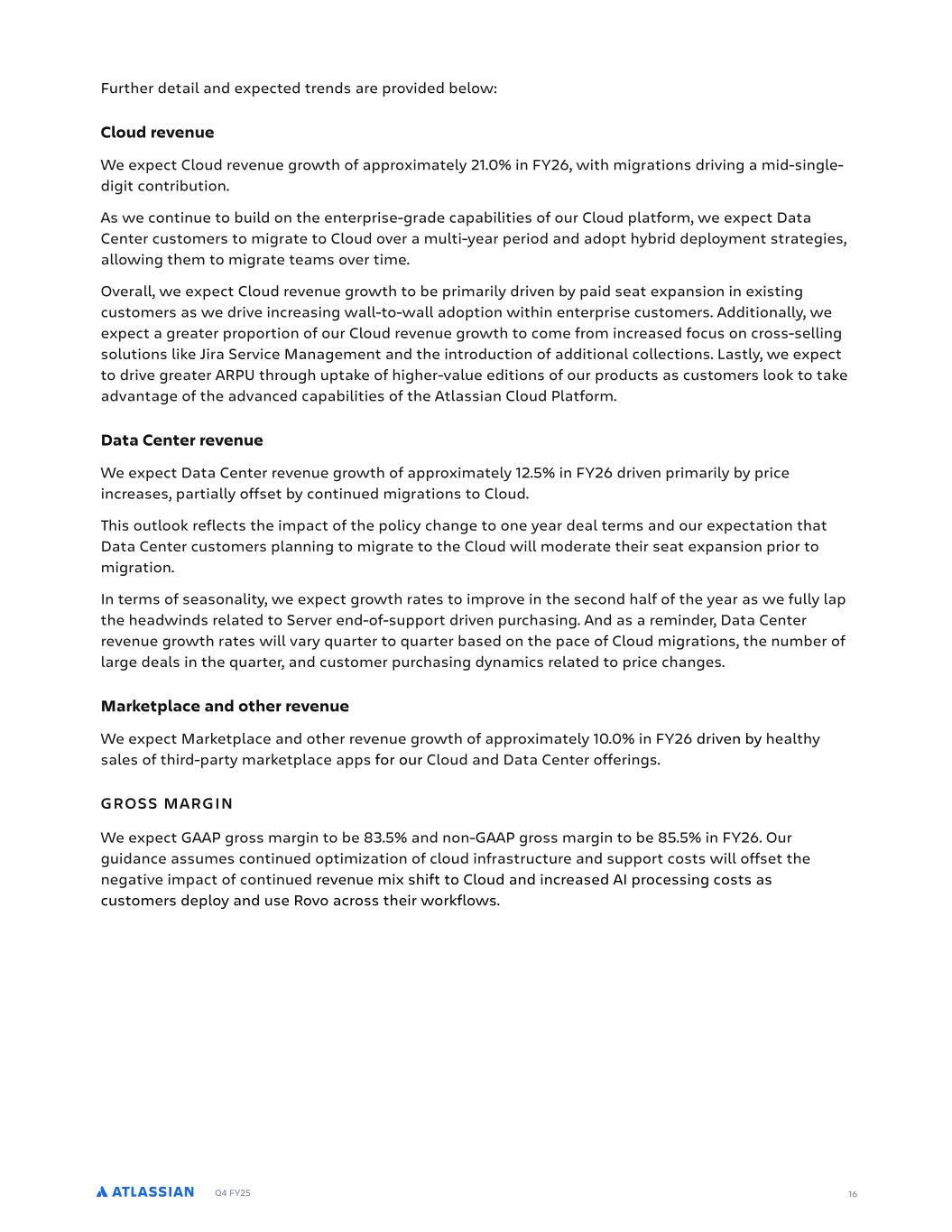Q4 FY25 Further detail and expected trends are provided below: Cloud revenue We expect Cloud revenue growth of approximately 21.0% in FY26, with migrations driving a mid-single- digit contribution. As we continue to build on the enterprise-grade capabilities of our Cloud platform, we expect Data Center customers to migrate to Cloud over a multi-year period and adopt hybrid deployment strategies, allowing them to migrate teams over time. Overall, we expect Cloud revenue growth to be primarily driven by paid seat expansion in existing customers as we drive increasing wall-to-wall adoption within enterprise customers. Additionally, we expect a greater proportion of our Cloud revenue growth to come from increased focus on cross-selling solutions like Jira Service Management and the introduction of additional collections. Lastly, we expect to drive greater ARPU through uptake of higher-value editions of our products as customers look to take advantage of the advanced capabilities of the Atlassian Cloud Platform. Data Center revenue We expect Data Center revenue growth of approximately 12.5% in FY26 driven primarily by price increases, partially offset by continued migrations to Cloud. This outlook reflects the impact of the policy change to one year deal terms and our expectation that Data Center customers planning to migrate to the Cloud will moderate their seat expansion prior to migration. In terms of seasonality, we expect growth rates to improve in the second half of the year as we fully lap the headwinds related to Server end-of-support driven purchasing. And as a reminder, Data Center revenue growth rates will vary quarter to quarter based on the pace of Cloud migrations, the number of large deals in the quarter, and customer purchasing dynamics related to price changes. Marketplace and other revenue We expect Marketplace and other revenue growth of approximately 10.0% in FY26 driven by healthy sales of third-party marketplace apps for our Cloud and Data Center offerings. GROSS MARGIN We expect GAAP gross margin to be 83.5% and non-GAAP gross margin to be 85.5% in FY26. Our guidance assumes continued optimization of cloud infrastructure and support costs will offset the negative impact of continued revenue mix shift to Cloud and increased AI processing costs as customers deploy and use Rovo across their workflows. 16