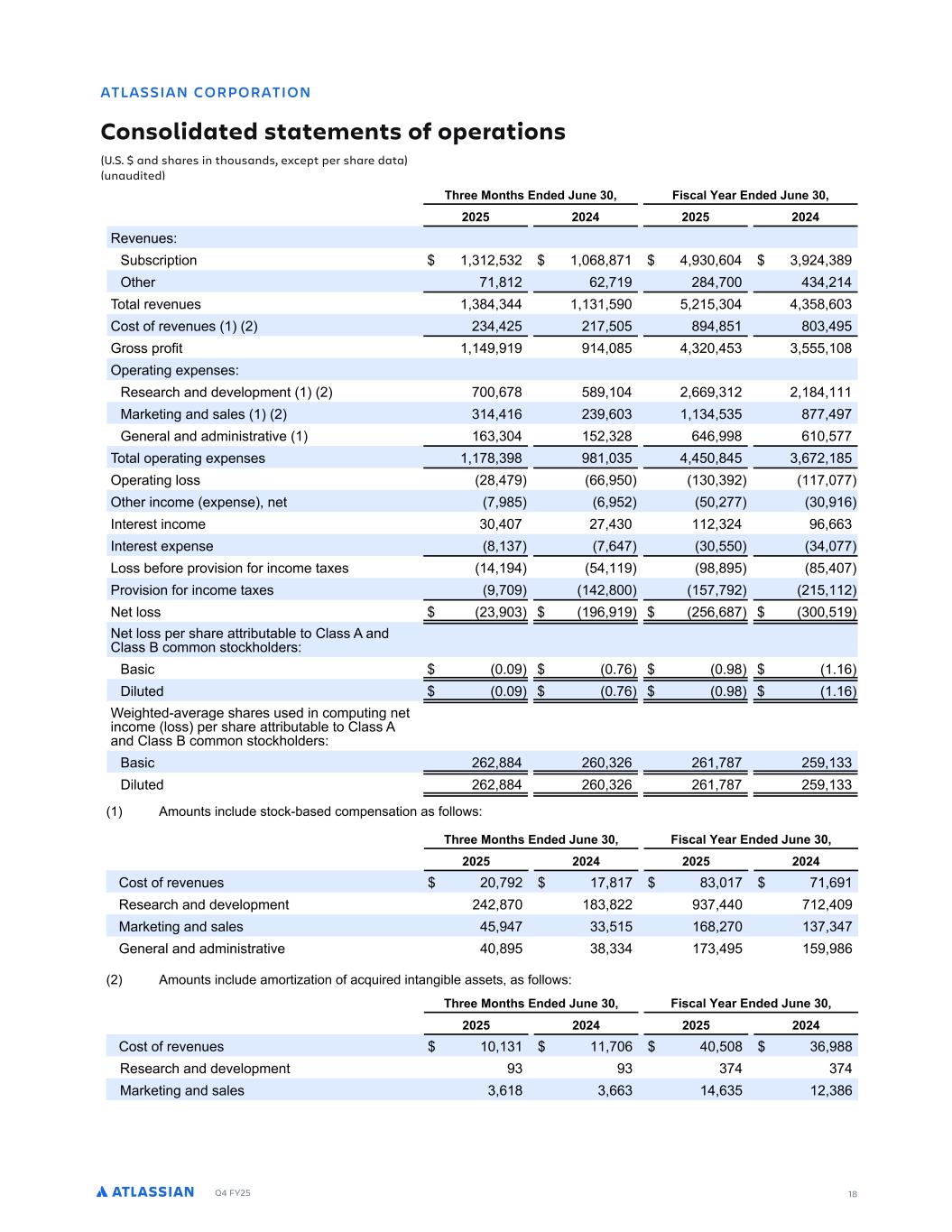 Q4 FY25 18 ATLASSIAN CORPORATION Consolidated statements of operations (U.S. $ and shares in thousands, except per share data) (unaudited) .S ARR AM 0N ON AS NM 0NMRN DASED SASELEMSR NF OE AS NMR % % AMD R A ER M S NTRAMDR EWCEOS OE R A E DASA TMATD SED EE NMS R 2MDED 5TME ( 3 RCA EA 2MDED 5TME ( ) ) G GPWG 0 WD ET R P ) ( )( ,. .- ) , ) ( ). JGT - . ( ,( - (. - ) ( A CN TG GPWG ). ) ) ( ) ) . , ) 3 TG GPWG ( () ( ( - . . . ) 7T RT . )( ) ) . RGTC PI G RGP G 0 G GCTEJ CPF FG GN ROGP ( - ,-. . ( ,, ) ( ( . CTMG PI CPF CNG ( ) , () , ) ) ) .-- - 7GPGTCN CPF CFO P TC G ,) ) ( )(. , , . , -- A CN RGTC PI G RGP G -. ) . . ) . ) ,-( . RGTC PI N (. - ,, ) ) ( - -- JGT PE OG G RGP G PG - . , ( (-- ) , 8P GTG PE OG ) - (- ) ( )( , ,,) 8P GTG G RGP G . )- - , - ) ) -- : DG TG RT P T PE OG C G . . . - T P T PE OG C G - ( . - - ( ( ( G N () ) , ( , ,.- ) G N RGT JCTG C T DW CDNG 3NC 1 CPF 3NC 2 E OO P EMJ NFGT 0 2C E % %-, % . % , 4 NW GF % %-, % . % , BG IJ GF$C GTCIG JCTG W GF P E ORW PI PG PE OG N RGT JCTG C T DW CDNG 3NC 1 CPF 3NC 2 E OO P EMJ NFGT 0 2C E (,( .. (, )(, (, -.- ( )) 4 NW GF (,( .. (, )(, (, -.- ( )) 1O WP PENWFG EM$DC GF E ORGP C P C NN 0 EE NMS R 2MDED 5TME ( 3 RCA EA 2MDED 5TME ( ) ) 3 TG GPWG ( - ( - . - .) - - , G GCTEJ CPF FG GN ROGP ( ( .- .) .(( )- - ( CTMG PI CPF CNG - )) ,. (- )- ) - 7GPGTCN CPF CFO P TC G . ). )) -) ., ( 1O WP PENWFG CO T C P CESW TGF P CPI DNG C G C NN 0 EE NMS R 2MDED 5TME ( 3 RCA EA 2MDED 5TME ( ) ) 3 TG GPWG ) - , . ), .. G GCTEJ CPF FG GN ROGP ) ) )- )- CTMG PI CPF CNG ) , . ) ,,) ,) ( )., ,
