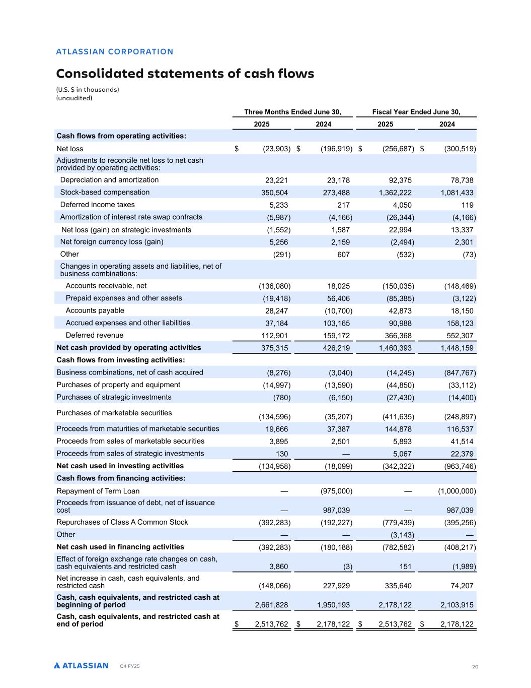 Q4 FY25 20 .S ARR AM 0N ON AS NM 0NMRN DASED SASELEMSR NF 0AR 3 N R % % M S NTRAMDR TMATD SED EE NMS R 2MDED 5TME ( 3 RCA EA 2MDED 5TME ( ) ) 0AR F N R F NL NOE AS MG ACS U S ER- G N () ) , ( , ,.- ) 1FLW OGP TGE PE NG PG N PG EC J RT FGF D RGTC PI CE G 0 4GRTGE C P CPF CO T C P () (( () -. ( )- -. -). EM$DC GF E ORGP C P ) (-) .. ),( ((( . )) 4G GTTGF PE OG C G ()) ( - 1O T C P P GTG TC G CR E P TCE .- ,, (, ) ,, G N IC P P TC GI E P G OGP ( .- (( ) ))- G TG IP EWTTGPE N IC P ( , ( ( ( ) JGT ( , - )( -) 3JCPIG P RGTC PI C G CPF N CD N G PG DW PG E OD PC P 0 1EE WP TGEG CDNG PG ), . . ( ) . , TGRC F G RGP G CPF JGT C G . , , . ). ) (( 1EE WP RC CDNG (. ( - - ( .-) . 1EETWGF G RGP G CPF JGT N CD N G )- . ) , .. . () 4G GTTGF TG GPWG ( -( ),, ),. ( ) - 8ES CAR O NU DED B NOE AS MG ACS U S ER )- ) (, ( , ) ) . 0AR F N R F NL MUERS MG ACS U S ER- 2W PG E OD PC P PG EC J CESW TGF . (-, ) ( . - -,- WTEJC G RT RGT CPF GSW ROGP - ) . )) ( WTEJC G TC GI E P G OGP -. , (- ) WTEJC G OCTMG CDNG GEWT G ) , ) ( - ,) ( . . - T EGGF T O OC WT G OCTMG CDNG GEWT G ,,, )- ).- .-. , )- T EGGF T O CNG OCTMG CDNG GEWT G ) . ( . ) T EGGF T O CNG TC GI E P G OGP ) ,- (( )- 8ES CAR TRED M MUERS MG ACS U S ER ) . . ) ( )(( ,) - , 0AR F N R F NL F MAMC MG ACS U S ER- GRC OGP AGTO : CP - T EGGF T O WCPEG FGD PG WCPEG E .- ) .- ) GRWTEJC G 3NC 1 3 OO P EM ) ( (.) ( ((- -- ) ) ( , JGT ) ) 8ES CAR TRED M F MAMC MG ACS U S ER ) ( (.) . .. -.( .( . ( - 5 GE TG IP G EJCPIG TC G EJCPIG P EC J EC J GSW CNGP CPF TG T E GF EC J ) ., ) . G PETGC G P EC J EC J GSW CNGP CPF TG T E GF EC J . ,, ((- ( )) , - ( - 0AR CAR EPT UA EMSR AMD ERS CSED CAR AS BEG MM MG NF OE ND ( ,, .(. ) ( -. (( ( ) 0AR CAR EPT UA EMSR AMD ERS CSED CAR AS EMD NF OE ND ( ) -,( ( -. (( ( ) -,( ( -. (( . ATLASSIAN CORPORATION Consolidated statements of cash flows (U.S. $ in thousands) (unaudited)