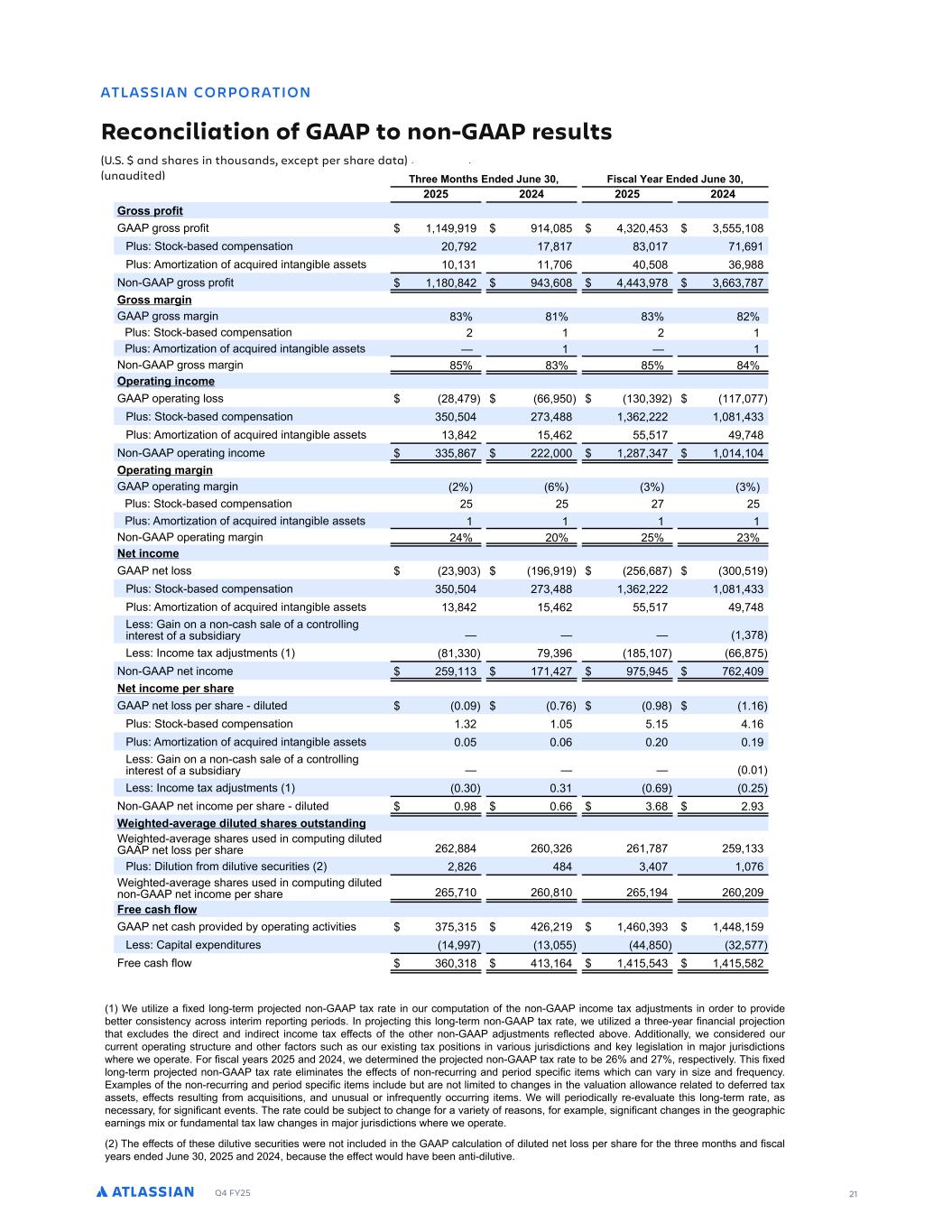 Q4 FY25 21 .S ARR AM 0N ON AS NM ECNMC AS NM NF 4..: SN 8NM$4..: ERT SR % % AMD R A ER M S NTRAMDR EWCEOS OE CEMSAGE AMD OE R A E DASA TMATD SED EE NMS R 2MDED 5TME ( 3 RCA EA 2MDED 5TME ( ) ) 4 NRR O NF S 711 IT RT . )( ) ) . NW 0 EM$DC GF E ORGP C P ( - ( - . - .) - - , NW 0 1O T C P CESW TGF P CPI DNG C G ) - , . ), .. P$711 IT RT . . ( ) , . ) -. ) ,,) -.- 4 NRR LA G M 711 IT OCTI P .) . .) .( NW 0 EM$DC GF E ORGP C P ( ( NW 0 1O T C P CESW TGF P CPI DNG C G P$711 IT OCTI P . .) . . OE AS MG MCNLE 711 RGTC PI N (. - ,, ) ) ( - -- NW 0 EM$DC GF E ORGP C P ) (-) .. ),( ((( . )) NW 0 1O T C P CESW TGF P CPI DNG C G ) . ( ,( - - . P$711 RGTC PI PE OG )) .,- ((( (.- ) - OE AS MG LA G M 711 RGTC PI OCTI P ( , ) ) NW 0 EM$DC GF E ORGP C P ( ( (- ( NW 0 1O T C P CESW TGF P CPI DNG C G P$711 RGTC PI OCTI P ( ( ( () 8ES MCNLE 711 PG N () ) , ( , ,.- ) NW 0 EM$DC GF E ORGP C P ) (-) .. ),( ((( . )) NW 0 1O T C P CESW TGF P CPI DNG C G ) . ( ,( - - . :G 0 7C P P C P P$EC J CNG C E P T NN PI P GTG C WD F CT )-. :G 0 8PE OG C CFLW OGP . )) - ) , . - ,, .- P$711 PG PE OG ( ) - (- - -,( 8ES MCNLE OE R A E 711 PG N RGT JCTG $ F NW GF % %-, % . % , NW 0 EM$DC GF E ORGP C P %)( % % % , NW 0 1O T C P CESW TGF P CPI DNG C G % % , %( % :G 0 7C P P C P P$EC J CNG C E P T NN PI P GTG C WD F CT % :G 0 8PE OG C CFLW OGP %) %) %, %( P$711 PG PE OG RGT JCTG $ F NW GF % . %,, )%,. (% ) E G SED$AUE AGE D TSED R A ER NTSRSAMD MG BG IJ GF$C GTCIG JCTG W GF P E ORW PI F NW GF 711 PG N RGT JCTG (,( .. (, )(, (, -.- ( )) NW 0 4 NW P T O F NW G GEWT G ( ( .(, . ) - -, BG IJ GF$C GTCIG JCTG W GF P E ORW PI F NW GF P P$711 PG PE OG RGT JCTG (, - (, . (, (, ( 3 EE CAR F N 711 PG EC J RT FGF D RGTC PI CE G )- ) (, ( , ) ) . :G 0 3CR CN G RGPF WTG - ) . )( -- 6TGG EC J N ), ) . ) , ) .( BG W N G C GF N PI$ GTO RT LGE GF P P$711 C TC G P WT E ORW C P JG P P$711 PE OG C CFLW OGP P TFGT RT FG DG GT E P GPE CET P GT O TGR T PI RGT F % 8P RT LGE PI J N PI$ GTO P P$711 C TC G G W N GF C JTGG$ GCT PCPE CN RT LGE P JC G ENWFG JG F TGE CPF PF TGE PE OG C G GE JG JGT P P$711 CFLW OGP TG NGE GF CD G% 1FF PCNN G E P FGTGF WT EWTTGP RGTC PI TWE WTG CPF JGT CE T WEJ C WT G PI C R P P CT W LWT F E P CPF MG NGI NC P P OCL T LWT F E P JGTG G RGTC G% 6 T ECN GCT ( ( CPF ( ( G FG GTO PGF JG RT LGE GF P P$711 C TC G DG (, CPF (- TG RGE GN % AJ GF N PI$ GTO RT LGE GF P P$711 C TC G GN O PC G JG G GE P P$TGEWTT PI CPF RGT F RGE E GO J EJ ECP CT P G CPF TGSWGPE % 5 CORNG JG P P$TGEWTT PI CPF RGT F RGE E GO PENWFG DW CTG P N O GF EJCPIG P JG CNWC P CNN CPEG TGNC GF FG GTTGF C C G G GE TG WN PI T O CESW P CPF WPW WCN T P TGSWGP N EEWTT PI GO % BG NN RGT F ECNN TG$G CNWC G J N PI$ GTO TC G C PGEG CT T IP ECP G GP % AJG TC G E WNF DG WDLGE EJCPIG T C CT G TGC P T G CORNG IP ECP EJCPIG P JG IG ITCRJ E GCTP PI O T WPFCOGP CN C NC EJCPIG P OCL T LWT F E P JGTG G RGTC G% ( AJG G GE JG G F NW G GEWT G GTG P PENWFGF P JG 711 ECNEWNC P F NW GF PG N RGT JCTG T JG JTGG O P J CPF ECN GCT GPFGF 9WPG ) ( ( CPF ( ( DGECW G JG G GE WNF JC G DGGP CP $F NW G% ATLASSIAN CORPORATION Reconciliation of GAAP to non-GAAP results (U.S. $ and shares in thousands, except per share data) (unaudited) .S ARR AM 0N ON AS NM ECNMC AS NM NF 4..: SN 8NM$4..: ERT SR % % AMD R A ER M S NTRAMDR EWCEOS OE CEMSAGE AMD OE R A E DASA TMATD SED EE NMS R 2MDED 5TME ( 3 RCA EA 2MDED 5TME ( ) ) 4 NRR O NF S 711 IT RT . )( ) ) . NW 0 EM$DC GF E ORGP C P ( - ( - . - .) - - , NW 0 1O T C P CESW TGF P CPI DNG C G ) - , . ), .. P$711 IT RT . . ( ) , . ) -. ) ,,) -.- 4 NRR LA G M 711 IT OCTI P .) . .) .( NW 0 EM$DC GF E ORGP C P ( ( NW 0 1O T C P CESW TGF P CPI DNG C G P$71 IT OCTI P . .) . . OE AS MG MCNLE 71 RGTC PI N (. - , ) ) ( -- NW 0 EM$DC GF E ORGP C P ) (-) . ), (( . )) NW 0 1O T C P CESW TGF P N ) . ( ,( - - . P$71 RGTC PI PE OG )) .,- ( (.- ) - OE AS MG LA G M 71 RGTC PI OCTI P ( , ) ) NW 0 EM$DC GF E ORGP C P ( ( (- ( NW 0 1O T C P CESW TGF P CPI DNG C G P$711 RGTC PI OCTI P ( ( ( () 8ES MCNLE 711 PG N () ) , ( , ,.- ) NW 0 EM$DC GF E ORGP C P ) (-) .. ),( ((( . )) NW 0 1O T C P CESW TGF P CPI DNG C G ) . ( ,( - - . :G 0 7C P P C P P$EC J CNG C E P T NN PI P GTG C WD F CT )-. :G 0 8PE OG C CFLW OGP . )) - ) , . - ,, .- P$711 PG PE OG ( ) - (- - -,( 8ES MCNLE OE R A E 711 PG N RGT JCTG $ F NW GF % %-, % . % , NW 0 EM$DC GF E ORGP C P %)( % % % , NW 0 1O T C P CESW TGF P CPI DNG C G % % , %( % :G 0 7C P P C P P$EC J CNG C E P T NN PI P GTG C WD F CT % :G 0 8PE OG C CFLW OGP %) %) %, %( P$711 PG PE OG RGT JCTG $ F NW GF % . %,, )%,. (% ) E SED$AUE AGE D TSED R A ER NTSRSAMD MG BG IJ GF$C GTCIG JCTG W GF P E ORW PI F NW GF 711 PG RGT JCTG (,( .. (, )(, (, .- ( )) NW 0 4 NW P T O F NW G EWT G ( ( .(, . ) - -, BG IJ GF$C GTCIG JCTG W GF P E ORW PI F NW GF P P$711 PG PE OG RGT JCTG (, - (, . (, (, ( 3 EE CAR F N 711 PG EC J RT FGF D RGTC PI CE G )- ) (, ( , ) ) . :G 0 3CR CN G RGPF WTG - ) . )( -- 6TGG EC J N ), ) . ) , ) .( BG W N G C GF N PI$ GTO RT LGE GF P P$711 C TC G P WT E ORW C P JG P P$711 PE OG C CFLW OGP P TFGT RT FG DG GT E P GPE CET P GT O TGR T PI RGT F % 8P RT LGE PI J N PI$ GTO P P$711 C TC G G W N GF C JTGG$ GCT PCPE CN RT LGE P JC G ENWFG JG F TGE CPF PF TGE PE OG C G GE JG JGT P P$711 CFLW OGP TG NGE GF CD G% 1FF PCNN G E P FGTGF WT EWTTGP RGTC PI TWE WTG CPF JGT CE T WEJ C WT G PI C R P P CT W LWT F E P CPF MG NGI NC P P OCL T LWT F P JGTG G RGTC % 6 T ECN G T ( ( CPF ( ( G FG GTO PGF JG RT LGE GF P P$711 C TC G DG (, CPF (- TG RGE N % AJ GF N PI$ TO RT LGE GF P $711 C TC G GN O C G JG G GE P P$TGEWTT PI CPF RGT F RGE E GO J EJ ECP CT P G CPF TGSWGPE % 5 CORNG JG P P$TGEWTT PI CPF RG F RGE E GO PENWFG DW CTG P N O GF EJCPIG P JG CNWC P NN CPEG TGNC GF FG GTTGF C C G G GE TG WN PI T O ESW P CPF WPW WCN T P TGSWGP N EEWTT PI GO % BG NN RGT F ECNN TG$G CNWC G J N PI$ GTO TC G C PGEG CT T IP ECP G GP % AJG TC G E WNF DG WDLGE EJCPIG T C CT G TGC P T G CORNG IP ECP EJCPIG P JG IG ITCRJ E GCTP PI O T WPFCOGP CN C NC EJCPIG P OCL T LWT F E P JGTG G RGTC G% ( AJG G GE JG G F NW G G