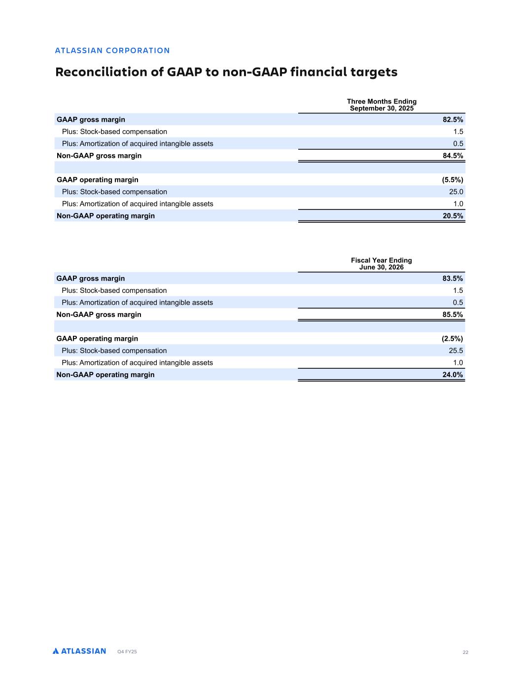 Q4 FY25 22 ATLASSIAN CORPORATION Reconciliation of GAAP to non-GAAP financial targets .S ARR AM 0N ON AS NM ECNMC AS NM NF 4..: SN 8NM$4..: 3 MAMC A A GESR EE NMS R 2MD MG EOSELBE ( 4..: G NRR LA G M , % NW 0 EM$DC GF E ORGP C P % NW 0 1O T C P CESW TGF P CPI DNG C G % 8NM$4..: G NRR LA G M ,)% 4..: NOE AS MG LA G M % NW 0 EM$DC GF E ORGP C P ( % NW 0 1O T C P CESW TGF P CPI DNG C G % 8NM$4..: NOE AS MG LA G M % 3 RCA EA 2MD MG 5TME ( 4..: G NRR LA G M ,(% NW 0 EM$DC GF E ORGP C P % NW 0 1O T C P CESW TGF P CPI DNG C G % 8NM$4..: G NRR LA G M , % 4..: NOE AS MG LA G M % NW 0 EM$DC GF E ORGP C P ( % NW 0 1O T C P CESW TGF P CPI DNG C G % 8NM$4..: NOE AS MG LA G M )%