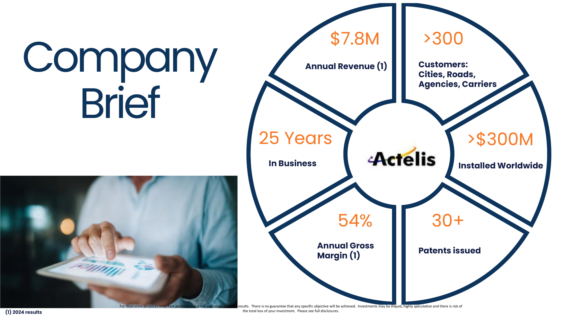 Annual Revenue (1) >300 Customers: Cities, Roads, Agencies, Carriers Company Brief $7.8M >$300M Installed Worldwide 30+ Patents issued 54% Annual Gross Margin (1) 25 Years In Business (1) 2024 results For illustrative purposes only. Past performance is not indicative of future results. There is no guarantee that any specifi c o bjective will be achieved. Investments may be illiquid, highly speculative and there is risk of the total loss of your investment. Please see full disclosures.