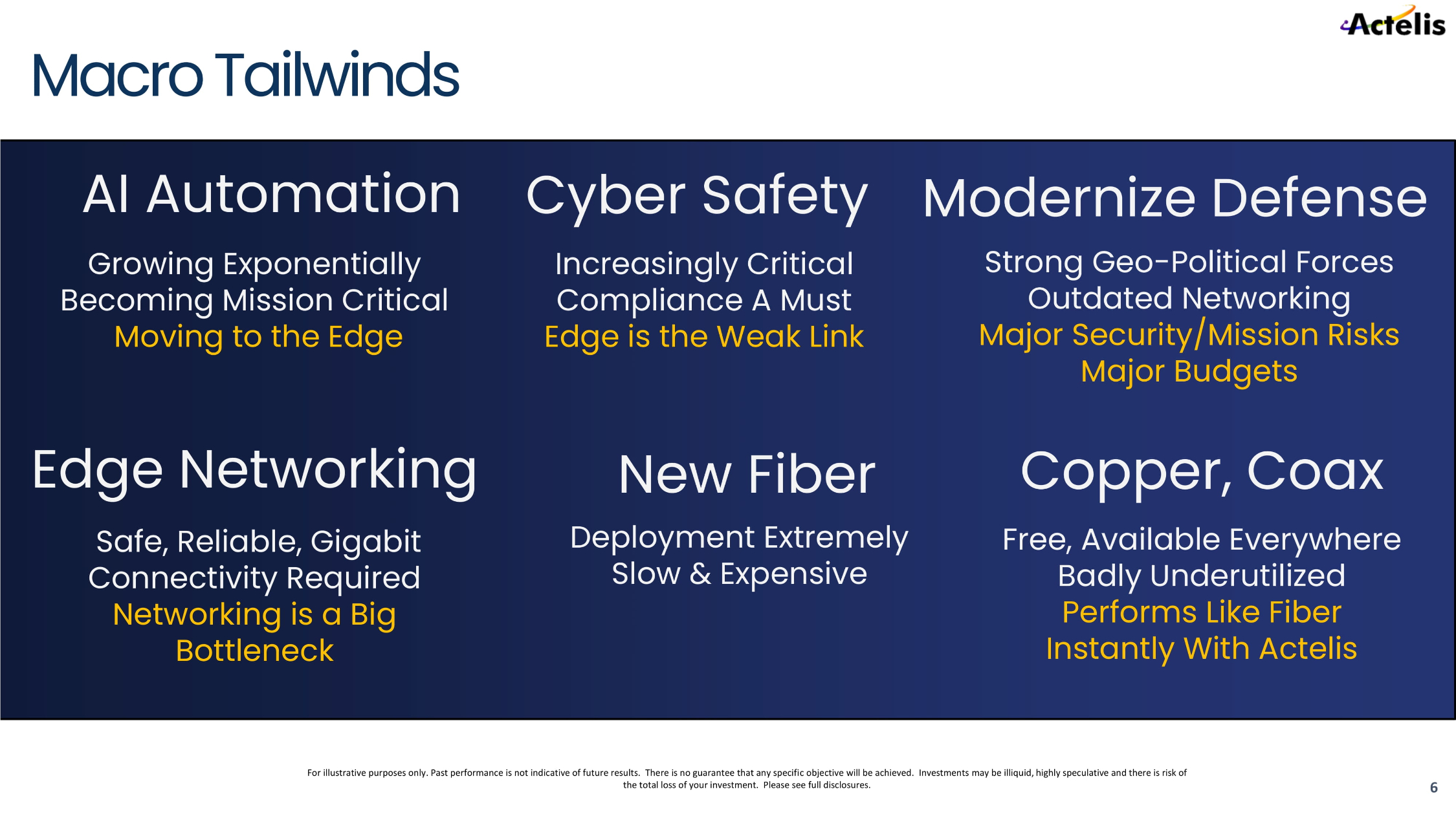 For illustrative purposes only. Past performance is not indicative of future results. There is no guarantee that any specifi c o bjective will be achieved. Investments may be illiquid, highly speculative and there is risk of the total loss of your investment. Please see full disclosures. New Fiber Deployment Extremely Slow & Expensive Modernize Defense 6 Macro Tailwinds Edge Networking Safe, Reliable, Gigabit Connectivity Required Networking is a Big Bottleneck AI Automation Growing Exponentially Becoming Mission Critical Moving to the Edge Cyber Safety Increasingly Critical Compliance A Must Edge is the Weak Link Copper, Coax Free, Available Everywhere Badly Underutilized Performs Like Fiber Instantly With Actelis Strong Geo - Political Forces Outdated Networking Major Security/Mission Risks Major Budgets
