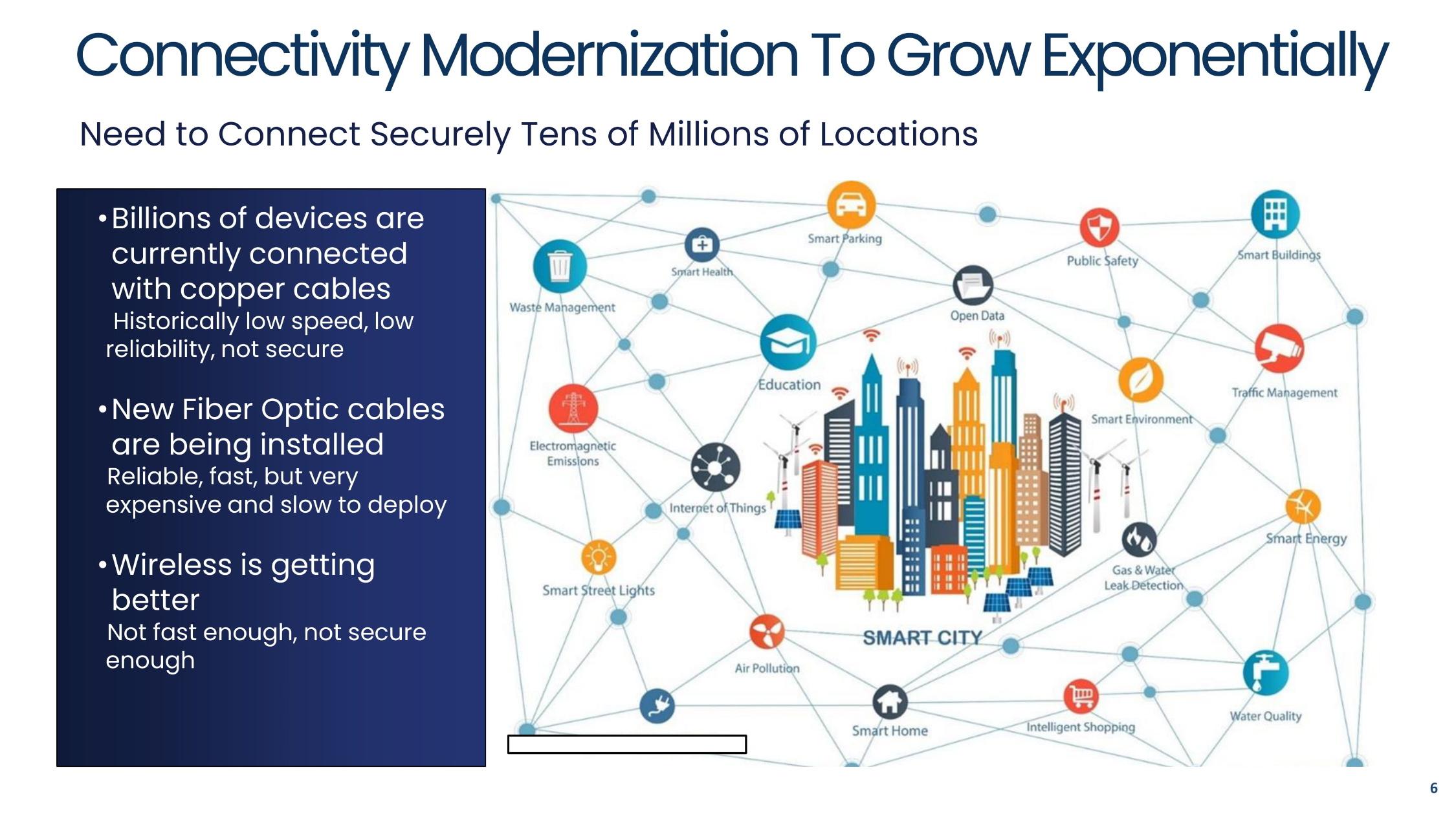 Connectivity Modernization To Grow Exponentially • Billions of devices are currently connected with copper cables Historically low speed, low reliability, not secure • New Fiber Optic cables are being installed Reliable, fast, but very expensive and slow to deploy • Wireless is getting better Not fast enough, not secure enough Need to Connect Securely Tens of Millions of Locations 6