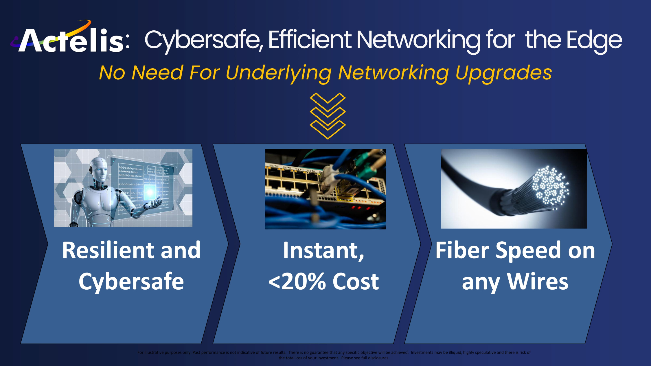 Resilient and Cybersafe Instant, <20% Cost Fiber Speed on any Wires : Cybersafe, Efficient Networking for the Edge No Need For Underlying Networking Upgrades For illustrative purposes only. Past performance is not indicative of future results. There is no guarantee that any specifi c o bjective will be achieved. Investments may be illiquid, highly speculative and there is risk of the total loss of your investment. Please see full disclosures.
