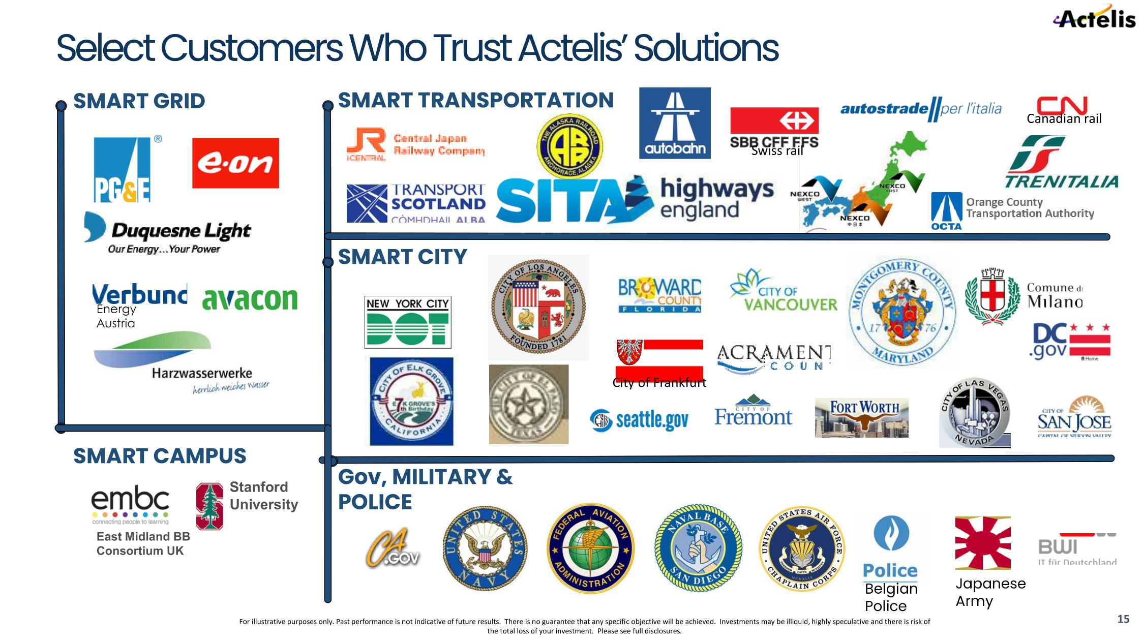 For illustrative purposes only. Past performance is not indicative of future results. There is no guarantee that any specifi c o bjective will be achieved. Investments may be illiquid, highly speculative and there is risk of the total loss of your investment. Please see full disclosures. Sacramento County DC.gov Home Stanford University City of Frankfurt Energy Austria Japanese Army SMART TRANSPORTATION SMART GRID SMART CITY SMART CAMPUS Gov, MILITARY & POLICE Canadian rail Swiss rail Belgian Police East Midland BB Consortium UK 15 Select Customers Who Trust Actelis’ Solutions