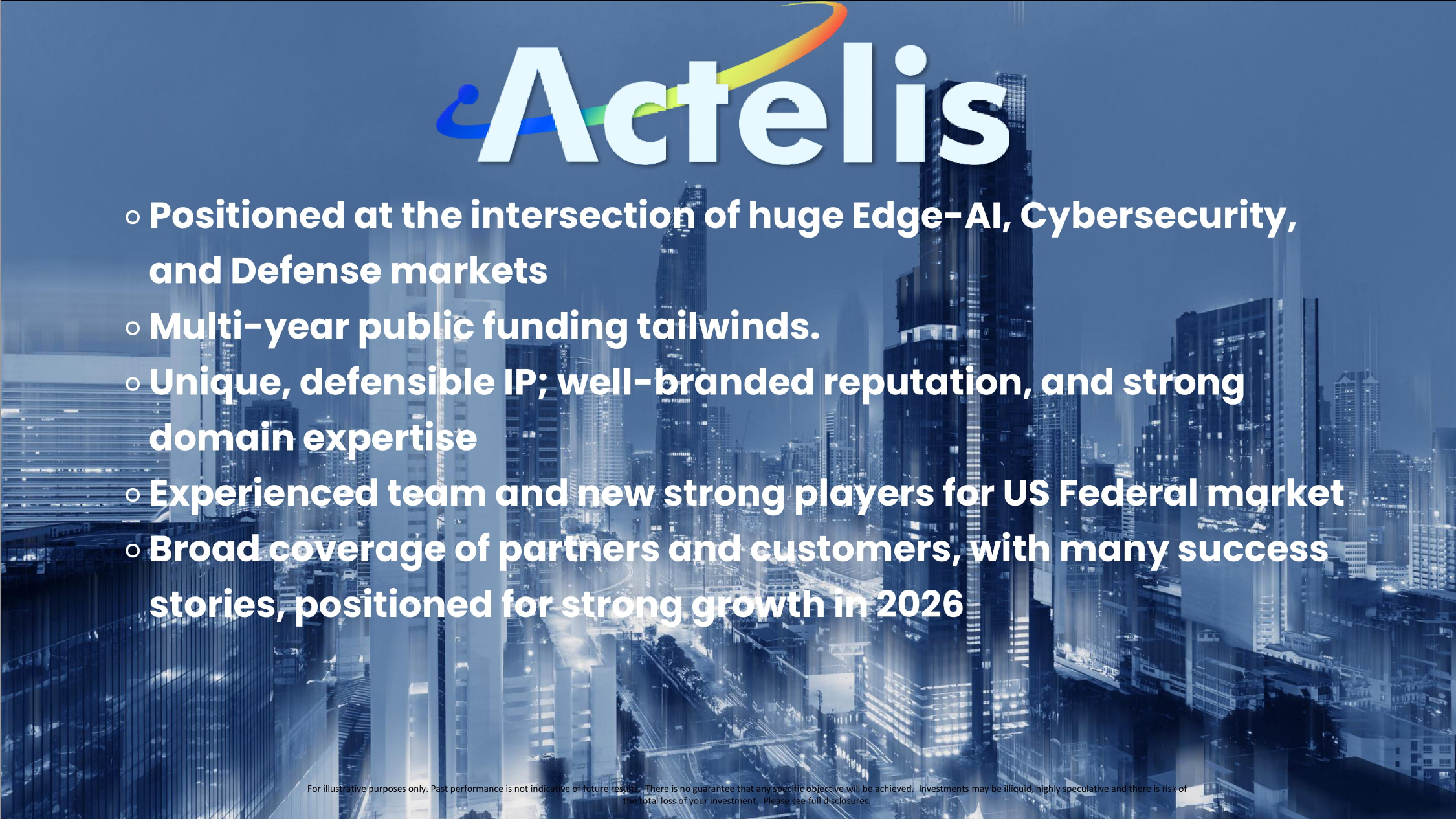 For illustrative purposes only. Past performance is not indicative of future results. There is no guarantee that any specifi c o bjective will be achieved. Investments may be illiquid, highly speculative and there is risk of the total loss of your inves tme nt. Please see full disclosures. 10 ⚬ Positioned at the intersection of huge Edge - AI, Cybersecurity, and Defense markets ⚬ Multi - year public funding tailwinds. ⚬ Unique, defensible IP; well - branded reputation, and strong domain expertise ⚬ Experienced team and new strong players for US Federal market ⚬ Broad coverage of partners and customers, with many success stories, positioned for strong growth in 2026 For illustrative purposes only. Past performance is not indicative of future results. There is no guarantee that any specifi c o bjective will be achieved. Investments may be illiquid, highly speculative and there is risk of the total loss of your investment. Please see full disclosures.