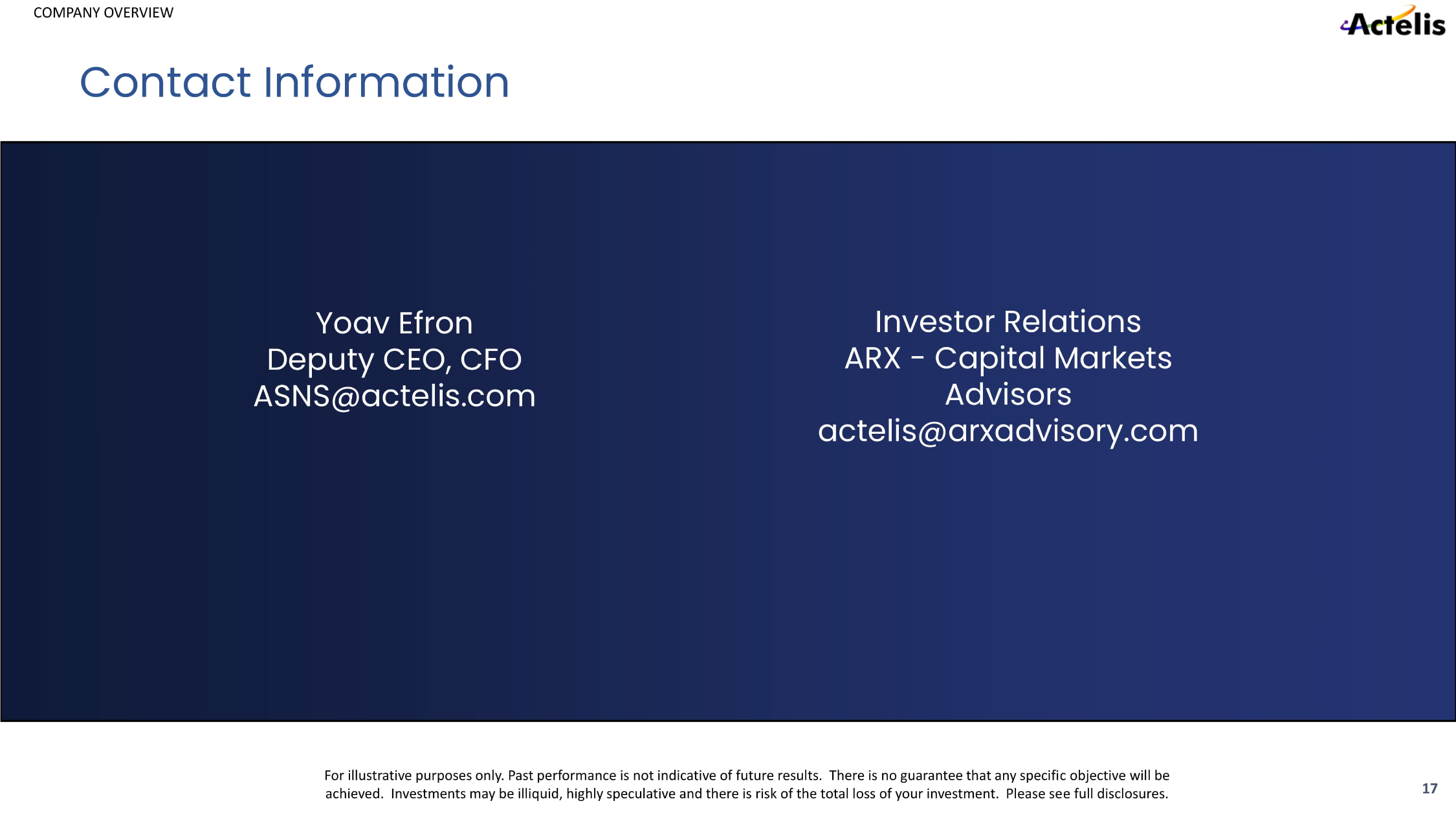 COMPANY OVERVIEW For illustrative purposes only. Past performance is not indicative of future results. There is no guarantee that any specifi c o bjective will be achieved. Investments may be illiquid, highly speculative and there is risk of the total loss of your investment. Please se e f ull disclosures. Yoav Efron Deputy CEO, CFO ASNS@actelis.com Investor Relations ARX - Capital Markets Advisors actelis@arxadvisory.com 17 Contact Information
