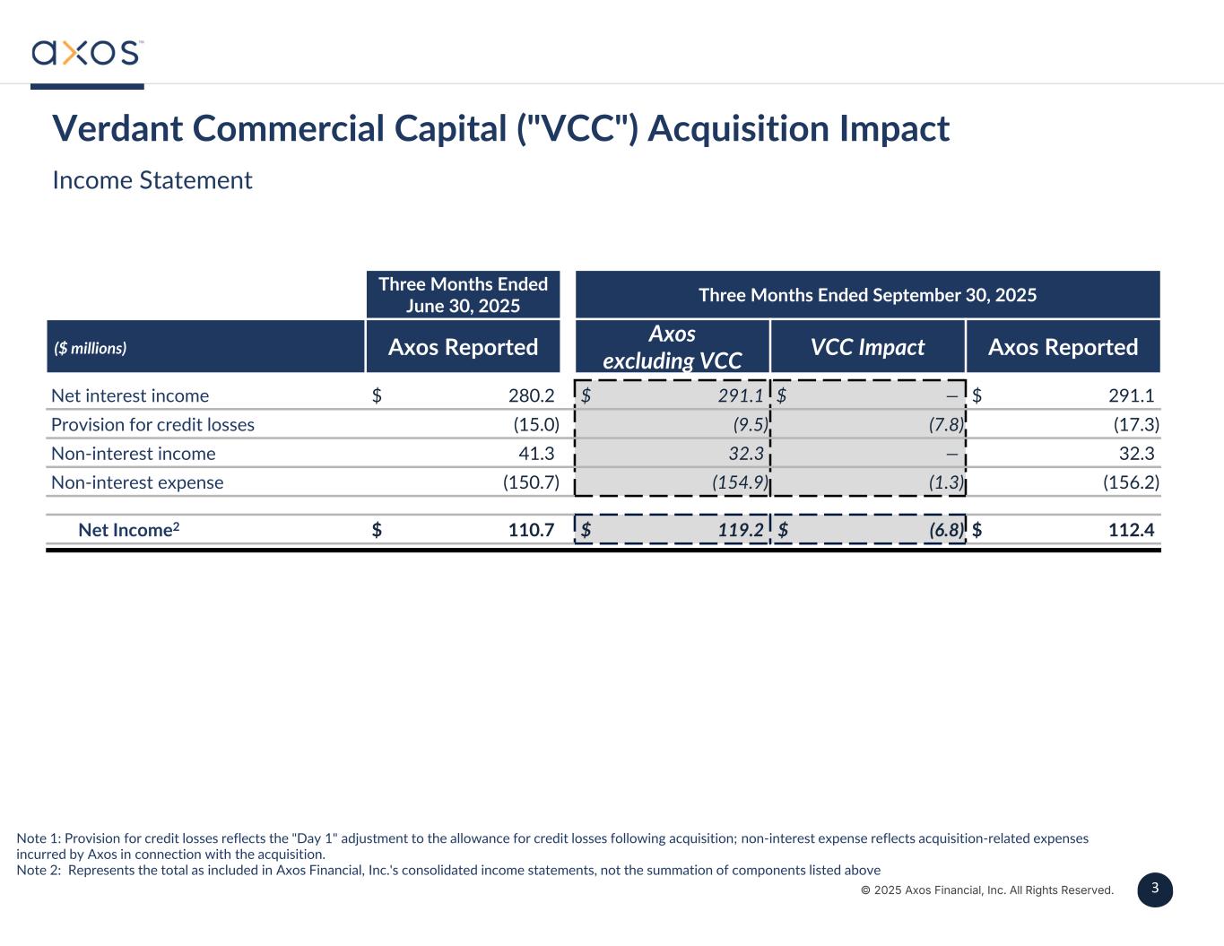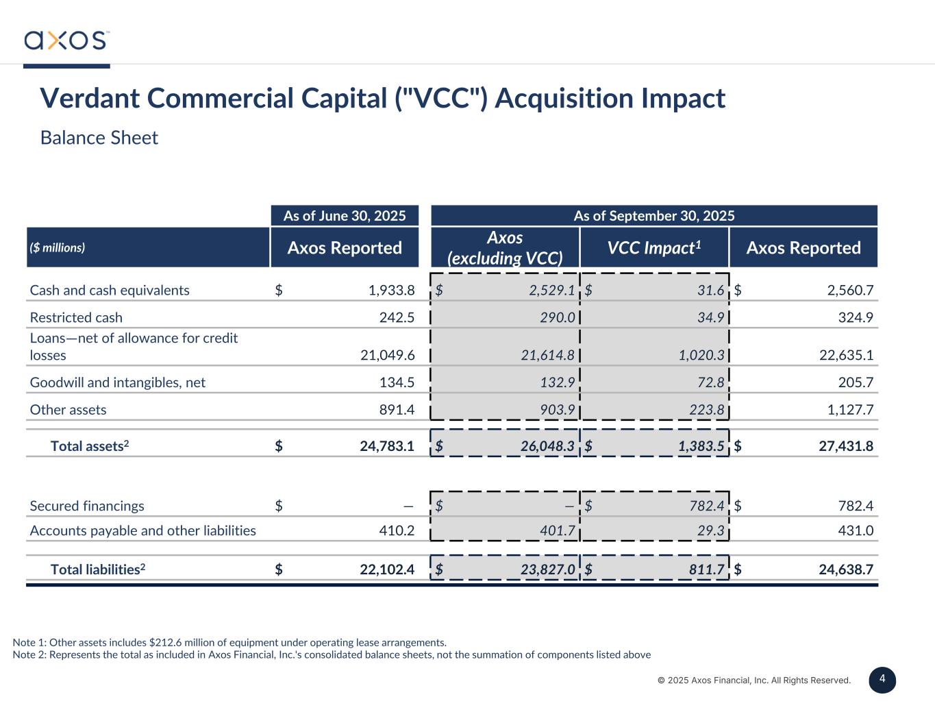 3 © 2025 Axos Financial, Inc. All Rights Reserved. 3 Three Months Ended September 30, 2025Three Months Ended June 30, 2025 Axos ReportedVCC Impact Axos excluding VCCAxos Reported($ millions) $ 291.1$ —$ 291.1$ 280.2Net interest income (17.3)(7.8)(9.5)(15.0)Provision for credit losses 32.3—32.341.3Non-interest income (156.2)(1.3)(154.9)(150.7)Non-interest expense $ 112.4$ (6.8)$ 119.2$ 110.7Net Income2 Income Statement Verdant Commercial Capital ("VCC") Acquisition Impact Note 1: Provision for credit losses reflects the "Day 1" adjustment to the allowance for credit losses following acquisition; non-interest expense reflects acquisition-related expenses incurred by Axos in connection with the acquisition. Note 2: Represents the total as included in Axos Financial, Inc.'s consolidated income statements, not the summation of components listed above