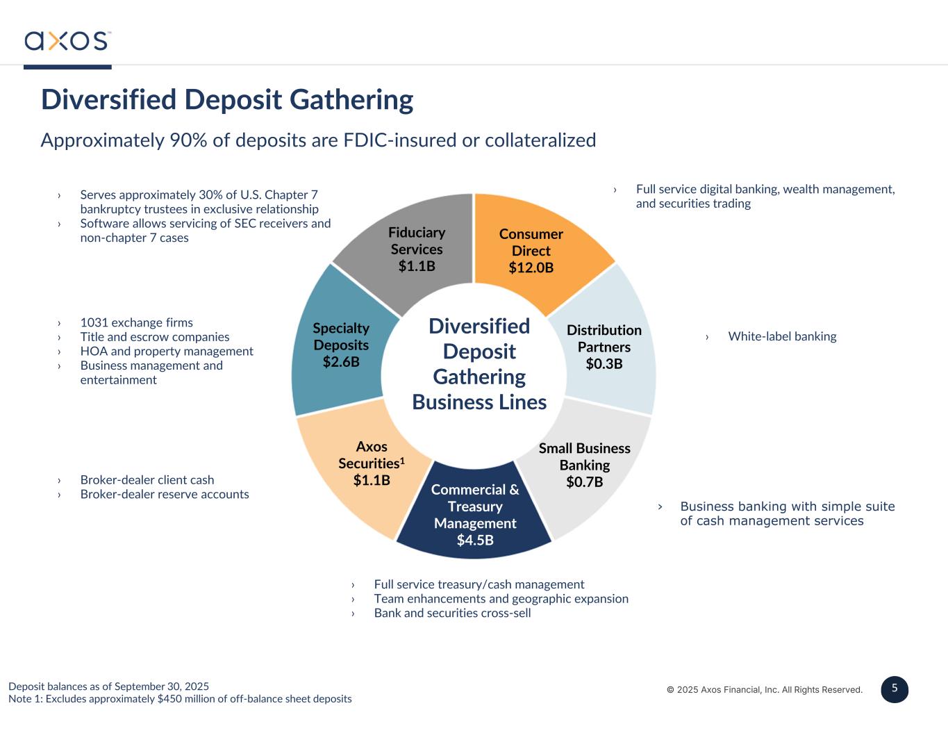 4 © 2025 Axos Financial, Inc. All Rights Reserved. 4 As of September 30, 2025As of June 30, 2025 Axos ReportedVCC Impact1Axos (excluding VCC)Axos Reported($ millions) $ 2,560.7$ 31.6$ 2,529.1$ 1,933.8Cash and cash equivalents 324.934.9290.0242.5Restricted cash 22,635.11,020.321,614.821,049.6 Loans—net of allowance for credit losses 205.772.8132.9134.5Goodwill and intangibles, net 1,127.7223.8903.9891.4Other assets $ 27,431.8$ 1,383.5$ 26,048.3$ 24,783.1Total assets2 $ 782.4$ 782.4$ —$ —Secured financings 431.029.3401.7410.2Accounts payable and other liabilities $ 24,638.7$ 811.7$ 23,827.0$ 22,102.4Total liabilities2 Note 1: Other assets includes $212.6 million of equipment under operating lease arrangements. Note 2: Represents the total as included in Axos Financial, Inc.'s consolidated balance sheets, not the summation of components listed above Balance Sheet Verdant Commercial Capital ("VCC") Acquisition Impact