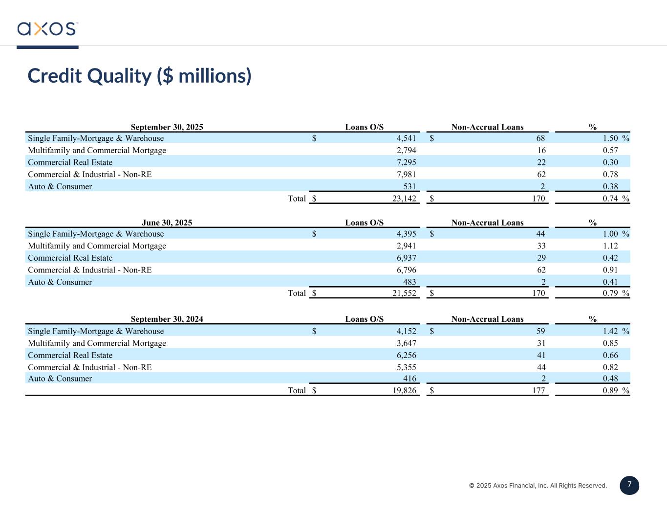 6 © 2025 Axos Financial, Inc. All Rights Reserved. 6 Change in Allowance for Credit Losses (ACL) & Unfunded Loan Commitments Reserve (UCL) ($ in millions) ACL + UCL ACL + UCL (6.4) 7.8 7.8