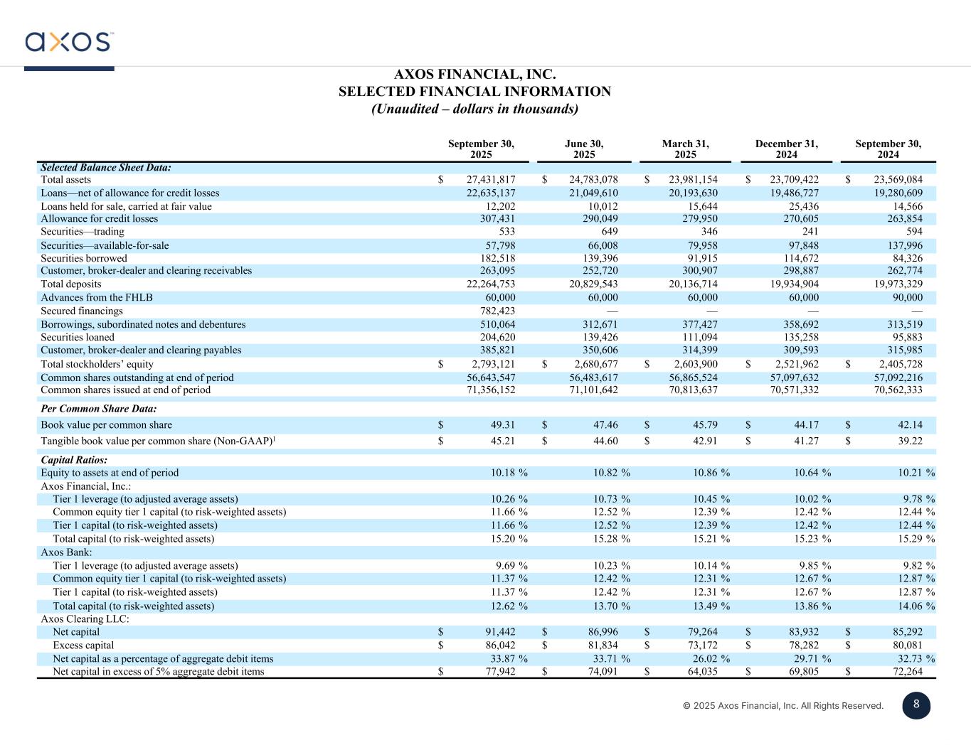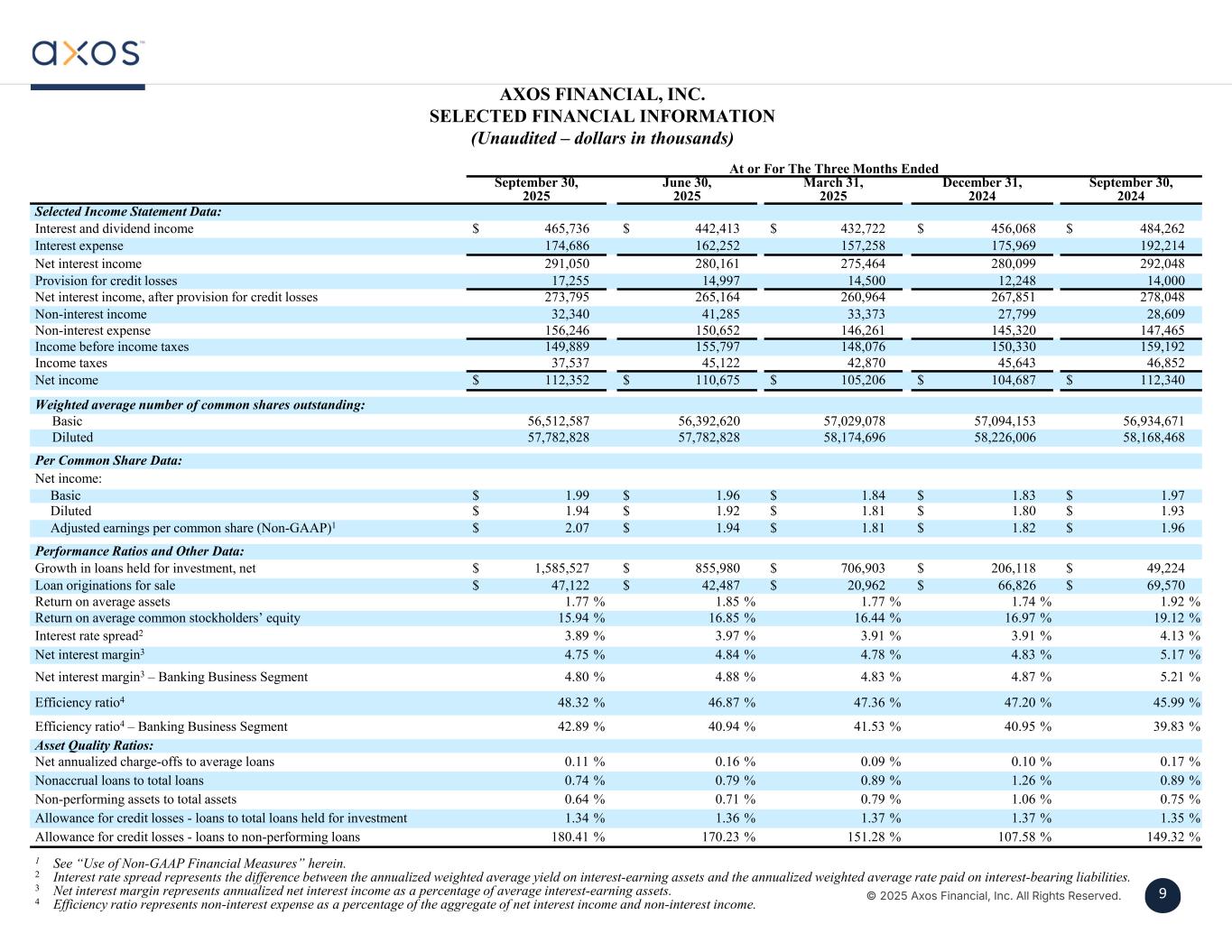8 © 2025 Axos Financial, Inc. All Rights Reserved. 8 September 30, 2024 December 31, 2024 March 31, 2025 June 30, 2025 September 30, 2025 Selected Balance Sheet Data: $ 23,569,084$ 23,709,422$ 23,981,154$ 24,783,078$ 27,431,817Total assets 19,280,60919,486,72720,193,63021,049,61022,635,137Loans—net of allowance for credit losses 14,56625,43615,64410,01212,202Loans held for sale, carried at fair value 263,854270,605279,950290,049307,431Allowance for credit losses 594241346649533Securities—trading 137,99697,84879,95866,00857,798Securities—available-for-sale 84,326114,67291,915139,396182,518Securities borrowed 262,774298,887300,907252,720263,095Customer, broker-dealer and clearing receivables 19,973,32919,934,90420,136,71420,829,54322,264,753Total deposits 90,00060,00060,00060,00060,000Advances from the FHLB ————782,423Secured financings 313,519358,692377,427312,671510,064Borrowings, subordinated notes and debentures 95,883135,258111,094139,426204,620Securities loaned 315,985309,593314,399350,606385,821Customer, broker-dealer and clearing payables $ 2,405,728$ 2,521,962$ 2,603,900$ 2,680,677$ 2,793,121Total stockholders’ equity 57,092,21657,097,63256,865,52456,483,61756,643,547Common shares outstanding at end of period 70,562,33370,571,33270,813,63771,101,64271,356,152Common shares issued at end of period Per Common Share Data: $ 42.14$ 44.17$ 45.79$ 47.46$ 49.31Book value per common share $ 39.22$ 41.27$ 42.91$ 44.60$ 45.21Tangible book value per common share (Non-GAAP)1 Capital Ratios: 10.21 %10.64 %10.86 %10.82 %10.18 %Equity to assets at end of period Axos Financial, Inc.: 9.78 %10.02 %10.45 %10.73 %10.26 %Tier 1 leverage (to adjusted average assets) 12.44 %12.42 %12.39 %12.52 %11.66 %Common equity tier 1 capital (to risk-weighted assets) 12.44 %12.42 %12.39 %12.52 %11.66 %Tier 1 capital (to risk-weighted assets) 15.29 %15.23 %15.21 %15.28 %15.20 %Total capital (to risk-weighted assets) Axos Bank: 9.82 %9.85 %10.14 %10.23 %9.69 %Tier 1 leverage (to adjusted average assets) 12.87 %12.67 %12.31 %12.42 %11.37 %Common equity tier 1 capital (to risk-weighted assets) 12.87 %12.67 %12.31 %12.42 %11.37 %Tier 1 capital (to risk-weighted assets) 14.06 %13.86 %13.49 %13.70 %12.62 %Total capital (to risk-weighted assets) Axos Clearing LLC: $ 85,292$ 83,932$ 79,264$ 86,996$ 91,442Net capital $ 80,081$ 78,282$ 73,172$ 81,834$ 86,042Excess capital 32.73 %29.71 %26.02 %33.71 %33.87 %Net capital as a percentage of aggregate debit items $ 72,264$ 69,805$ 64,035$ 74,091$ 77,942Net capital in excess of 5% aggregate debit items AXOS FINANCIAL, INC. SELECTED FINANCIAL INFORMATION (Unaudited – dollars in thousands)