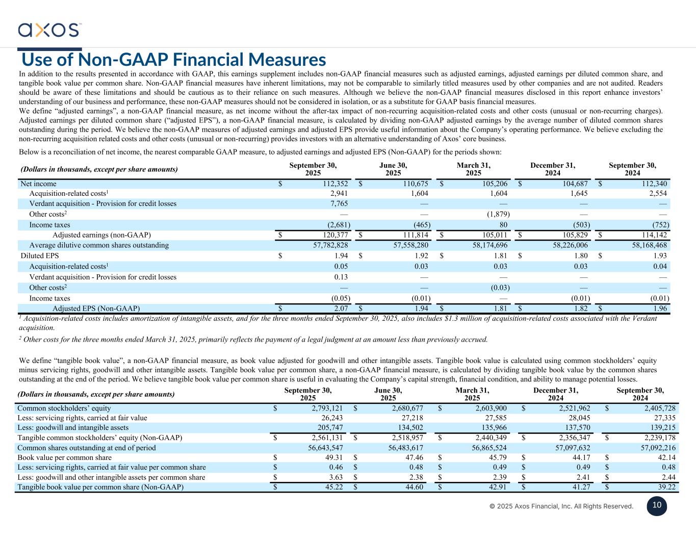9 © 2025 Axos Financial, Inc. All Rights Reserved. 9 At or For The Three Months Ended September 30, 2024 December 31, 2024 March 31, 2025 June 30, 2025 September 30, 2025 Selected Income Statement Data: $ 484,262$ 456,068$ 432,722$ 442,413$ 465,736Interest and dividend income 192,214175,969157,258162,252174,686Interest expense 292,048280,099275,464280,161291,050Net interest income 14,00012,24814,50014,99717,255Provision for credit losses 278,048267,851260,964265,164273,795Net interest income, after provision for credit losses 28,60927,79933,37341,28532,340Non-interest income 147,465145,320146,261150,652156,246Non-interest expense 159,192150,330148,076155,797149,889Income before income taxes 46,85245,64342,87045,12237,537Income taxes $ 112,340$ 104,687$ 105,206$ 110,675$ 112,352Net income Weighted average number of common shares outstanding: 56,934,67157,094,15357,029,07856,392,62056,512,587Basic 58,168,46858,226,00658,174,69657,782,82857,782,828Diluted Per Common Share Data: Net income: $ 1.97$ 1.83$ 1.84$ 1.96$ 1.99Basic $ 1.93$ 1.80$ 1.81$ 1.92$ 1.94Diluted $ 1.96$ 1.82$ 1.81$ 1.94$ 2.07Adjusted earnings per common share (Non-GAAP)1 Performance Ratios and Other Data: $ 49,224$ 206,118$ 706,903$ 855,980$ 1,585,527Growth in loans held for investment, net $ 69,570$ 66,826$ 20,962$ 42,487$ 47,122Loan originations for sale 1.92 %1.74 %1.77 %1.85 %1.77 %Return on average assets 19.12 %16.97 %16.44 %16.85 %15.94 %Return on average common stockholders’ equity 4.13 %3.91 %3.91 %3.97 %3.89 %Interest rate spread2 5.17 %4.83 %4.78 %4.84 %4.75 %Net interest margin3 5.21 %4.87 %4.83 %4.88 %4.80 %Net interest margin3 – Banking Business Segment 45.99 %47.20 %47.36 %46.87 %48.32 %Efficiency ratio4 39.83 %40.95 %41.53 %40.94 %42.89 %Efficiency ratio4 – Banking Business Segment Asset Quality Ratios: 0.17 %0.10 %0.09 %0.16 %0.11 %Net annualized charge-offs to average loans 0.89 %1.26 %0.89 %0.79 %0.74 %Nonaccrual loans to total loans 0.75 %1.06 %0.79 %0.71 %0.64 %Non-performing assets to total assets 1.35 %1.37 %1.37 %1.36 %1.34 %Allowance for credit losses - loans to total loans held for investment 149.32 %107.58 %151.28 %170.23 %180.41 %Allowance for credit losses - loans to non-performing loans 1 See “Use of Non-GAAP Financial Measures” herein. 2 Interest rate spread represents the difference between the annualized weighted average yield on interest-earning assets and the annualized weighted average rate paid on interest-bearing liabilities. 3 Net interest margin represents annualized net interest income as a percentage of average interest-earning assets. 4 Efficiency ratio represents non-interest expense as a percentage of the aggregate of net interest income and non-interest income. AXOS FINANCIAL, INC. SELECTED FINANCIAL INFORMATION (Unaudited – dollars in thousands)