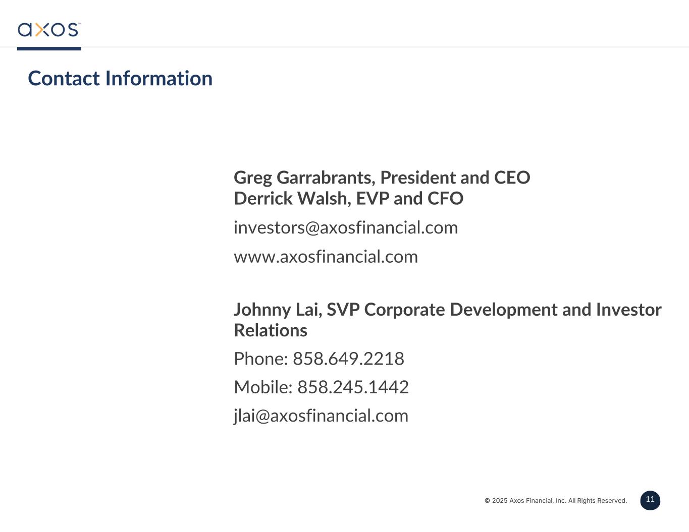 10 © 2025 Axos Financial, Inc. All Rights Reserved. 10 September 30, 2024 December 31, 2024 March 31, 2025 June 30, 2025 September 30, 2025(Dollars in thousands, except per share amounts) $ 112,340$ 104,687$ 105,206$ 110,675$ 112,352Net income 2,5541,6451,6041,6042,941Acquisition-related costs1 ————7,765Verdant acquisition - Provision for credit losses ——(1,879)——Other costs2 (752)(503)80(465)(2,681)Income taxes $ 114,142$ 105,829$ 105,011$ 111,814$ 120,377Adjusted earnings (non-GAAP) 58,168,46858,226,00658,174,69657,558,28057,782,828Average dilutive common shares outstanding $ 1.93$ 1.80$ 1.81$ 1.92$ 1.94Diluted EPS 0.040.030.030.030.05Acquisition-related costs1 ————0.13Verdant acquisition - Provision for credit losses ——(0.03)——Other costs2 (0.01)(0.01)—(0.01)(0.05)Income taxes $ 1.96$ 1.82$ 1.81$ 1.94$ 2.07Adjusted EPS (Non-GAAP) 1 Acquisition-related costs includes amortization of intangible assets, and for the three months ended September 30, 2025, also includes $1.3 million of acquisition-related costs associated with the Verdant acquisition. 2 Other costs for the three months ended March 31, 2025, primarily reflects the payment of a legal judgment at an amount less than previously accrued. We define “tangible book value”, a non-GAAP financial measure, as book value adjusted for goodwill and other intangible assets. Tangible book value is calculated using common stockholders’ equity minus servicing rights, goodwill and other intangible assets. Tangible book value per common share, a non-GAAP financial measure, is calculated by dividing tangible book value by the common shares outstanding at the end of the period. We believe tangible book value per common share is useful in evaluating the Company’s capital strength, financial condition, and ability to manage potential losses. Below is a reconciliation of total stockholders’ equity, the nearest comparable GAAP measure, to tangible book value per common share (non-GAAP) as of the dates indicated: September 30, 2024 December 31, 2024 March 31, 2025 June 30, 2025 September 30, 2025(Dollars in thousands, except per share amounts) $ 2,405,728$ 2,521,962$ 2,603,900$ 2,680,677$ 2,793,121Common stockholders’ equity 27,33528,04527,58527,21826,243Less: servicing rights, carried at fair value 139,215137,570135,966134,502205,747Less: goodwill and intangible assets $ 2,239,178$ 2,356,347$ 2,440,349$ 2,518,957$ 2,561,131Tangible common stockholders’ equity (Non-GAAP) 57,092,21657,097,63256,865,52456,483,61756,643,547Common shares outstanding at end of period $ 42.14$ 44.17$ 45.79$ 47.46$ 49.31Book value per common share $ 0.48$ 0.49$ 0.49$ 0.48$ 0.46Less: servicing rights, carried at fair value per common share $ 2.44$ 2.41$ 2.39$ 2.38$ 3.63Less: goodwill and other intangible assets per common share $ 39.22$ 41.27$ 42.91$ 44.60$ 45.22Tangible book value per common share (Non-GAAP) In addition to the results presented in accordance with GAAP, this earnings supplement includes non-GAAP financial measures such as adjusted earnings, adjusted earnings per diluted common share, and tangible book value per common share. Non-GAAP financial measures have inherent limitations, may not be comparable to similarly titled measures used by other companies and are not audited. Readers should be aware of these limitations and should be cautious as to their reliance on such measures. Although we believe the non-GAAP financial measures disclosed in this report enhance investors’ understanding of our business and performance, these non-GAAP measures should not be considered in isolation, or as a substitute for GAAP basis financial measures. We define “adjusted earnings”, a non-GAAP financial measure, as net income without the after-tax impact of non-recurring acquisition-related costs and other costs (unusual or non-recurring charges). Adjusted earnings per diluted common share (“adjusted EPS”), a non-GAAP financial measure, is calculated by dividing non-GAAP adjusted earnings by the average number of diluted common shares outstanding during the period. We believe the non-GAAP measures of adjusted earnings and adjusted EPS provide useful information about the Company’s operating performance. We believe excluding the non-recurring acquisition related costs and other costs (unusual or non-recurring) provides investors with an alternative understanding of Axos’ core business. Below is a reconciliation of net income, the nearest comparable GAAP measure, to adjusted earnings and adjusted EPS (Non-GAAP) for the periods shown: Use of Non-GAAP Financial Measures