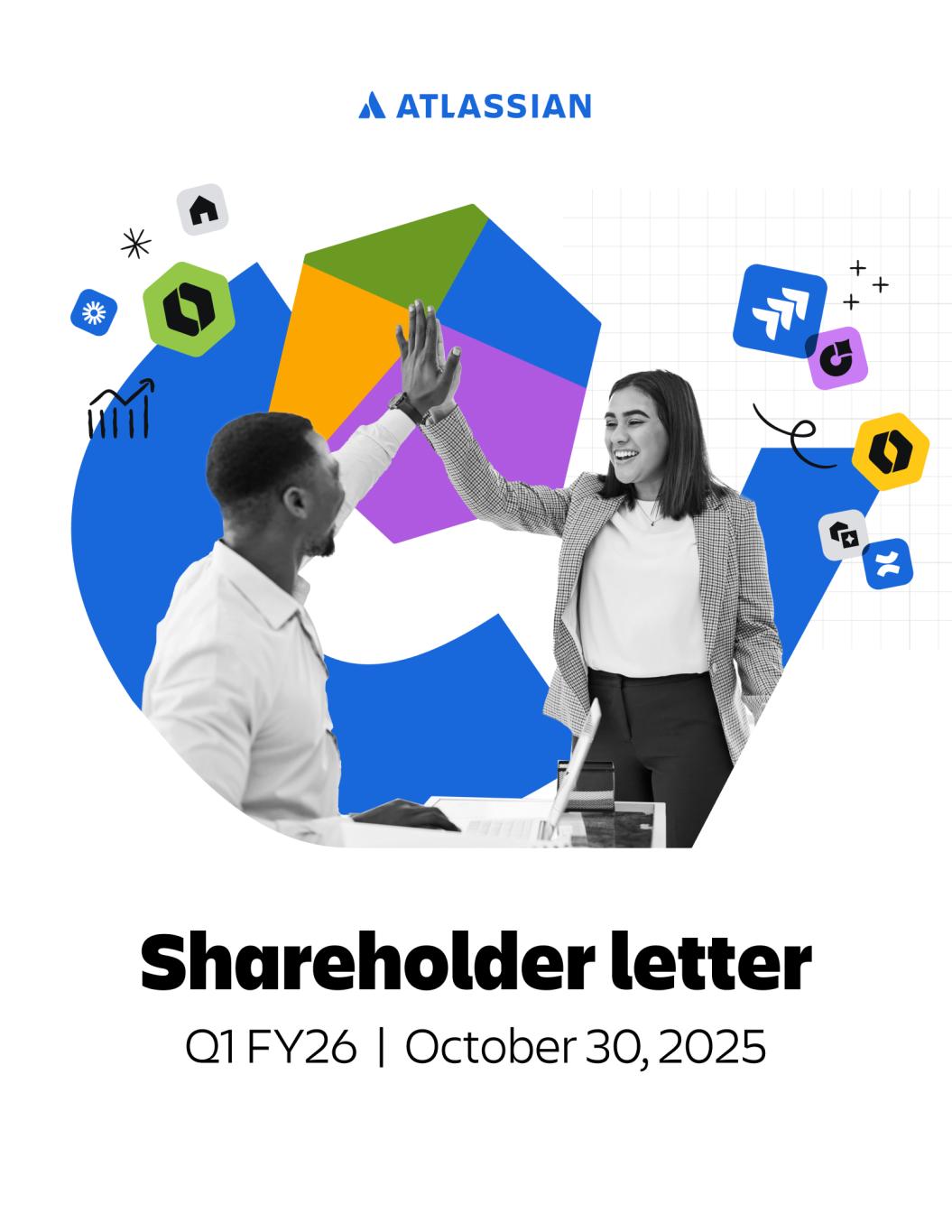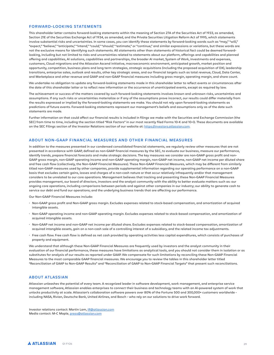Q1 FY26 29 FORWARD-LOOKING STATEMENTS This shareholder letter contains forward-looking statements within the meaning of Section 27A of the Securities Act of 1933, as amended, Section 21E of the Securities Exchange Act of 1934, as amended, and the Private Securities Litigation Reform Act of 1995, which statements involve substantial risks and uncertainties. In some cases, you can identify these statements by forward-looking words such as “may,” “will,” “expect,” “believe,” “anticipate,” “intend,” “could,” “should,” “estimate,” or “continue,” and similar expressions or variations, but these words are not the exclusive means for identifying such statements. All statements other than statements of historical fact could be deemed forward- looking, including but not limited to risks and uncertainties related to statements about our platform, offerings and capabilities and planned offering and capabilities, AI solutions, capabilities and partnerships, the broader AI market, System of Work, investments and expenses, customers, Cloud migrations and the Atlassian Ascend initiative, macroeconomic environment, anticipated growth, market position and opportunity, competition, business plans and long term strategies, strategic acquisitions (including the proposed acquisition of DX), leadership transitions, enterprise sales, outlook and results, other key strategic areas, and our financial targets such as total revenue, Cloud, Data Center, and Marketplace and other revenue and GAAP and non-GAAP financial measures including gross margin, operating margin, and share count. We undertake no obligation to update any forward-looking statements made in this shareholder letter to reflect events or circumstances after the date of this shareholder letter or to reflect new information or the occurrence of unanticipated events, except as required by law. The achievement or success of the matters covered by such forward-looking statements involves known and unknown risks, uncertainties and assumptions. If any such risks or uncertainties materialize or if any of the assumptions prove incorrect, our results could differ materially from the results expressed or implied by the forward-looking statements we make. You should not rely upon forward-looking statements as predictions of future events. Forward-looking statements represent our management’s beliefs and assumptions only as of the date such statements are made. Further information on that could affect our financial results is included in filings we make with the Securities and Exchange Commission (the SEC) from time to time, including the section titled “Risk Factors” in our most recently filed Forms 10-K and 10-Q. These documents are available on the SEC Filings section of the Investor Relations section of our website at: https://investors.atlassian.com. ABOUT NON-GAAP FINANCIAL MEASURES AND OTHER FINANCIAL MEASURES In addition to the measures presented in our condensed consolidated financial statements, we regularly review other measures that are not presented in accordance with GAAP, defined as non-GAAP financial measures by the SEC, to evaluate our business, measure our performance, identify trends, prepare financial forecasts and make strategic decisions. The key measures we consider are non-GAAP gross profit and non- GAAP gross margin, non-GAAP operating income and non-GAAP operating margin, non-GAAP net income, non-GAAP net income per diluted share and free cash flow (collectively, the Non-GAAP Financial Measures). These Non-GAAP Financial Measures, which may be different from similarly titled non-GAAP measures used by other companies, provide supplemental information regarding our operating performance on a non-GAAP basis that excludes certain gains, losses and charges of a non-cash nature or that occur relatively infrequently and/or that management considers to be unrelated to our core operations. Management believes that tracking and presenting these Non-GAAP Financial Measures provides management, our board of directors, investors and the analyst community with the ability to better evaluate matters such as: our ongoing core operations, including comparisons between periods and against other companies in our industry; our ability to generate cash to service our debt and fund our operations; and the underlying business trends that are affecting our performance. Our Non-GAAP Financial Measures include: • Non-GAAP gross profit and Non-GAAP gross margin. Excludes expenses related to stock-based compensation, and amortization of acquired intangible assets. • Non-GAAP operating income and non-GAAP operating margin. Excludes expenses related to stock-based compensation, and amortization of acquired intangible assets. • Non-GAAP net income and non-GAAP net income per diluted share. Excludes expenses related to stock-based compensation, amortization of acquired intangible assets, gain on a non-cash sale of a controlling interest of a subsidiary, and the related income tax adjustments. • Free cash flow. Free cash flow is defined as net cash provided by operating activities less capital expenditures, which consists of purchases of property and equipment. We understand that although these Non-GAAP Financial Measures are frequently used by investors and the analyst community in their evaluation of our financial performance, these measures have limitations as analytical tools, and you should not consider them in isolation or as substitutes for analysis of our results as reported under GAAP. We compensate for such limitations by reconciling these Non-GAAP Financial Measures to the most comparable GAAP financial measures. We encourage you to review the tables in this shareholder letter titled “Reconciliation of GAAP to Non-GAAP Results” and “Reconciliation of GAAP to Non-GAAP Financial Targets” that present such reconciliations. ABOUT ATLASSIAN Atlassian unleashes the potential of every team. A recognized l