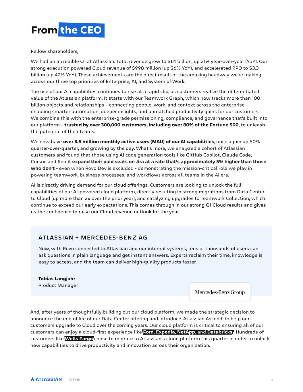 Q1 FY26 2 From the CEO Fellow shareholders, We had an incredible Q1 at Atlassian. Total revenue grew to $1.4 billion, up 21% year-over-year (YoY). Our strong execution powered Cloud revenue of $998 million (up 26% YoY), and accelerated RPO to $3.3 billion (up 42% YoY). These achievements are the direct result of the amazing headway we’re making across our three top priorities of Enterprise, AI, and System of Work. The use of our AI capabilities continues to rise at a rapid clip, as customers realize the differentiated value of the Atlassian platform. It starts with our Teamwork Graph, which now tracks more than 100 billion objects and relationships – connecting people, work, and context across the enterprise – enabling smarter automation, deeper insights, and unmatched productivity gains for our customers. We combine this with the enterprise-grade permissioning, compliance, and governance that’s built into our platform – trusted by over 300,000 customers, including over 80% of the Fortune 500, to unleash the potential of their teams. We now have over 3.5 million monthly active users (MAU) of our AI capabilities, once again up 50% quarter-over-quarter, and growing by the day. What’s more, we analyzed a cohort of Atlassian customers and found that those using AI code generation tools like GitHub Copilot, Claude Code, Cursor, and Replit expand their paid seats on Jira at a rate that’s approximately 5% higher than those who don’t - even when Rovo Dev is excluded - demonstrating the mission-critical role we play in powering teamwork, business processes, and workflows across all teams in the AI era. AI is directly driving demand for our cloud offerings. Customers are looking to unlock the full capabilities of our AI-powered cloud platform, directly resulting in strong migrations from Data Center to Cloud (up more than 2x over the prior year), and catalyzing upgrades to Teamwork Collection, which continue to exceed our early expectations. This comes through in our strong Q1 Cloud results and gives us the confidence to raise our Cloud revenue outlook for the year. Now, with Rovo connected to Atlassian and our internal systems, tens of thousands of users can ask questions in plain language and get instant answers. Experts reclaim their time, knowledge is easy to access, and the team can deliver high-quality products faster. Tobias Langjahr Product Manager ATLASSIAN + MERCEDES-BENZ AG And, after years of thoughtfully building out our cloud platform, we made the strategic decision to announce the end of life of our Data Center offering and introduce ‘Atlassian Ascend’ to help our customers upgrade to Cloud over the coming years. Our cloud platform is critical to ensuring all of our customers can enjoy a cloud-first experience like Ford, Expedia, NetApp, and Databricks . Hundreds of customers like Wells Fargo chose to migrate to Atlassian’s cloud platform this quarter in order to unlock new capabilities to drive productivity and innovation across their organization.