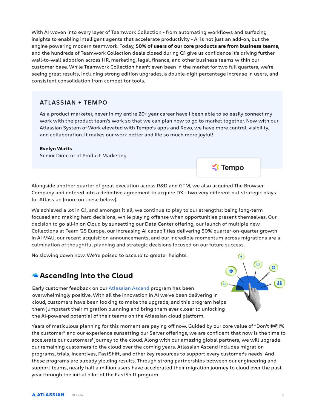 Q1 FY26 3 With AI woven into every layer of Teamwork Collection - from automating workflows and surfacing insights to enabling intelligent agents that accelerate productivity - AI is not just an add-on, but the engine powering modern teamwork. Today, 50% of users of our core products are from business teams, and the hundreds of Teamwork Collection deals closed during Q1 give us confidence it’s driving further wall-to-wall adoption across HR, marketing, legal, finance, and other business teams within our customer base. While Teamwork Collection hasn’t even been in the market for two full quarters, we’re seeing great results, including strong edition upgrades, a double-digit percentage increase in users, and consistent consolidation from competitor tools. As a product marketer, never in my entire 20+ year career have I been able to so easily connect my work with the product team’s work so that we can plan how to go to market together. Now with our Atlassian System of Work elevated with Tempo’s apps and Rovo, we have more control, visibility, and collaboration. It makes our work better and life so much more joyful! Evelyn Watts Senior Director of Product Marketing ATLASSIAN + TEMPO Alongside another quarter of great execution across R&D and GTM, we also acquired The Browser Company and entered into a definitive agreement to acquire DX - two very different but strategic plays for Atlassian (more on these below). We achieved a lot in Q1, and amongst it all, we continue to play to our strengths: being long-term focused and making hard decisions, while playing offense when opportunities present themselves. Our decision to go all-in on Cloud by sunsetting our Data Center offering, our launch of multiple new Collections at Team ’25 Europe, our increasing AI capabilities delivering 50% quarter-on-quarter growth in AI MAU, our recent acquisition announcements, and our incredible momentum across migrations are a culmination of thoughtful planning and strategic decisions focused on our future success. No slowing down now. We’re poised to ascend to greater heights. Ascending into the Cloud Early customer feedback on our Atlassian Ascend program has been overwhelmingly positive. With all the innovation in AI we’ve been delivering in cloud, customers have been looking to make the upgrade, and this program helps them jumpstart their migration planning and bring them ever closer to unlocking the AI-powered potential of their teams on the Atlassian cloud platform. Years of meticulous planning for this moment are paying off now. Guided by our core value of “Don’t #@!% the customer” and our experience sunsetting our Server offerings, we are confident that now is the time to accelerate our customers’ journey to the cloud. Along with our amazing global partners, we will upgrade our remaining customers to the cloud over the coming years. Atlassian Ascend includes migration programs, trials, incentives, FastShift, and other key resources to support every customer’s needs. And these programs are already yielding results. Through strong partnerships between our engineering and support teams, nearly half a million users have accelerated their migration journey to cloud over the past year through the initial pilot of the FastShift program.