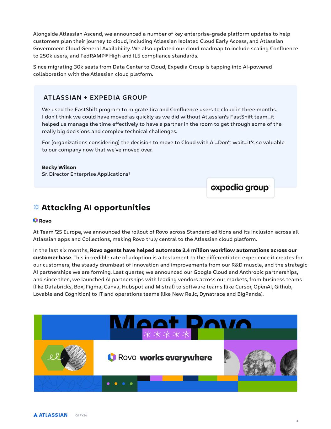Q1 FY26 4 We used the FastShift program to migrate Jira and Confluence users to cloud in three months. I don't think we could have moved as quickly as we did without Atlassian’s FastShift team...it helped us manage the time effectively to have a partner in the room to get through some of the really big decisions and complex technical challenges. For [organizations considering] the decision to move to Cloud with AI...Don't wait…it's so valuable to our company now that we've moved over. Becky Wilson Sr. Director Enterprise Applications1 ATLASSIAN + EXPEDIA GROUP Attacking AI opportunities Rovo At Team ’25 Europe, we announced the rollout of Rovo across Standard editions and its inclusion across all Atlassian apps and Collections, making Rovo truly central to the Atlassian cloud platform. In the last six months, Rovo agents have helped automate 2.4 million workflow automations across our customer base. This incredible rate of adoption is a testament to the differentiated experience it creates for our customers, the steady drumbeat of innovation and improvements from our R&D muscle, and the strategic AI partnerships we are forming. Last quarter, we announced our Google Cloud and Anthropic partnerships, and since then, we launched AI partnerships with leading vendors across our markets, from business teams (like Databricks, Box, Figma, Canva, Hubspot and Mistral) to software teams (like Cursor, OpenAI, Github, Lovable and Cognition) to IT and operations teams (like New Relic, Dynatrace and BigPanda). Alongside Atlassian Ascend, we announced a number of key enterprise-grade platform updates to help customers plan their journey to cloud, including Atlassian Isolated Cloud Early Access, and Atlassian Government Cloud General Availability. We also updated our cloud roadmap to include scaling Confluence to 250k users, and FedRAMP® High and IL5 compliance standards. Since migrating 30k seats from Data Center to Cloud, Expedia Group is tapping into AI-powered collaboration with the Atlassian cloud platform. works everywhere