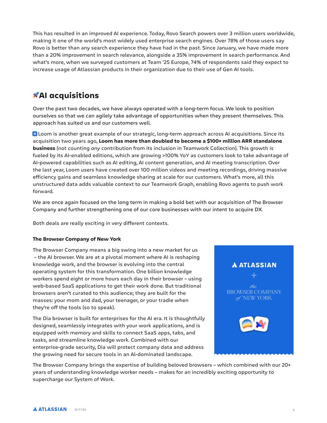 Q1 FY26 5 The Browser Company of New York The Browser Company means a big swing into a new market for us – the AI browser. We are at a pivotal moment where AI is reshaping knowledge work, and the browser is evolving into the central operating system for this transformation. One billion knowledge workers spend eight or more hours each day in their browser – using web-based SaaS applications to get their work done. But traditional browsers aren’t curated to this audience; they are built for the masses: your mom and dad, your teenager, or your tradie when they’re off the tools (so to speak). The Dia browser is built for enterprises for the AI era. It is thoughtfully designed, seamlessly integrates with your work applications, and is equipped with memory and skills to connect SaaS apps, tabs, and tasks, and streamline knowledge work. Combined with our enterprise-grade security, Dia will protect company data and address the growing need for secure tools in an Al-dominated landscape. AI acquisitions Over the past two decades, we have always operated with a long-term focus. We look to position ourselves so that we can agilely take advantage of opportunities when they present themselves. This approach has suited us and our customers well. Loom is another great example of our strategic, long-term approach across AI acquisitions. Since its acquisition two years ago, Loom has more than doubled to become a $100+ million ARR standalone business (not counting any contribution from its inclusion in Teamwork Collection). This growth is fueled by its AI-enabled editions, which are growing >100% YoY as customers look to take advantage of AI-powered capabilities such as AI editing, AI content generation, and AI meeting transcription. Over the last year, Loom users have created over 100 million videos and meeting recordings, driving massive efficiency gains and seamless knowledge sharing at scale for our customers. What’s more, all this unstructured data adds valuable context to our Teamwork Graph, enabling Rovo agents to push work forward. We are once again focused on the long term in making a bold bet with our acquisition of The Browser Company and further strengthening one of our core businesses with our intent to acquire DX. Both deals are really exciting in very different contexts. This has resulted in an improved AI experience. Today, Rovo Search powers over 3 million users worldwide, making it one of the world’s most widely used enterprise search engines. Over 78% of those users say Rovo is better than any search experience they have had in the past. Since January, we have made more than a 20% improvement in search relevance, alongside a 35% improvement in search performance. And what’s more, when we surveyed customers at Team '25 Europe, 74% of respondents said they expect to increase usage of Atlassian products in their organization due to their use of Gen AI tools. + The Browser Company brings the expertise of building beloved browsers – which combined with our 20+ years of understanding knowledge worker needs – makes for an incredibly exciting opportunity to supercharge our System of Work.