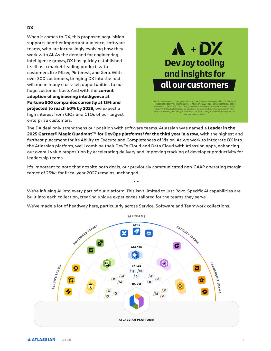 Q1 FY26 The DX deal only strengthens our position with software teams. Atlassian was named a Leader in the 2025 Gartner® Magic Quadrant™ for DevOps platforms2 for the third year in a row, with the highest and furthest placement for its Ability to Execute and Completeness of Vision. As we work to integrate DX into the Atlassian platform, we’ll combine their DevEx Cloud and Data Cloud with Atlassian apps, enhancing our overall value proposition by accelerating delivery and improving tracking of developer productivity for leadership teams. It’s important to note that despite both deals, our previously communicated non-GAAP operating margin target of 25%+ for fiscal year 2027 remains unchanged. ~~ We’re infusing AI into every part of our platform. This isn’t limited to just Rovo. Specific AI capabilities are built into each collection, creating unique experiences tailored for the teams they serve. We’ve made a lot of headway here, particularly across Service, Software and Teamwork collections. 6 DX When it comes to DX, this proposed acquisition supports another important audience, software teams, who are increasingly evolving how they work with AI. As the demand for engineering intelligence grows, DX has quickly established itself as a market-leading product, with customers like Pfizer, Pinterest, and Xero. With over 300 customers, bringing DX into the fold will mean many cross-sell opportunities to our huge customer base. And with the current adoption of engineering intelligence at Fortune 500 companies currently at 15% and projected to reach 60% by 2028, we expect a high interest from CIOs and CTOs of our largest enterprise customers. Dev Joy tooling and insights for all our customers Atlassian has entered into an agreement to acquire A Software Company, d/b/a DX. The deal is expected to close in the second quarter of Atlassian’s 2026 fiscal year, subject to regulatory approval and the satisfaction of closing conditions. References to DX and its products in this document reflect Atlassian’s general business plans for the future integration of DX with Atlassian following the closing of the transaction. Until closing, Atlassian and DX continue to operate independently.