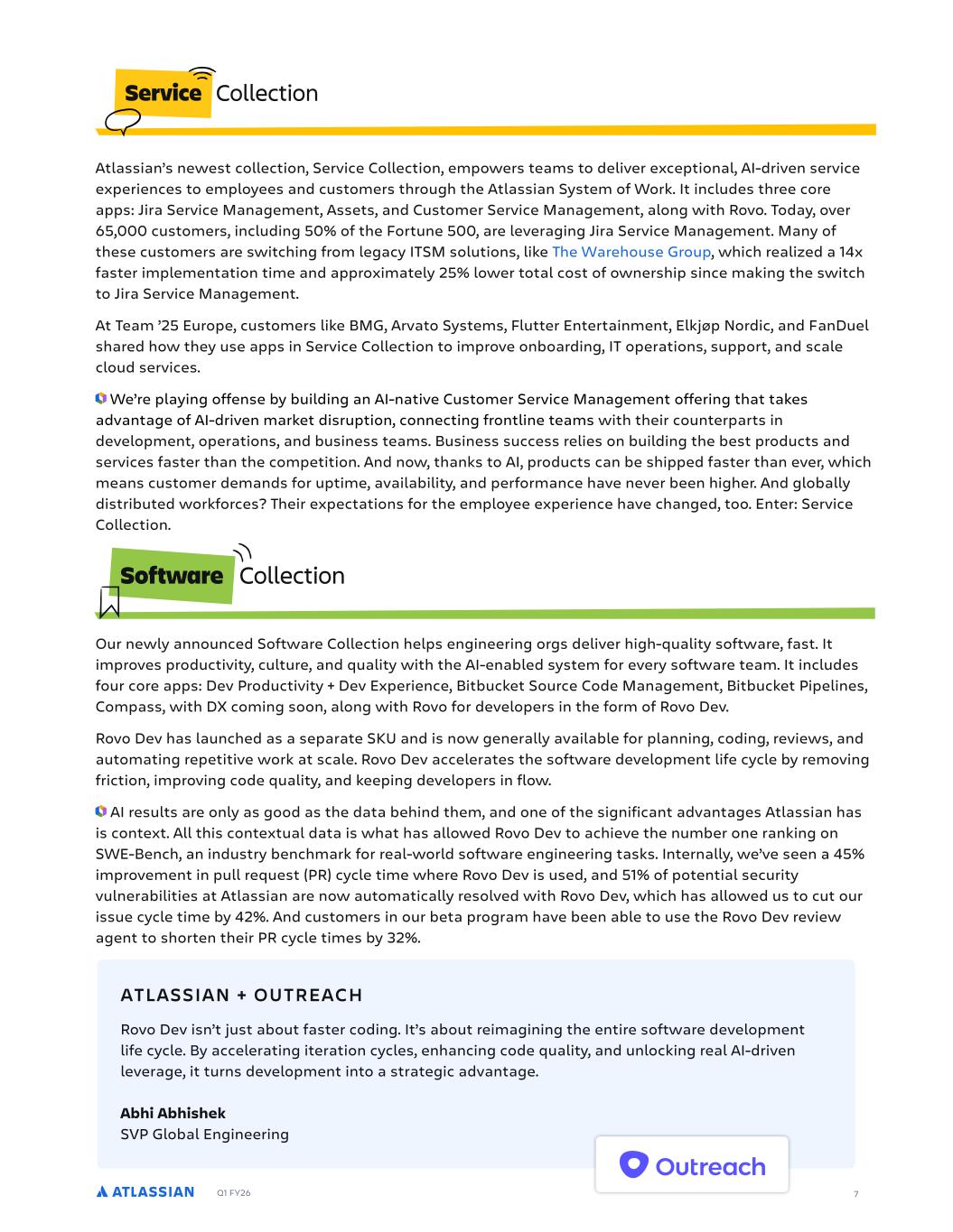 Q1 FY26 7 Our newly announced Software Collection helps engineering orgs deliver high-quality software, fast. It improves productivity, culture, and quality with the AI-enabled system for every software team. It includes four core apps: Dev Productivity + Dev Experience, Bitbucket Source Code Management, Bitbucket Pipelines, Compass, with DX coming soon, along with Rovo for developers in the form of Rovo Dev. Rovo Dev has launched as a separate SKU and is now generally available for planning, coding, reviews, and automating repetitive work at scale. Rovo Dev accelerates the software development life cycle by removing friction, improving code quality, and keeping developers in flow. AI results are only as good as the data behind them, and one of the significant advantages Atlassian has is context. All this contextual data is what has allowed Rovo Dev to achieve the number one ranking on SWE-Bench, an industry benchmark for real-world software engineering tasks. Internally, we’ve seen a 45% improvement in pull request (PR) cycle time where Rovo Dev is used, and 51% of potential security vulnerabilities at Atlassian are now automatically resolved with Rovo Dev, which has allowed us to cut our issue cycle time by 42%. And customers in our beta program have been able to use the Rovo Dev review agent to shorten their PR cycle times by 32%. Atlassian’s newest collection, Service Collection, empowers teams to deliver exceptional, AI-driven service experiences to employees and customers through the Atlassian System of Work. It includes three core apps: Jira Service Management, Assets, and Customer Service Management, along with Rovo. Today, over 65,000 customers, including 50% of the Fortune 500, are leveraging Jira Service Management. Many of these customers are switching from legacy ITSM solutions, like The Warehouse Group, which realized a 14x faster implementation time and approximately 25% lower total cost of ownership since making the switch to Jira Service Management. At Team ’25 Europe, customers like BMG, Arvato Systems, Flutter Entertainment, Elkjøp Nordic, and FanDuel shared how they use apps in Service Collection to improve onboarding, IT operations, support, and scale cloud services. We’re playing offense by building an AI-native Customer Service Management offering that takes advantage of AI-driven market disruption, connecting frontline teams with their counterparts in development, operations, and business teams. Business success relies on building the best products and services faster than the competition. And now, thanks to AI, products can be shipped faster than ever, which means customer demands for uptime, availability, and performance have never been higher. And globally distributed workforces? Their expectations for the employee experience have changed, too. Enter: Service Collection. Rovo Dev isn’t just about faster coding. It’s about reimagining the entire software development life cycle. By accelerating iteration cycles, enhancing code quality, and unlocking real AI-driven leverage, it turns development into a strategic advantage. Abhi Abhishek SVP Global Engineering ATLASSIAN + OUTREACH