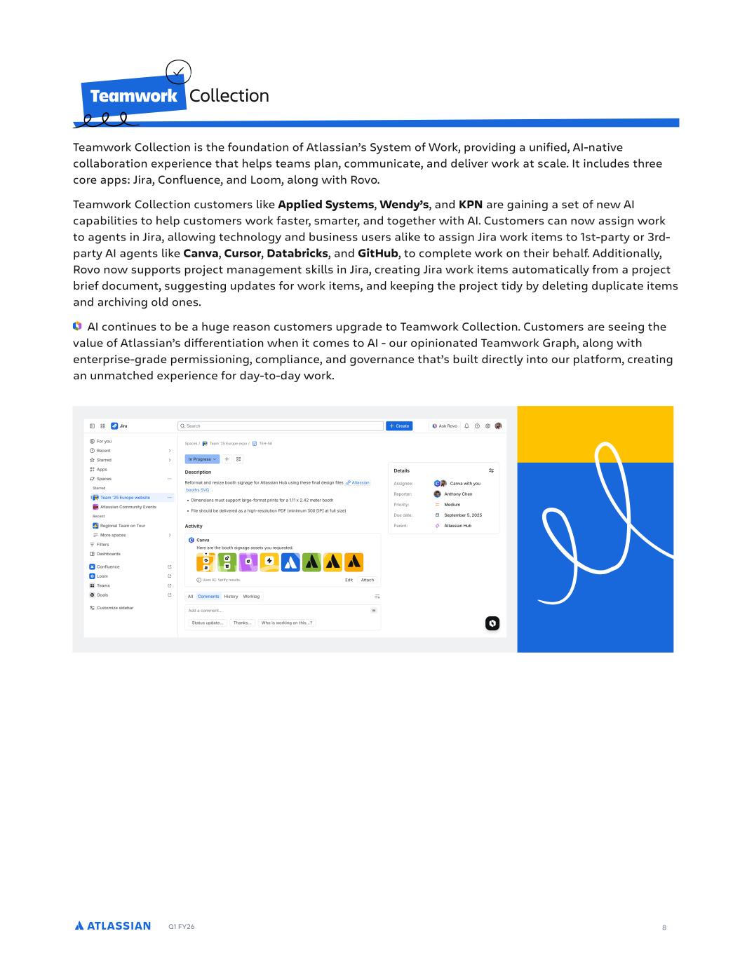 Q1 FY26 8 Teamwork Collection is the foundation of Atlassian’s System of Work, providing a unified, AI-native collaboration experience that helps teams plan, communicate, and deliver work at scale. It includes three core apps: Jira, Confluence, and Loom, along with Rovo. Teamwork Collection customers like Applied Systems, Wendy’s, and KPN are gaining a set of new AI capabilities to help customers work faster, smarter, and together with AI. Customers can now assign work to agents in Jira, allowing technology and business users alike to assign Jira work items to 1st-party or 3rd- party AI agents like Canva, Cursor, Databricks, and GitHub, to complete work on their behalf. Additionally, Rovo now supports project management skills in Jira, creating Jira work items automatically from a project brief document, suggesting updates for work items, and keeping the project tidy by deleting duplicate items and archiving old ones. AI continues to be a huge reason customers upgrade to Teamwork Collection. Customers are seeing the value of Atlassian’s differentiation when it comes to AI - our opinionated Teamwork Graph, along with enterprise-grade permissioning, compliance, and governance that’s built directly into our platform, creating an unmatched experience for day-to-day work.