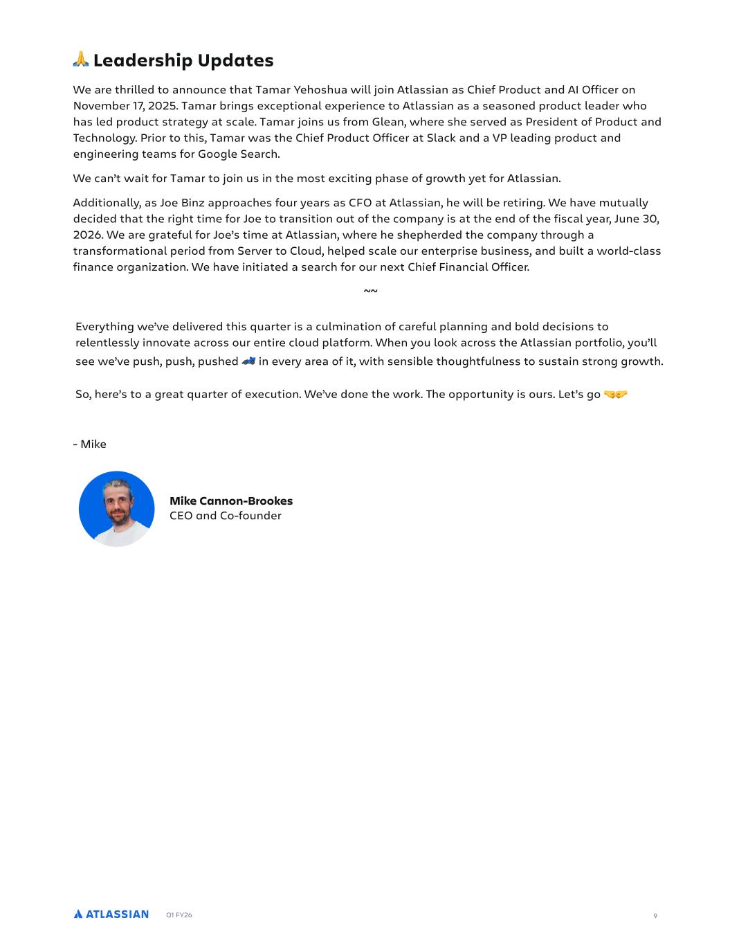 Q1 FY26 Everything we’ve delivered this quarter is a culmination of careful planning and bold decisions to relentlessly innovate across our entire cloud platform. When you look across the Atlassian portfolio, you’ll see we’ve push, push, pushed in every area of it, with sensible thoughtfulness to sustain strong growth. So, here’s to a great quarter of execution. We’ve done the work. The opportunity is ours. Let’s go 🤜🤛 9 Leadership Updates We are thrilled to announce that Tamar Yehoshua will join Atlassian as Chief Product and AI Officer on November 17, 2025. Tamar brings exceptional experience to Atlassian as a seasoned product leader who has led product strategy at scale. Tamar joins us from Glean, where she served as President of Product and Technology. Prior to this, Tamar was the Chief Product Officer at Slack and a VP leading product and engineering teams for Google Search. We can’t wait for Tamar to join us in the most exciting phase of growth yet for Atlassian. Additionally, as Joe Binz approaches four years as CFO at Atlassian, he will be retiring. We have mutually decided that the right time for Joe to transition out of the company is at the end of the fiscal year, June 30, 2026. We are grateful for Joe’s time at Atlassian, where he shepherded the company through a transformational period from Server to Cloud, helped scale our enterprise business, and built a world-class finance organization. We have initiated a search for our next Chief Financial Officer. ~~ Mike Cannon-Brookes CEO and Co-founder - Mike