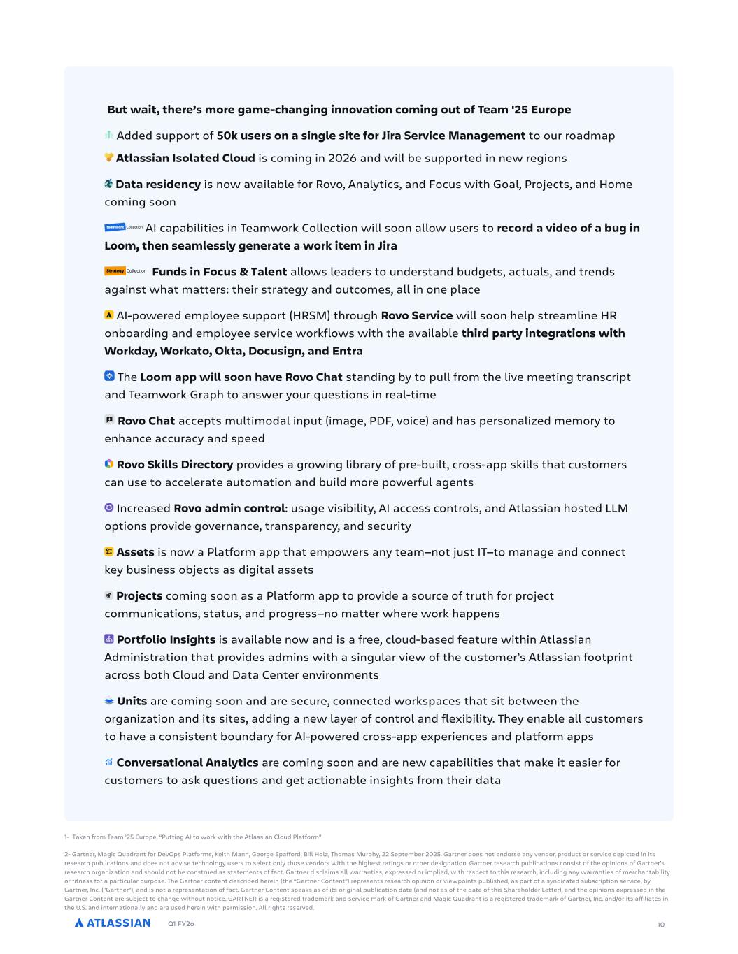 Q1 FY26 10 But wait, there’s more game-changing innovation coming out of Team '25 Europe Added support of 50k users on a single site for Jira Service Management to our roadmap Atlassian Isolated Cloud is coming in 2026 and will be supported in new regions Data residency is now available for Rovo, Analytics, and Focus with Goal, Projects, and Home coming soon AI capabilities in Teamwork Collection will soon allow users to record a video of a bug in Loom, then seamlessly generate a work item in Jira Funds in Focus & Talent allows leaders to understand budgets, actuals, and trends against what matters: their strategy and outcomes, all in one place AI-powered employee support (HRSM) through Rovo Service will soon help streamline HR onboarding and employee service workflows with the available third party integrations with Workday, Workato, Okta, Docusign, and Entra The Loom app will soon have Rovo Chat standing by to pull from the live meeting transcript and Teamwork Graph to answer your questions in real-time Rovo Chat accepts multimodal input (image, PDF, voice) and has personalized memory to enhance accuracy and speed Rovo Skills Directory provides a growing library of pre-built, cross-app skills that customers can use to accelerate automation and build more powerful agents Increased Rovo admin control: usage visibility, AI access controls, and Atlassian hosted LLM options provide governance, transparency, and security Assets is now a Platform app that empowers any team—not just IT—to manage and connect key business objects as digital assets Projects coming soon as a Platform app to provide a source of truth for project communications, status, and progress—no matter where work happens Portfolio Insights is available now and is a free, cloud-based feature within Atlassian Administration that provides admins with a singular view of the customer’s Atlassian footprint across both Cloud and Data Center environments Units are coming soon and are secure, connected workspaces that sit between the organization and its sites, adding a new layer of control and flexibility. They enable all customers to have a consistent boundary for AI-powered cross-app experiences and platform apps Conversational Analytics are coming soon and are new capabilities that make it easier for customers to ask questions and get actionable insights from their data 1- Taken from Team ’25 Europe, “Putting AI to work with the Atlassian Cloud Platform” 2- Gartner, Magic Quadrant for DevOps Platforms, Keith Mann, George Spafford, Bill Holz, Thomas Murphy, 22 September 2025. Gartner does not endorse any vendor, product or service depicted in its research publications and does not advise technology users to select only those vendors with the highest ratings or other designation. Gartner research publications consist of the opinions of Gartner’s research organization and should not be construed as statements of fact. Gartner disclaims all warranties, expressed or implied, with respect to this research, including any warranties of merchantability or fitness for a particular purpose. The Gartner content described herein (the “Gartner Content”) represents research opinion or viewpoints published, as part of a syndicated subscription service, by Gartner, Inc. ("Gartner"), and is not a representation of fact. Gartner Content speaks as of its original publication date (and not as of the date of this Shareholder Letter), and the opinions expressed in the Gartner Content are subject to change without notice. GARTNER is a registered trademark and service mark of Gartner and Magic Quadrant is a registered trademark of Gartner, Inc. and/or its affiliates in the U.S. and internationally and are used herein with permission. All rights reserved.