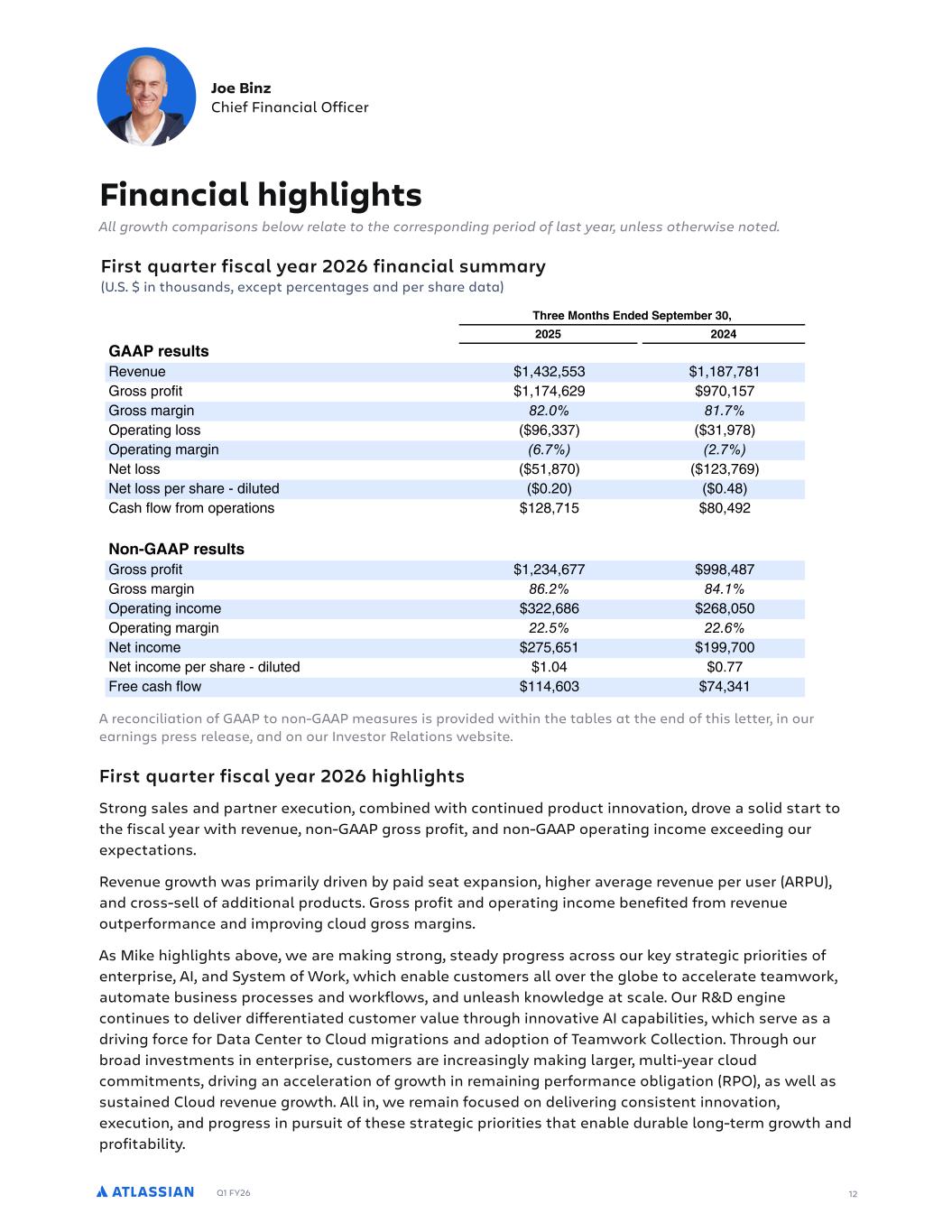 Q1 FY26 12 A reconciliation of GAAP to non-GAAP measures is provided within the tables at the end of this letter, in our earnings press release, and on our Investor Relations website. Joe Binz Chief Financial Officer Financial highlights All growth comparisons below relate to the corresponding period of last year, unless otherwise noted. DLMN.OLN#LIAADM!FS#L%%AD++!DFMOGGLS G.PFL4O".%OCTACMPMCNOF"NC%"P"".%MCNAC.P"ECO CL##3I+NCM+"#"#-N#G #L %% %%' 0 6L#MOFNM CRC.4C )() .--. 6NLOOMNLDGP - ,( - - 6NLOO-"NEG. % :MCN"PG.E,LOO ,))- ) -. :MCN"PG.E-"NEG. ) % 9CP,LOO .- ()-, 9CP,LOOMCNOF"NC$%G,4PC% %( % . 2"OFD,LSDNL-LMCN"PGL.O (.- . ( 4I+0 6L#MOFNM 6NLOOMNLDGP () ,-- . .- 6NLOO-"NEG. )% :MCN"PG.EG.AL-C )((,., (,. :MCN"PG.E-"NEG. %%( %%) 9CPG.AL-C (-, - 9CPG.AL-CMCNOF"NC$%G,4PC% % %-- 5NCCA"OFD,LS , ) - ) . First quarter fiscal year 2026 highlights Strong sales and partner execution, combined with continued product innovation, drove a solid start to the fiscal year with revenue, non-GAAP gross profit, and non-GAAP operating income exceeding our expectations. Revenue growth was primarily driven by paid seat expansion, higher average revenue per user (ARPU), and cross-sell of additional products. Gross profit and operating income benefited from revenue outperformance and improving cloud gross margins. As Mike highlights above, we are making strong, steady progress across our key strategic priorities of enterprise, AI, and System of Work, which enable customers all over the globe to accelerate teamwork, automate business processes and workflows, and unleash knowledge at scale. Our R&D engine continues to deliver differentiated customer value through innovative AI capabilities, which serve as a driving force for Data Center to Cloud migrations and adoption of Teamwork Collection. Through our broad investments in enterprise, customers are increasingly making larger, multi-year cloud commitments, driving an acceleration of growth in remaining performance obligation (RPO), as well as sustained Cloud revenue growth. All in, we remain focused on delivering consistent innovation, execution, and progress in pursuit of these strategic priorities that enable durable long-term growth and profitability. First quarter fiscal year 2026 financial summary (U.S. $ in thousands, except percentages and per share data)