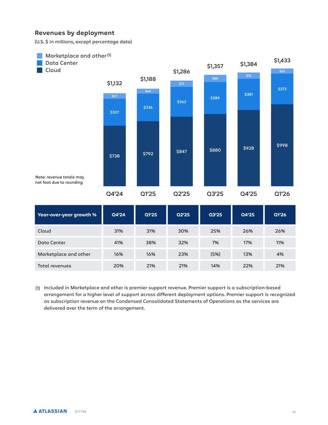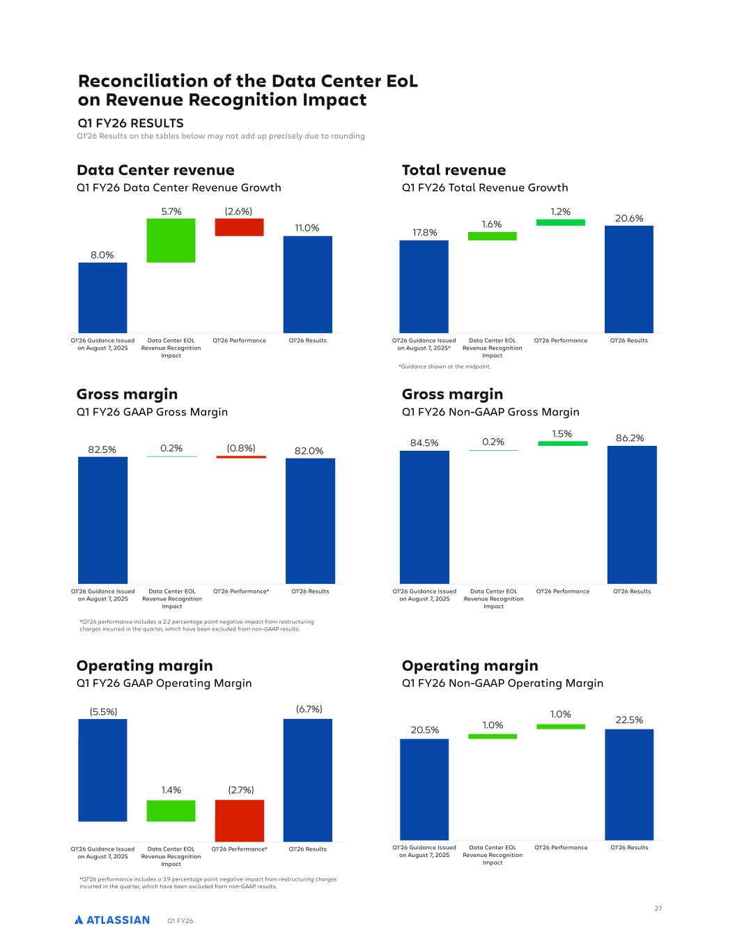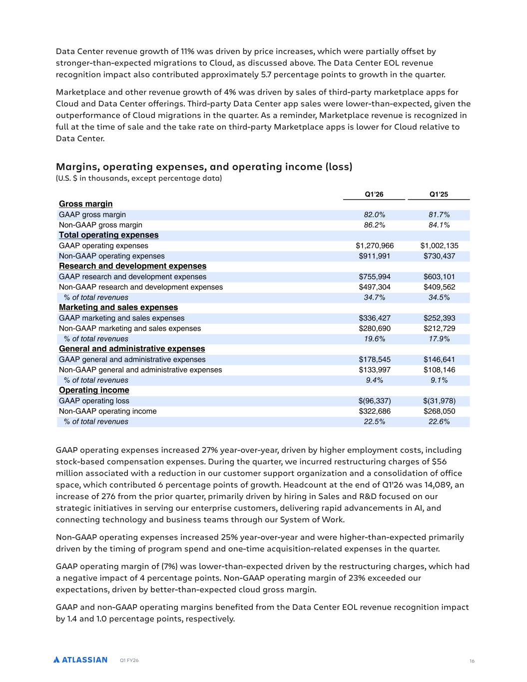 Q1 FY26 16 Data Center revenue growth of 11% was driven by price increases, which were partially offset by stronger-than-expected migrations to Cloud, as discussed above. The Data Center EOL revenue recognition impact also contributed approximately 5.7 percentage points to growth in the quarter. Marketplace and other revenue growth of 4% was driven by sales of third-party marketplace apps for Cloud and Data Center offerings. Third-party Data Center app sales were lower-than-expected, given the outperformance of Cloud migrations in the quarter. As a reminder, Marketplace revenue is recognized in full at the time of sale and the take rate on third-party Marketplace apps is lower for Cloud relative to Data Center. Margins, operating expenses, and operating income (loss) (U.S. $ in thousands, except percentage data) GAAP operating expenses increased 27% year-over-year, driven by higher employment costs, including stock-based compensation expenses. During the quarter, we incurred restructuring charges of $56 million associated with a reduction in our customer support organization and a consolidation of office space, which contributed 6 percentage points of growth. Headcount at the end of Q1’26 was 14,089, an increase of 276 from the prior quarter, primarily driven by hiring in Sales and R&D focused on our strategic initiatives in serving our enterprise customers, delivering rapid advancements in AI, and connecting technology and business teams through our System of Work. Non-GAAP operating expenses increased 25% year-over-year and were higher-than-expected primarily driven by the timing of program spend and one-time acquisition-related expenses in the quarter. GAAP operating margin of (7%) was lower-than-expected driven by the restructuring charges, which had a negative impact of 4 percentage points. Non-GAAP operating margin of 23% exceeded our expectations, driven by better-than-expected cloud gross margin. GAAP and non-GAAP operating margins benefited from the Data Center EOL revenue recognition impact by 1.4 and 1.0 percentage points, respectively. DLMN.OLN#LIAADM!F%%GLBD+M+"I-#LND+B#R-#+M#MOGGLS G.PFL4O".%OCTACMPMCNOF"NC%"P"".%MCNAC.P"EC T % % 0LIMMGLBD+ 9 9 611ENLOO-"NEG. % 9L.$611ENLOO-"NEG. )% INFI-#LND+B#R-#+M#M 611LMCN"PG.ECTMC.OCO (- ,, ( ) 9L.$611LMCN"PG.ECTMC.OCO -) )- #M#L!C+""#P#FI-G#+N#R-#+M#M 611NCOC"NAF".%%CRC,LM-C.PCTMC.OCO - , ) 9L.$611NCOC"NAF".%%CRC,LM-C.PCTMC.OCO -) ,( 252503.7.16.4 ( 3LE#ND+B+"MF#M#R-#+M#M 611-"N+CPG.E".%O",COCTMC.OCO )), (- (()) 9L.$611-"N+CPG.E".%O",COCTMC.OCO (. , ( (-( 252503.7.16.4 ) 0#+#LF+""GD+DMNLNDP##R-#+M#M 611EC.CN",".%"%-G.GOPN"PGRCCTMC.OCO -. ,, 9L.$611EC.CN",".%"%-G.GOPN"PGRCCTMC.OCO ))- . , 252503.7.16.4 5-#LND+BD+!IG# 611LMCN"PG.E,LOO ,))- ) -. 9L.$611LMCN"PG.EG.AL-C )((,., (,. 252503.7.16.4 %%( %%)