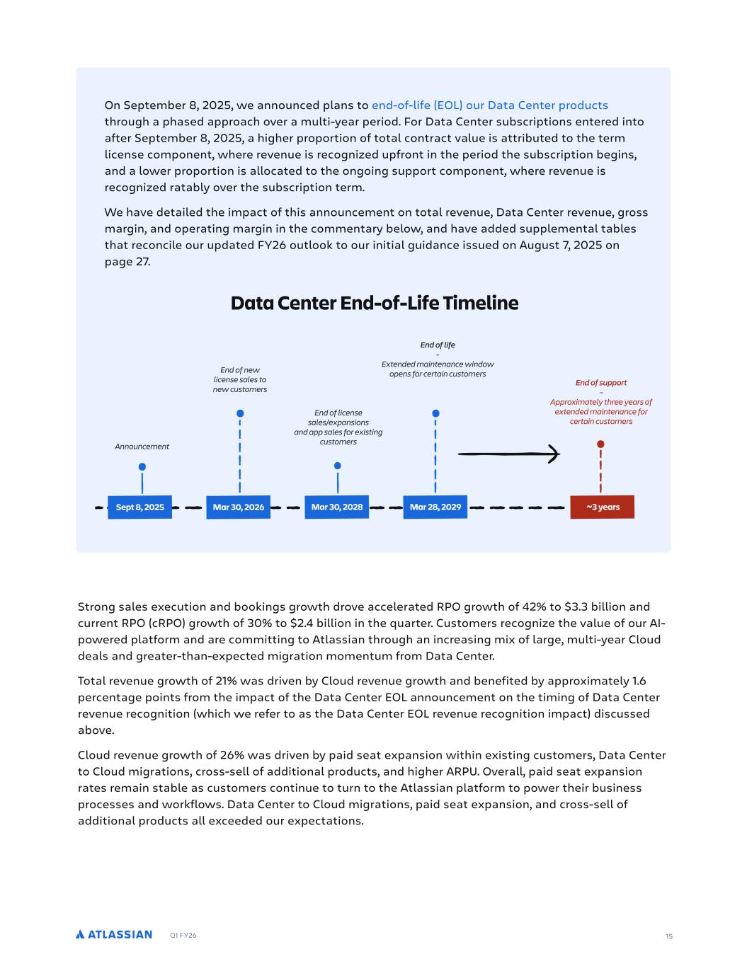 Q1 FY26 15 On September 8, 2025, we announced plans to end-of-life (EOL) our Data Center products through a phased approach over a multi-year period. For Data Center subscriptions entered into after September 8, 2025, a higher proportion of total contract value is attributed to the term license component, where revenue is recognized upfront in the period the subscription begins, and a lower proportion is allocated to the ongoing support component, where revenue is recognized ratably over the subscription term. We have detailed the impact of this announcement on total revenue, Data Center revenue, gross margin, and operating margin in the commentary below, and have added supplemental tables that reconcile our updated FY26 outlook to our initial guidance issued on August 7, 2025 on page 27. Strong sales execution and bookings growth drove accelerated RPO growth of 42% to $3.3 billion and current RPO (cRPO) growth of 30% to $2.4 billion in the quarter. Customers recognize the value of our AI- powered platform and are committing to Atlassian through an increasing mix of large, multi-year Cloud deals and greater-than-expected migration momentum from Data Center. Total revenue growth of 21% was driven by Cloud revenue growth and benefited by approximately 1.6 percentage points from the impact of the Data Center EOL announcement on the timing of Data Center revenue recognition (which we refer to as the Data Center EOL revenue recognition impact) discussed above. Cloud revenue growth of 26% was driven by paid seat expansion within existing customers, Data Center to Cloud migrations, cross-sell of additional products, and higher ARPU. Overall, paid seat expansion rates remain stable as customers continue to turn to the Atlassian platform to power their business processes and workflows. Data Center to Cloud migrations, paid seat expansion, and cross-sell of additional products all exceeded our expectations. Data Center End-of-Life Timeline Announcement End of new license sales to new customers End of license sales/expansions and app sales for existing customers End of life - Extended maintenance window opens for certain customers End of support – Approximately three years of extended maintenance for certain customers