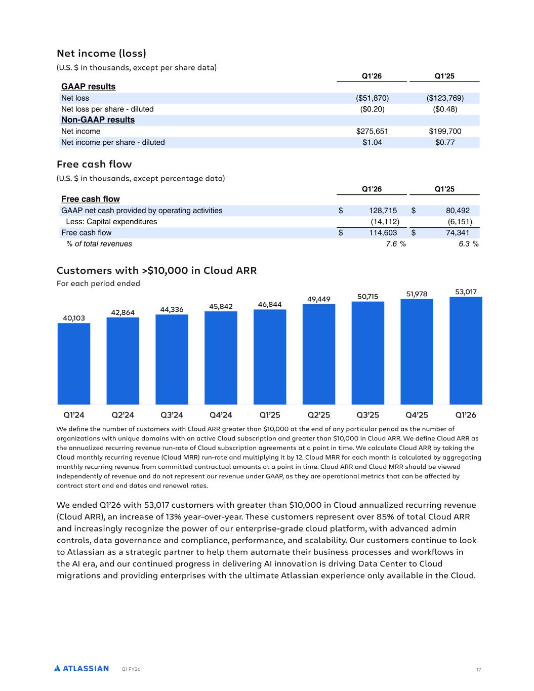 Q1 FY26 Net income (loss) (U.S. $ in thousands, except per share data) Free cash flow (U.S. $ in thousands, except percentage data) Customers with >$10,000 in Cloud ARR For each period ended We ended Q1’26 with 53,017 customers with greater than $10,000 in Cloud annualized recurring revenue (Cloud ARR), an increase of 13% year-over-year. These customers represent over 85% of total Cloud ARR and increasingly recognize the power of our enterprise-grade cloud platform, with advanced admin controls, data governance and compliance, performance, and scalability. Our customers continue to look to Atlassian as a strategic partner to help them automate their business processes and workflows in the AI era, and our continued progress in delivering AI innovation is driving Data Center to Cloud migrations and providing enterprises with the ultimate Atlassian experience only available in the Cloud. DLMN.OLN#LIAADM!F%%4#N1+!IG# G.PFL4O".%OCTACMPMCNOF"NC%"P" % % 0 6L#MOFNM 9CP,LOO .- ()-, 9CP,LOOMCNOF"NC$%G,4PC% %( % . 4I+0 6L#MOFNM 9CPG.AL-C (-, - 9CPG.AL-CMCNOF"NC$%G,4PC% % %-- DLMN.OLN#LIAADM!F%%L##,MCFIQ G.PFL4O".%OCTACMPMCNAC.P"EC % % L##!MCAFIQ 611.CPA"OFMNLRG%C%#8LMCN"PG.E"APGRGPGCO (.- . ( 7COO02"MGP",CTMC.%GP4NCO ( , 5NCCA"OFD,LS , ) - ) % . % , #MNLO!NOLD+B #P#L+!#+" 5NC#L#LGD+NDI+ #+#ADNM NI!E M#" ,IG-#+MNDI+ 2#M# ,I+MIFD"NDI+ INF 2LOPLDNCRC.4C (-- )( (),, ) ( COC"NAF".%%CRC,LM-C.P : : ( ( ( ( 8"N+CPG.E".%O",CO : : . . 6C.CN",".%"%-G.GOPN"PGRC : )-) ).) !LP", (-.. )( (,)- ,-. DLMN.OLN#LIAADM!F%%4#N1+!IG# G.PFL4O".%OCTACMPMCNOF"NC%"P" % % 0 6L#MOFNM 9CP,LOO .- ()-, 9CP,LOOMCNOF"NC$%G,4PC% %( % . 4I+0 6L#MOFNM 9CPG.AL-C (-, - 9CPG.AL-CMCNOF"NC$%G,4PC% % %-- DLMN.OLN#LIAADM!F%%L##,MCFIQ G.PFL4O".%OCTACMPMCNAC.P"EC % % L##!MCAFIQ 611.CPA"OFMNLRG%C%#8LMCN"PG.E"APGRGPGCO (.- . ( 7COO02"MGP",CTMC.%GP4NCO ( , 5NCCA"OFD,LS , ) - ) 252503.7.16.4 ) ) #MNLO!NOLD+B #P#L+!#+" 5NC#L#LGD+NDI+ #+#ADNM NI!E M#" ,IG-#+MNDI+ 2#M# ,I+MIFD"NDI+ INF 2LOPLDNCRC.4C (-- )( (),, ) ( COC"NAF".%%CRC,LM-C.P : : ( ( ( ( 8"N+CPG.E".%O",CO . . 6C.CN",".%"%-G.GOPN"PGRC )-) ).) !LP", (-.. )( (,)- ,-. 17 We define the number of customers with Cloud ARR greater than $10,000 at the end of any particular period as the number of organizations with unique domains with an active Cloud subscription and greater than $10,000 in Cloud ARR. We define Cloud ARR as the annualized recurring revenue run-rate of Cloud subscription agreements at a point in time. We calculate Cloud ARR by taking the Cloud monthly recurring revenue (Cloud MRR) run-rate and multiplying it by 12. Cloud MRR for each month is calculated by aggregating monthly recurring revenue from committed contractual amounts at a point in time. Cloud ARR and Cloud MRR should be viewed independently of revenue and do not represent our revenue under GAAP, as they are operational metrics that can be affected by contract start and end dates and renewal rates.