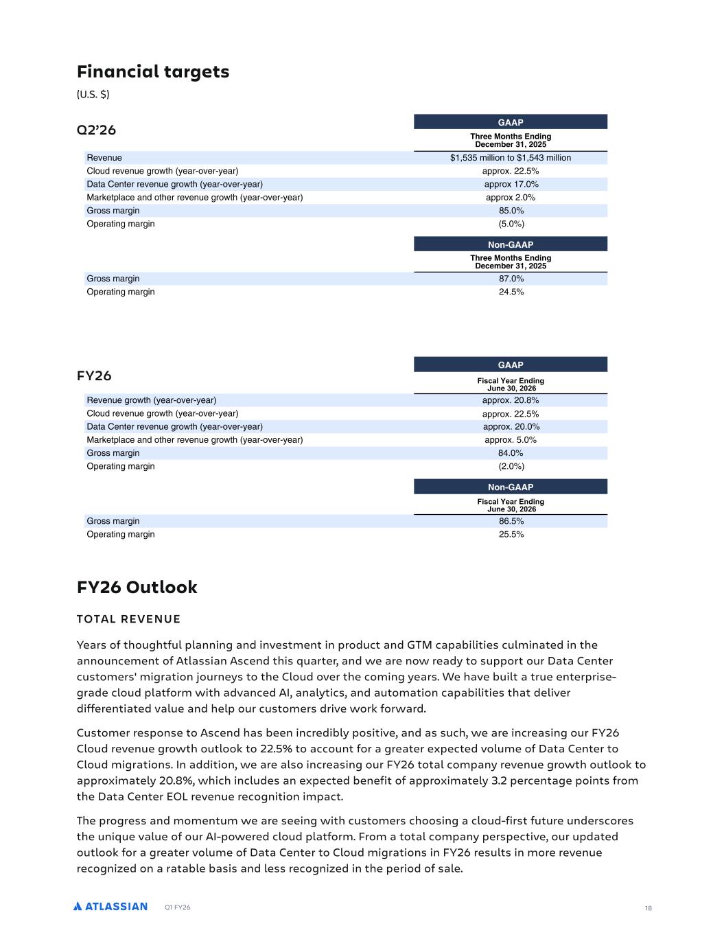 Q1 FY26 Financial targets (U.S. $) Q2’26 FY26 FY26 Outlook TOTAL REVENUE Years of thoughtful planning and investment in product and GTM capabilities culminated in the announcement of Atlassian Ascend this quarter, and we are now ready to support our Data Center customers' migration journeys to the Cloud over the coming years. We have built a true enterprise- grade cloud platform with advanced AI, analytics, and automation capabilities that deliver differentiated value and help our customers drive work forward. Customer response to Ascend has been incredibly positive, and as such, we are increasing our FY26 Cloud revenue growth outlook to 22.5% to account for a greater expected volume of Data Center to Cloud migrations. In addition, we are also increasing our FY26 total company revenue growth outlook to approximately 20.8%, which includes an expected benefit of approximately 3.2 percentage points from the Data Center EOL revenue recognition impact. The progress and momentum we are seeing with customers choosing a cloud-first future underscores the unique value of our AI-powered cloud platform. From a total company perspective, our updated outlook for a greater volume of Data Center to Cloud migrations in FY26 results in more revenue recognized on a ratable basis and less recognized in the period of sale. D++!DFLB#NM 0 6 T CL##3I+NCM+"D+B -#!#G #L %% CRC.4C )-G,,GL.PL )-G,,GL. 2,L4%NCRC.4CENLSPF8C"N$LRCN$8C"N "MMNLT%((% 3"P"2C.PCNNCRC.4CENLSPF8C"N$LRCN$8C"N "MMNLT -% 8"N+CPM,"AC".%LPFCNNCRC.4CENLSPF8C"N$LRCN$8C"N "MMNLT(% 6NLOO-"NEG. .% :MCN"PG.E-"NEG. % 4I+0 6 T CL##3I+NCM+"D+B -#!#G #L %% 6NLOO-"NEG. .-% :MCN"PG.E-"NEG. ( % 0 6 T 5.TECMBGCS4OF.O, 79OG) ( (, CRC.4CENLSPF8C"N$LRCN$8C"N "MMNLT%( %. 2,L4%NCRC.4CENLSPF8C"N$LRCN$8C"N B44SP<%((% 3"P"2C.PCNNCRC.4CENLSPF8C"N$LRCN$8C"N "MMNLT%( % 8"N+CPM,"AC".%LPFCNNCRC.4CENLSPF8C"N$LRCN$8C"N "MMNLT%% 6NLOO-"NEG. . % :MCN"PG.E-"NEG. (% 4I+0 6 5.TECMBGCS4OF.O, 79OG) ( (, 6NLOO-"NEG. .,% :MCN"PG.E-"NEG. (% ( D++!DFLB#NM 0 6 T CL##3I+NCM+"D+B -#!#G #L %% CRC.4C )-G,,GL.PL )-G,,GL. 2,L4%NCRC.4CENLSPF8C"N$LRCN$8C"N "MMNLT%((% 3"P"2C.PCNNCRC.4CENLSPF8C"N$LRCN$8C"N "MMNLT -% 8"N+CPM,"AC".%LPFCNNCRC.4CENLSPF8C"N$LRCN$8C"N "MMNLT(% 6NLOO-"NEG. .% :MCN"PG.E-"NEG. % 4I+0 6 T CL##3I+NCM+"D+B -#!#G #L %% 6NLOO-"NEG. .-% :MCN"PG.E-"NEG. ( % 0 6 T 5.TECMBGCS4OF.O, 79OG) ( (, CRC.4CENLSPF8C"N$LRCN$8C"N "MMNLT%( %. 2,L4%NCRC.4CENLSPF8C"N$LRCN$8C"N B44SP<%((% 3"P"2C.PCNNCRC.4CENLSPF8C"N$LRCN$8C"N "MMNLT% % 8"N+CPM,"AC".%LPFCNNCRC.4CENLSPF8C"N$LRCN$8C"N "MMNLT%% 6NLOO-"NEG. . % :MCN"PG.E-"NEG. (% 4I+0 6 5.TECMBGCS4OF.O, 79OG) ( (, 6NLOO-"NEG. .,% :MCN"PG.E-"NEG. (% ( 18