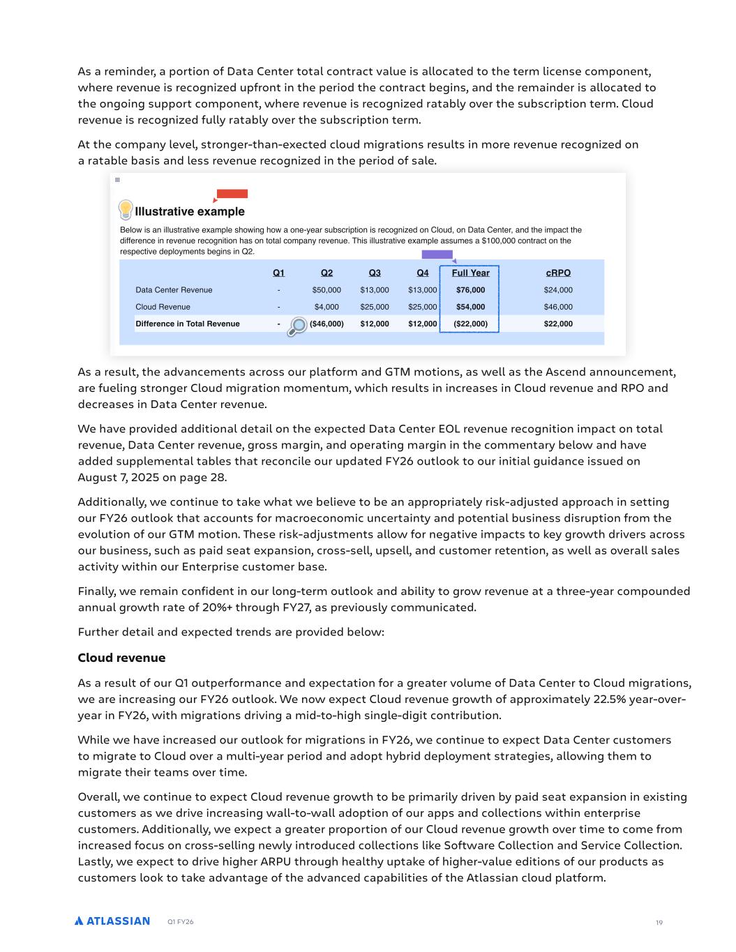 Q1 FY26 As a reminder, a portion of Data Center total contract value is allocated to the term license component, where revenue is recognized upfront in the period the contract begins, and the remainder is allocated to the ongoing support component, where revenue is recognized ratably over the subscription term. Cloud revenue is recognized fully ratably over the subscription term. At the company level, stronger-than-exected cloud migrations results in more revenue recognized on a ratable basis and less revenue recognized in the period of sale. As a result, the advancements across our platform and GTM motions, as well as the Ascend announcement, are fueling stronger Cloud migration momentum, which results in increases in Cloud revenue and RPO and decreases in Data Center revenue. We have provided additional detail on the expected Data Center EOL revenue recognition impact on total revenue, Data Center revenue, gross margin, and operating margin in the commentary below and have added supplemental tables that reconcile our updated FY26 outlook to our initial guidance issued on August 7, 2025 on page 28. Additionally, we continue to take what we believe to be an appropriately risk-adjusted approach in setting our FY26 outlook that accounts for macroeconomic uncertainty and potential business disruption from the evolution of our GTM motion. These risk-adjustments allow for negative impacts to key growth drivers across our business, such as paid seat expansion, cross-sell, upsell, and customer retention, as well as overall sales activity within our Enterprise customer base. Finally, we remain confident in our long-term outlook and ability to grow revenue at a three-year compounded annual growth rate of 20%+ through FY27, as previously communicated. Further detail and expected trends are provided below: Cloud revenue As a result of our Q1 outperformance and expectation for a greater volume of Data Center to Cloud migrations, we are increasing our FY26 outlook. We now expect Cloud revenue growth of approximately 22.5% year-over- year in FY26, with migrations driving a mid-to-high single-digit contribution. While we have increased our outlook for migrations in FY26, we continue to expect Data Center customers to migrate to Cloud over a multi-year period and adopt hybrid deployment strategies, allowing them to migrate their teams over time. Overall, we continue to expect Cloud revenue growth to be primarily driven by paid seat expansion in existing customers as we drive increasing wall-to-wall adoption of our apps and collections within enterprise customers. Additionally, we expect a greater proportion of our Cloud revenue growth over time to come from increased focus on cross-selling newly introduced collections like Software Collection and Service Collection. Lastly, we expect to drive higher ARPU through healthy uptake of higher-value editions of our products as customers look to take advantage of the advanced capabilities of the Atlassian cloud platform. 19 Illustrative example Below is an illustrative example showing how a one-year subscription is recognized on Cloud, on Data Center, and the impact the difference in revenue recognition has on total company revenue. This illustrative example assumes a $100,000 contract on the respective deployments begins in Q2. Q1 Q2 Q3 Q4 Full Year cRPO Data Center Revenue - $50,000 $13,000 $13,000 $76,000 $24,000 Cloud Revenue - $4,000 $25,000 $25,000 $54,000 $46,000 Difference in Total Revenue - ($46,000) $12,000 $12,000 ($22,000) $22,000