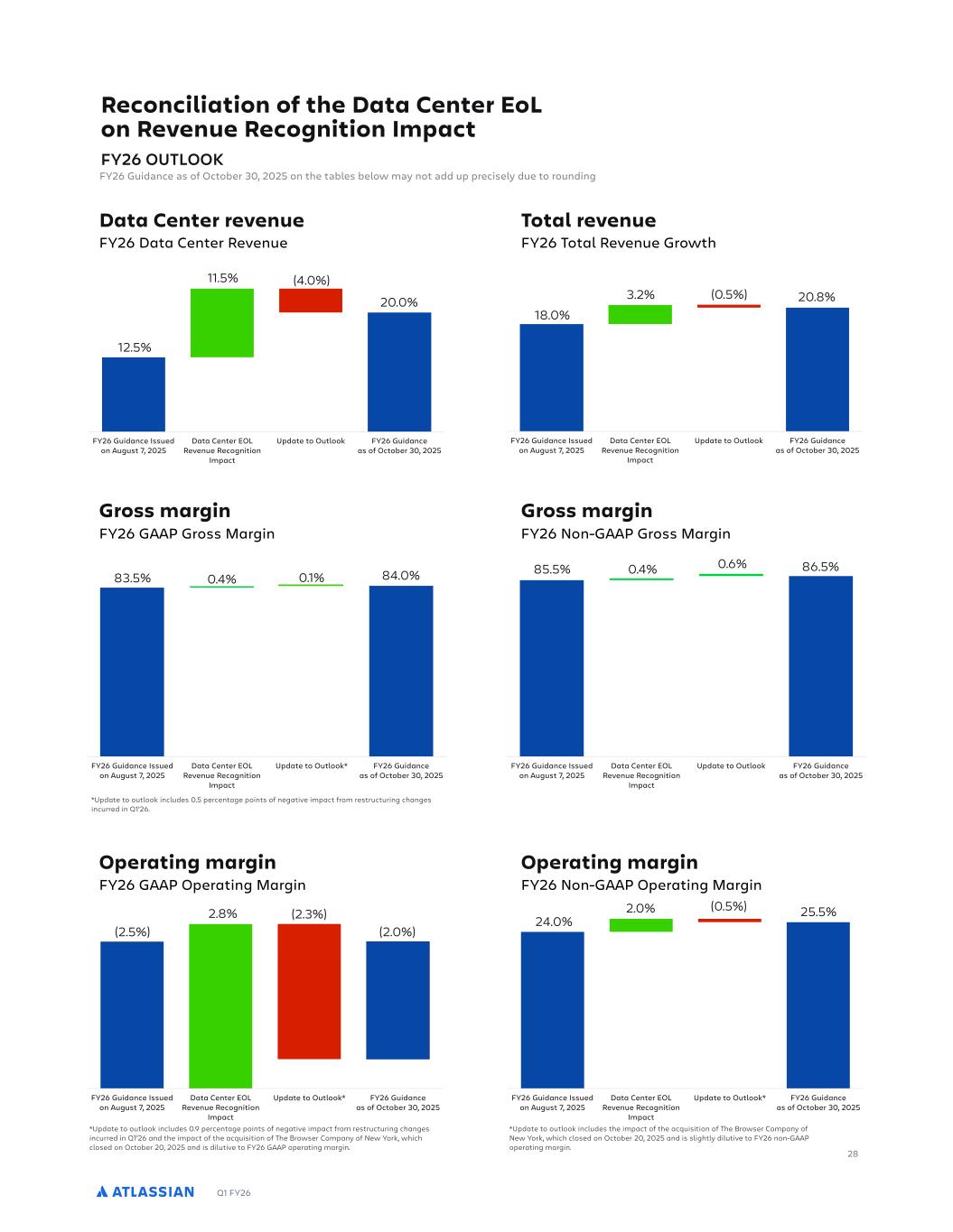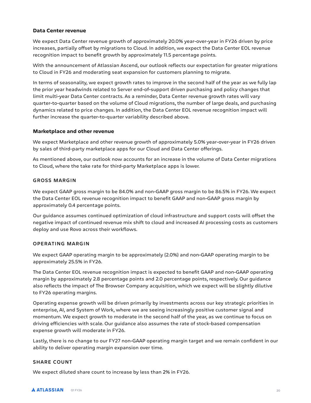 Q1 FY26 Data Center revenue We expect Data Center revenue growth of approximately 20.0% year-over-year in FY26 driven by price increases, partially offset by migrations to Cloud. In addition, we expect the Data Center EOL revenue recognition impact to benefit growth by approximately 11.5 percentage points. With the announcement of Atlassian Ascend, our outlook reflects our expectation for greater migrations to Cloud in FY26 and moderating seat expansion for customers planning to migrate. In terms of seasonality, we expect growth rates to improve in the second half of the year as we fully lap the prior year headwinds related to Server end-of-support driven purchasing and policy changes that limit multi-year Data Center contracts. As a reminder, Data Center revenue growth rates will vary quarter-to-quarter based on the volume of Cloud migrations, the number of large deals, and purchasing dynamics related to price changes. In addition, the Data Center EOL revenue recognition impact will further increase the quarter-to-quarter variability described above. Marketplace and other revenue We expect Marketplace and other revenue growth of approximately 5.0% year-over-year in FY26 driven by sales of third-party marketplace apps for our Cloud and Data Center offerings. As mentioned above, our outlook now accounts for an increase in the volume of Data Center migrations to Cloud, where the take rate for third-party Marketplace apps is lower. GROSS MARGIN We expect GAAP gross margin to be 84.0% and non-GAAP gross margin to be 86.5% in FY26. We expect the Data Center EOL revenue recognition impact to benefit GAAP and non-GAAP gross margin by approximately 0.4 percentage points. Our guidance assumes continued optimization of cloud infrastructure and support costs will offset the negative impact of continued revenue mix shift to cloud and increased AI processing costs as customers deploy and use Rovo across their workflows. OPERATING MARGIN We expect GAAP operating margin to be approximately (2.0%) and non-GAAP operating margin to be approximately 25.5% in FY26. The Data Center EOL revenue recognition impact is expected to benefit GAAP and non-GAAP operating margin by approximately 2.8 percentage points and 2.0 percentage points, respectively. Our guidance also reflects the impact of The Browser Company acquisition, which we expect will be slightly dilutive to FY26 operating margins. Operating expense growth will be driven primarily by investments across our key strategic priorities in enterprise, AI, and System of Work, where we are seeing increasingly positive customer signal and momentum. We expect growth to moderate in the second half of the year, as we continue to focus on driving efficiencies with scale. Our guidance also assumes the rate of stock-based compensation expense growth will moderate in FY26. Lastly, there is no change to our FY27 non-GAAP operating margin target and we remain confident in our ability to deliver operating margin expansion over time. SHARE COUNT We expect diluted share count to increase by less than 2% in FY26. 20
