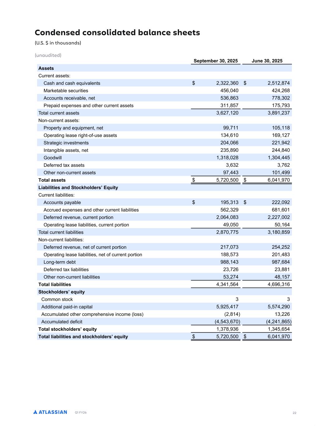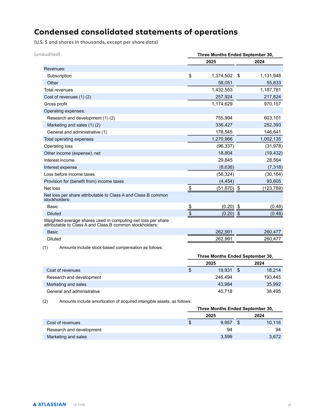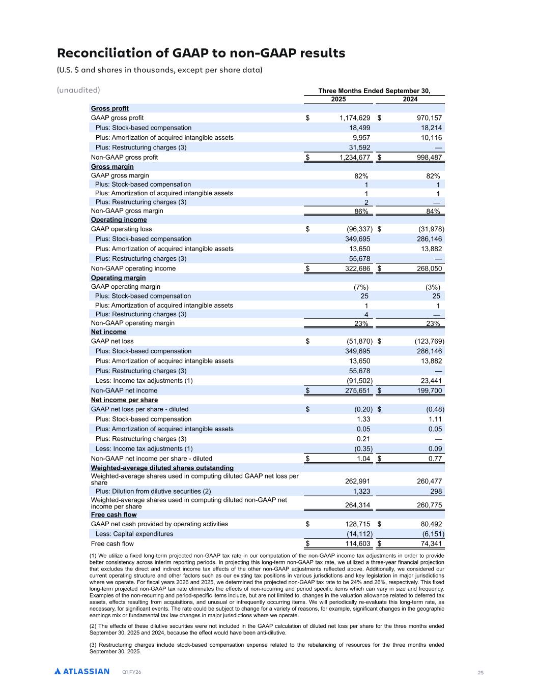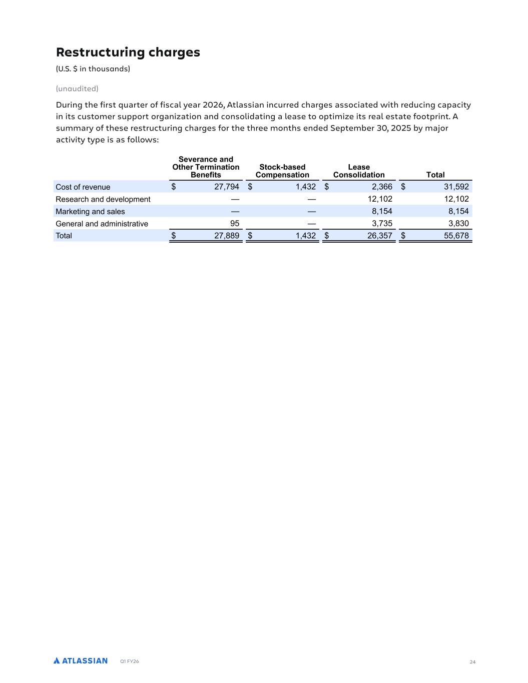 Q1 FY26 24 0UMCTT.CO2PS4PSCU.PO GWGO9GTD=3G4MP=NGOU4U.POT #%!%.OUJP9TCOFT 9OC9F.UGF "JSGGPOUJT4OFGF!G4UGNDGS) ( ( ( ( 3MP9E -- . -() , 4B8B3FO8FS )-(, . )) :BSLF84MBDFBOEP8IFS ,( - .. #P8BMSFWFO9FT )() .--. 8ODM9EFE-O:BSLF84MBDFBOEP8IFS-T4SFN-FST944PS8SFWFO9F% SFN-FST944PS8DPOT-T8TPGT9CTDS-48-PO$CBTFEBSSBO+FNFO8TGPSBI-+IFSMFWFM PG T944PS8 BDSPTT E-GGFSFO8 EF4MP=NFO8 P48-POT% SFN-FS T944PS8 -T SFDP+O->FE BT "9CTDS-48-PO SFWFO9F PO 8IF DPOEFOTFE DPOTPM-EB8FE T8B8FNFO8TPGP4FSB8-POTBT8IFTFSW-DFTBSFEFM-WFSFEPWFS8IF8FSNPG8IFBSSBO+FNFO8% GTUS9EU9S.O,2JCS,GT #%!%.OUJP9TCOFT 9OC9F.UGF 49S-O+ 8IF G-ST8 R9BS8FS PG G-TDBM =FBS ( (,18MBTT-BO -OD9SSFE DIBS+FT BTTPD-B8FE ;-8I SFE9D-O+ DB4BD-8= -O -8T D9T8PNFST944PS8PS+BO->B8-POBOEDPOTPM-EB8-O+B MFBTF 8PP48-N->F -8T SFBMFT8B8F GPP84S-O8%1T9NNBS=PG 8IFTF SFT8S9D89S-O+DIBS+FTGPS8IF8ISFFNPO8ITFOEFE"F48FNCFS) ( (C=NB.PSBD8-W-8=8=4F-TBTGPMMP;T0 !GWGSCOEGCOF UJGS"GSN.OCU.PO 1GOG+.UT !UPEL$DCTGF 2PN4GOTCU.PO 8GCTG 2POTPM.FCU.PO "PUCM 3PT8PGSFWFO9F (-- )( (),, ) ( !FTFBSDIBOEEFWFMP4NFO8 ? ? ( ( ( ( :BSLF8-O+BOETBMFT ? ? . . 7FOFSBMBOEBEN-O-T8SB8-WF ? )-) ).) #P8BM (-.. )( (,)- ,-. Restructuring charges (U.S. $ in thousands) (unaudited) During the first quarter of fiscal year 2026, Atlassian incurred charges associated with reducing capacity in its customer support organization and consolidating a lease to optimize its real estate footprint. A summary of these restructuring charges for the three months ended September 30, 2025 by major activity type is as follows: