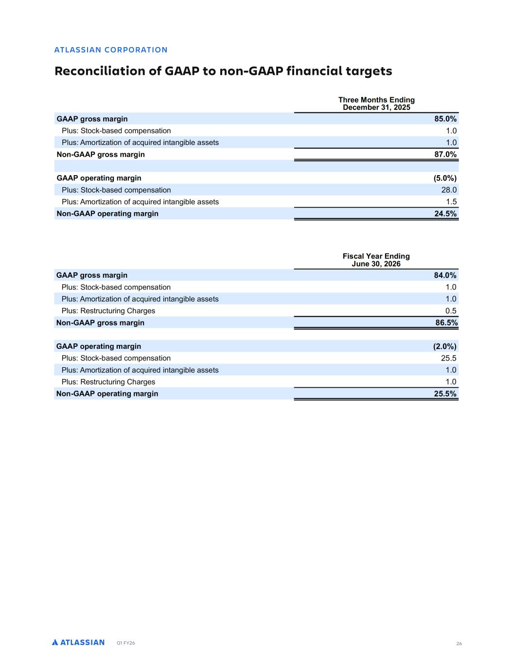 Q1 FY26 26 ATLASSIAN CORPORATION Reconciliation of GAAP to non-GAAP financial targets