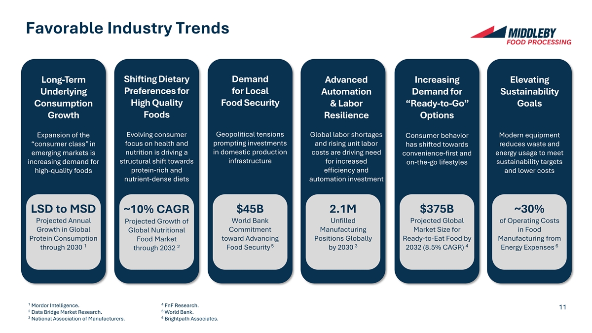 Favorable Industry Trends Shifting Dietary Demand Long-Term Advanced Increasing Elevating Preferences for for Local Underlying Automation Demand for Sustainability High Quality Food Security Consumption & Labor “Ready-to-Go” Goals Foods Growth Resilience Options Evolving consumer Geopolitical tensions Global labor shortages Expansion of the Modern equipment Consumer behavior prompting investments “consumer class” in focus on health and and rising unit labor reduces waste and has shifted towards in domestic production nutrition is driving a costs are driving need emerging markets is convenience-first and energy usage to meet structural shift towards infrastructure for increased increasing demand for sustainability targets on-the-go lifestyles protein-rich and efficiency and high-quality foods and lower costs nutrient-dense diets automation investment LSD to MSD $45B 2.1M $375B ~30% ~10% CAGR Projected Annual World Bank Unfilled Projected Global of Operating Costs Projected Growth of Growth in Global Commitment Manufacturing Market Size for in Food Global Nutritional Protein Consumption toward Advancing Positions Globally Ready-to-Eat Food by Manufacturing from Food Market 1 5 3 4 6 2 through 2030 Food Security by 2030 2032 (8.5% CAGR) Energy Expenses through 2032 1 4 Mordor Intelligence. FnF Research. 11 2 5 Data Bridge Market Research. World Bank. 3 6 National Association of Manufacturers. Brightpath Associates.