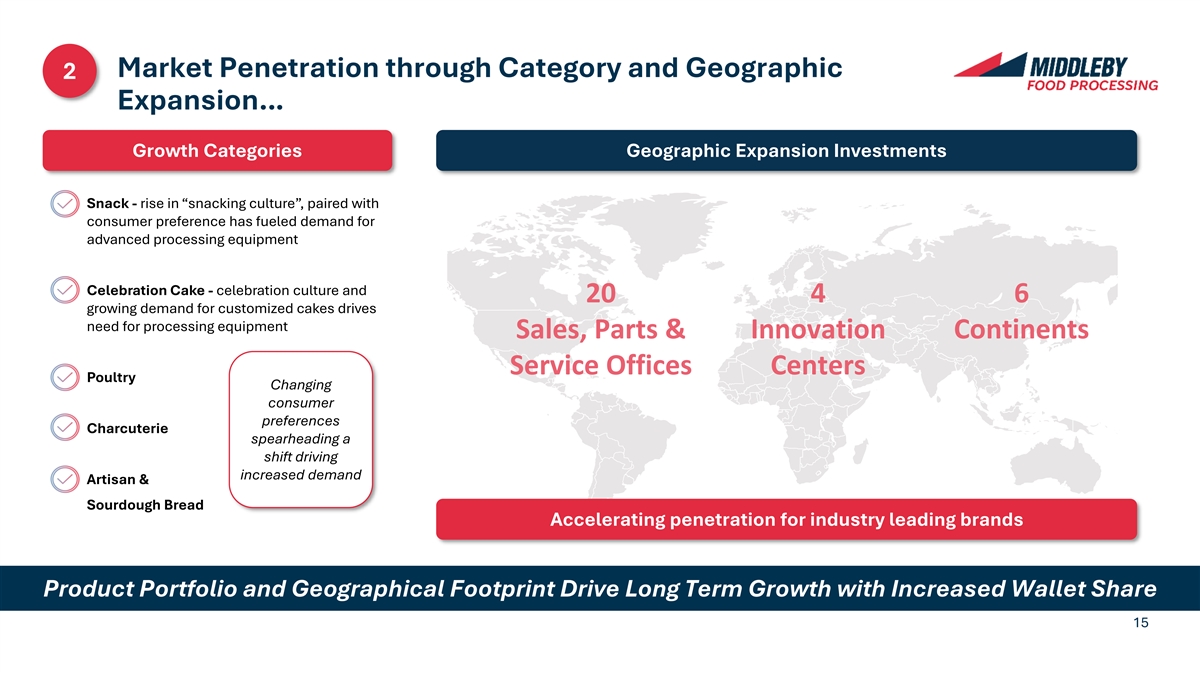 …Driving Significant ROI for Customers 1 Illustrative Full-Line Solution offering, combining the power of 7 acquired brands, offers a customer ~$4.4m Net Savings / Year and <2-year payback period Headline Savings In Practice – Pre-Cooked Bacon Full-Line Solution Middleby Food Processing is focused on Illustrative Full-Line Solution Purchase Price (~7 brands) ~$8m delivery highest quality products, generating a significant ROI for ~7 Operatives (2 shifts, $60K Salary) ~$0.8m customers Package Cost Savings ~$0.3m Approach is to offer best-in-class grouping to offer the lowest cost of Maintenance Savings ~$0.1m ownership Yield Improvement from Slicer ~$1.5m Labor, packaging, and maintenance savings – coupled with yield Yield Improvement from Cooker / Chiller / Sheeter ~$1.6m improvements from superior technology / integration – contributes to leading 1 Annual Savings ~$4.4m p.a. value proposition Strong Value to Customer Drives Quality Growth 14 1 May not foot due to rounding